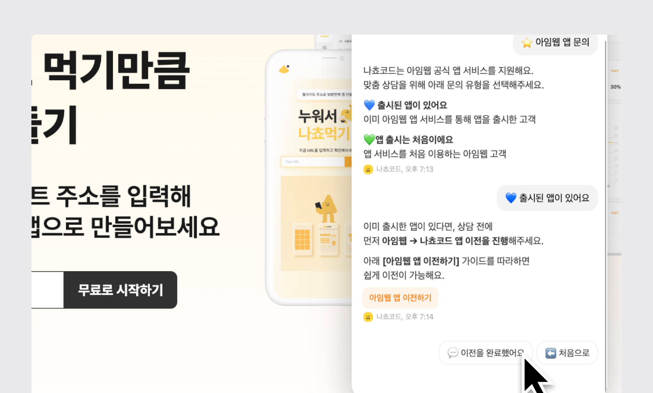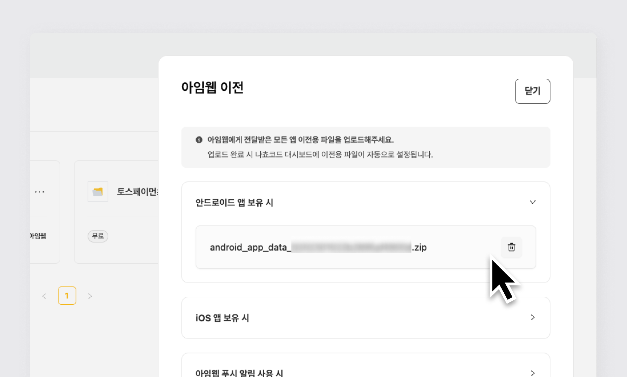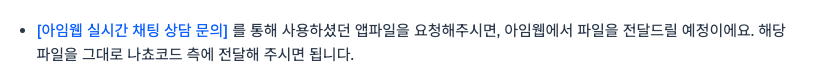 먼저 아임웹에게 실시간 채팅 상담으로 기존 앱 파일을 요청해주세요.