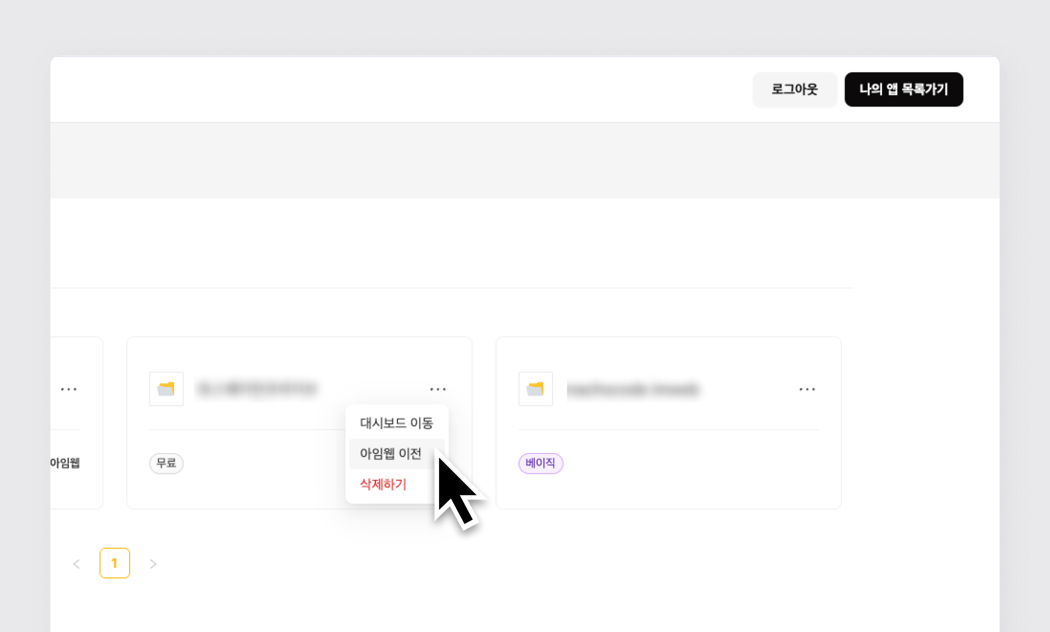 1단계) 나의 앱 목록가기 > 이전 앱 [...] 클릭 > [아임웹 이전] 클릭
