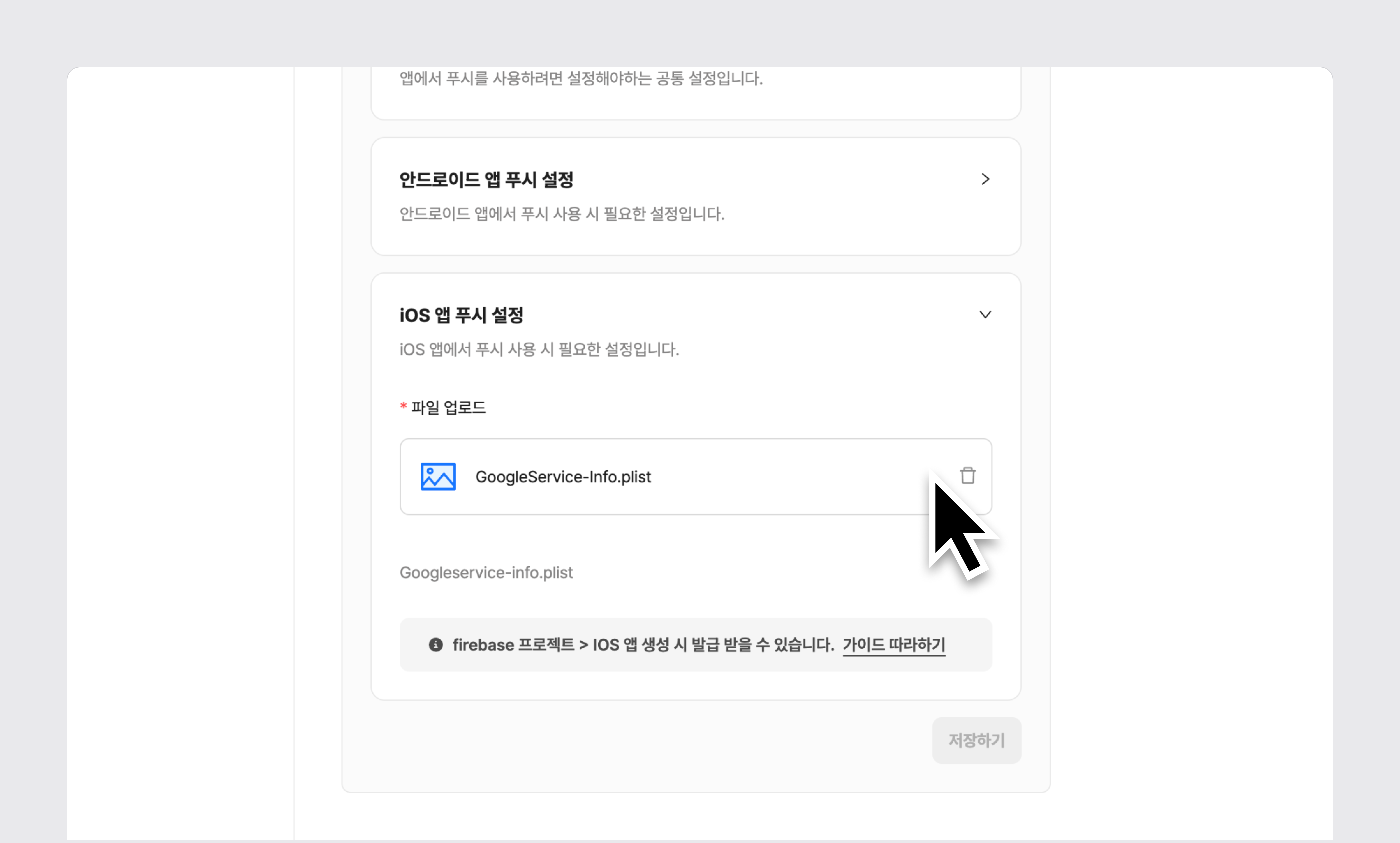 1단계) 대시보드 > 앱 기능 > 푸시 알림 > 설정 > iOS 앱 푸시 설정 > 파일 없음 확인