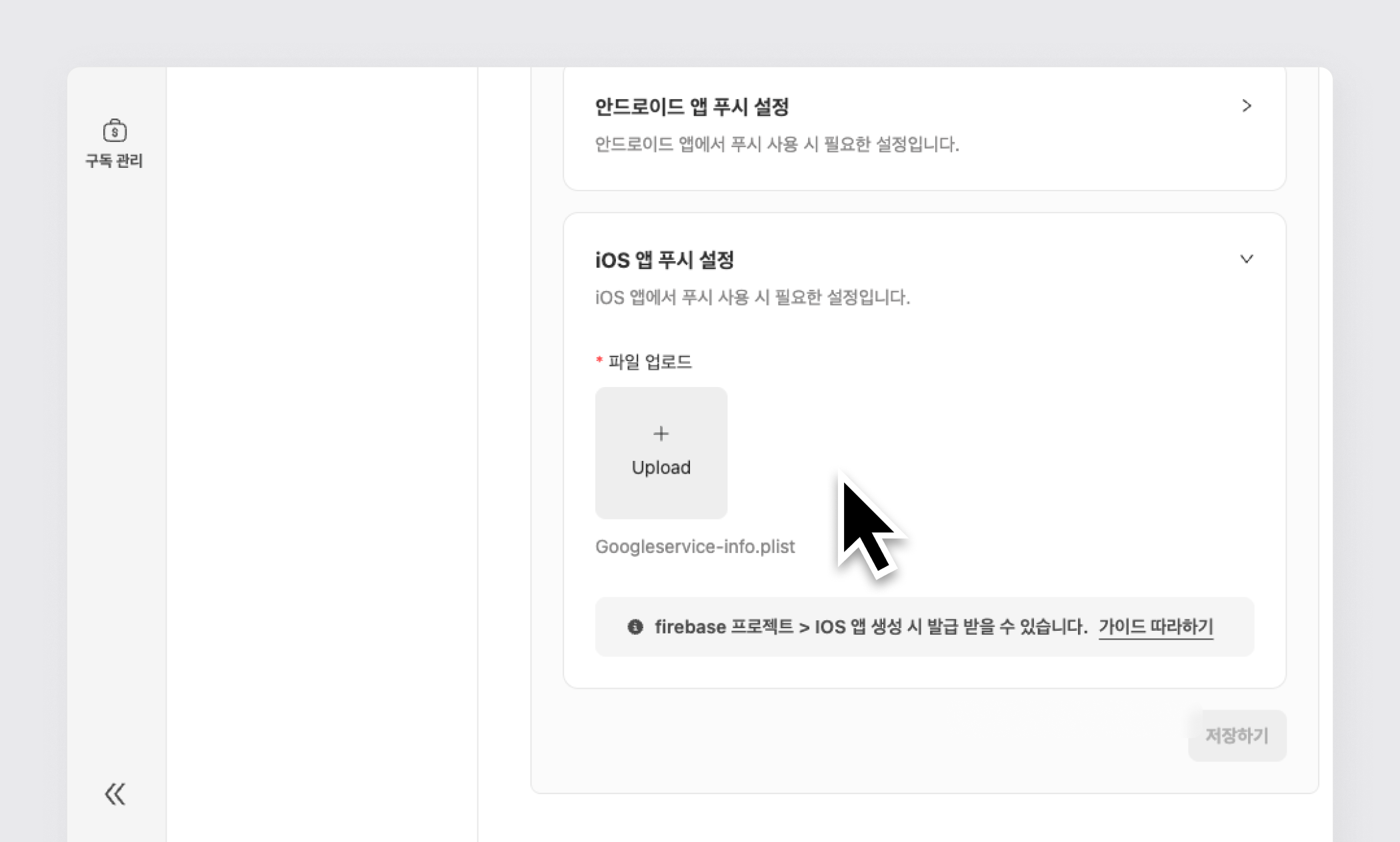 4단계) 앱 기능 > 푸시 알림 > 설정 > iOS 앱 푸시 설정 > 업로드 > 저장하기