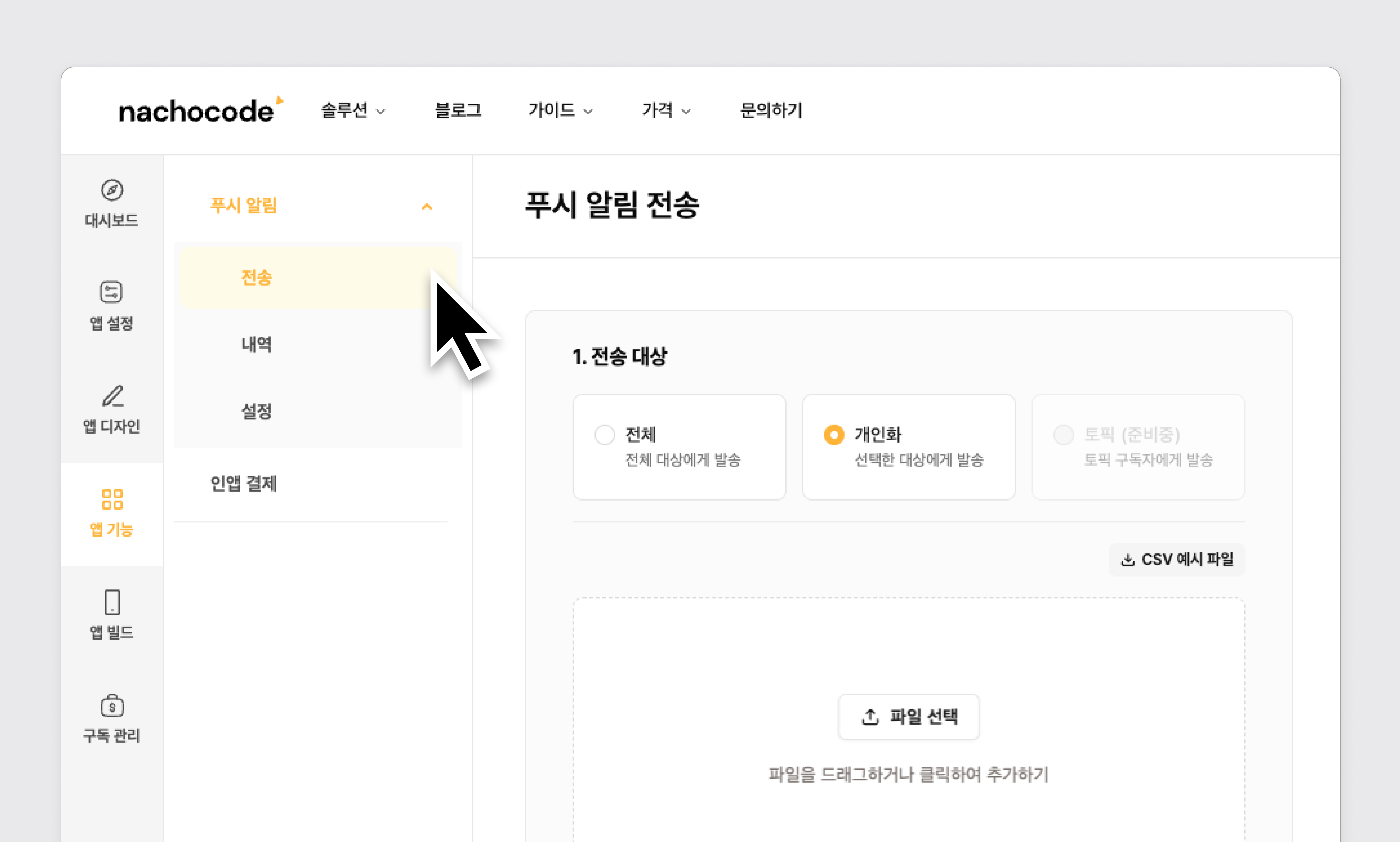 1단계) 앱 기능 > 푸시 알림 > 전송 탭 클릭