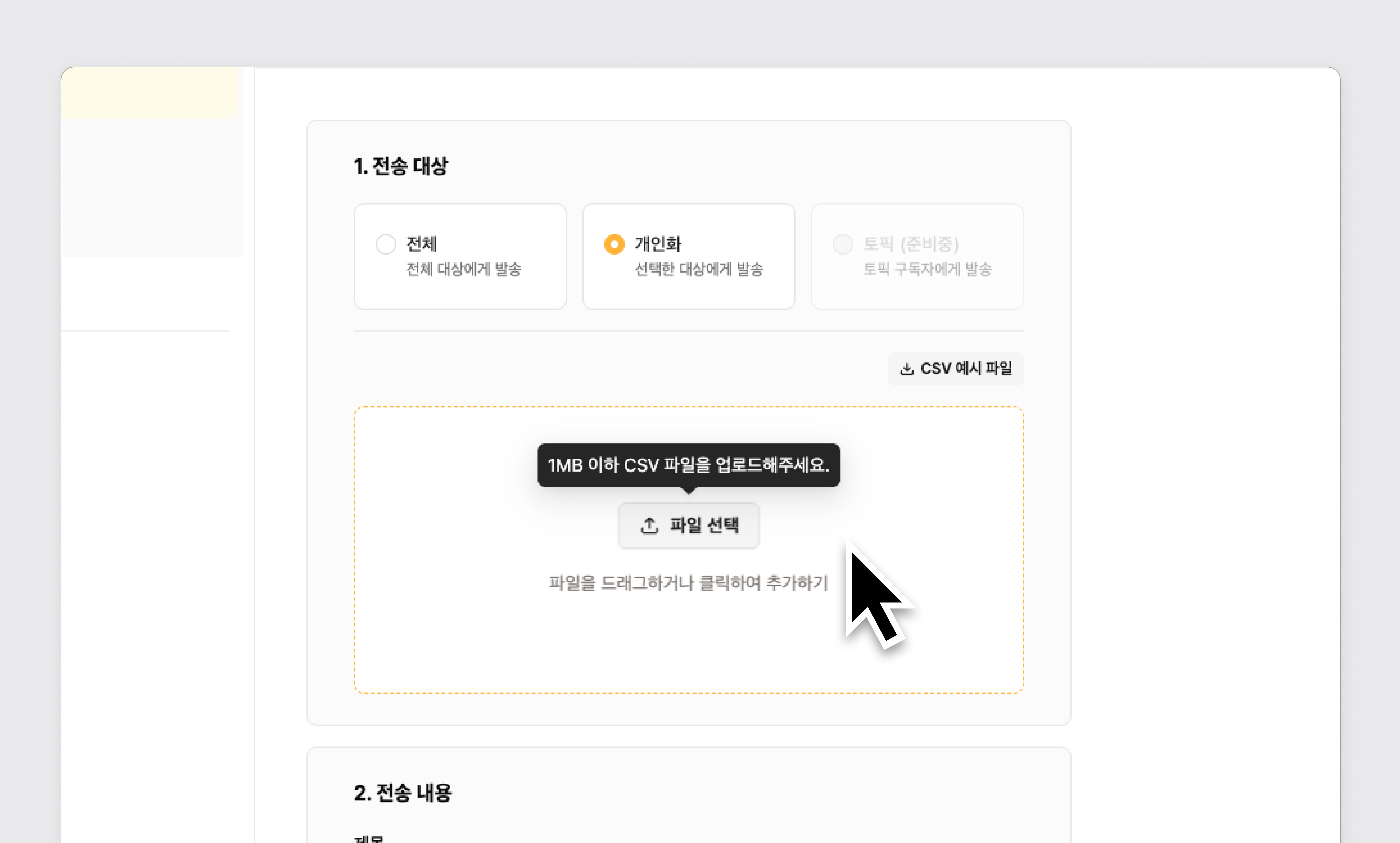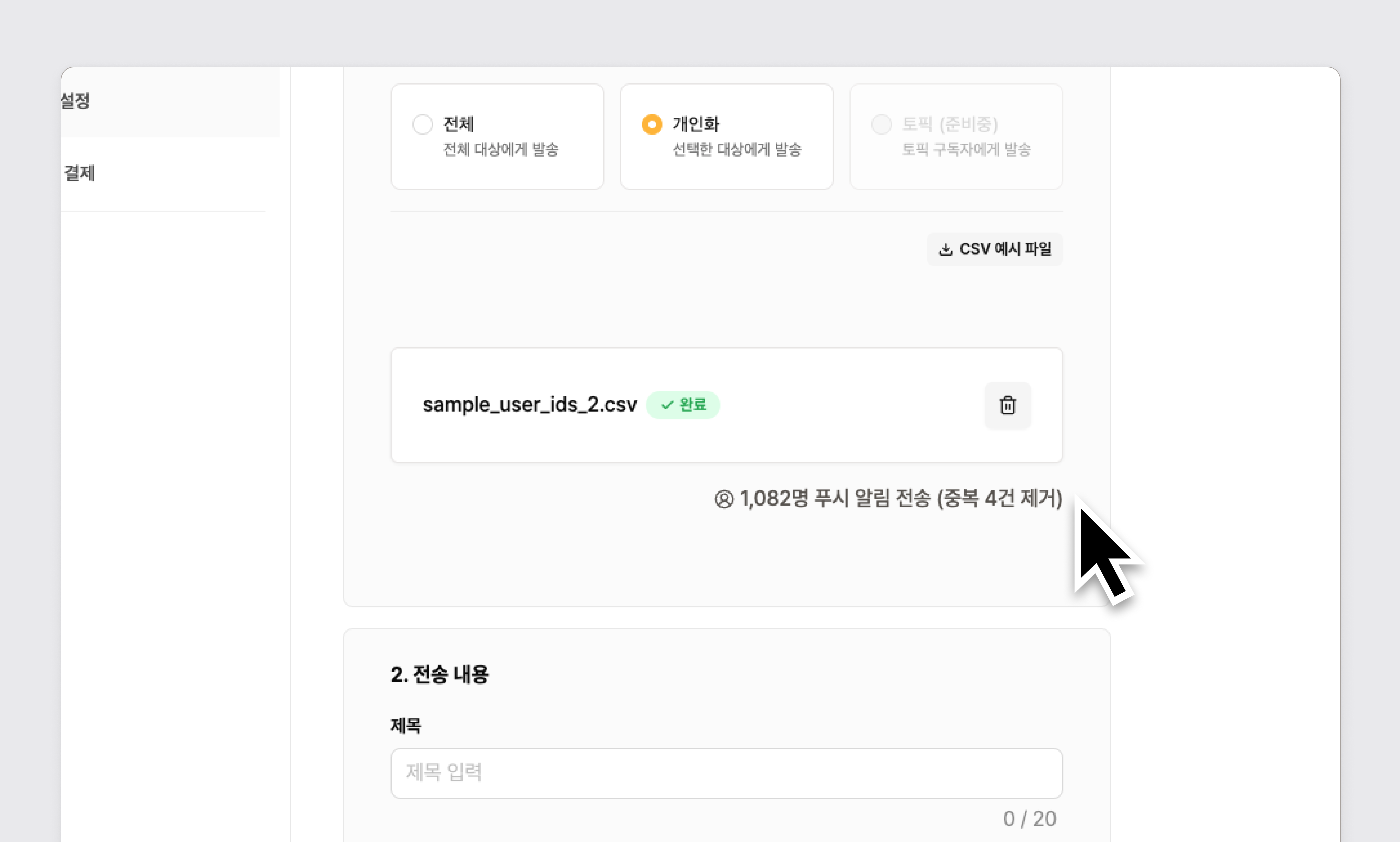 운영자가 CSV(userId) 파일을 업로드해 직접 발송