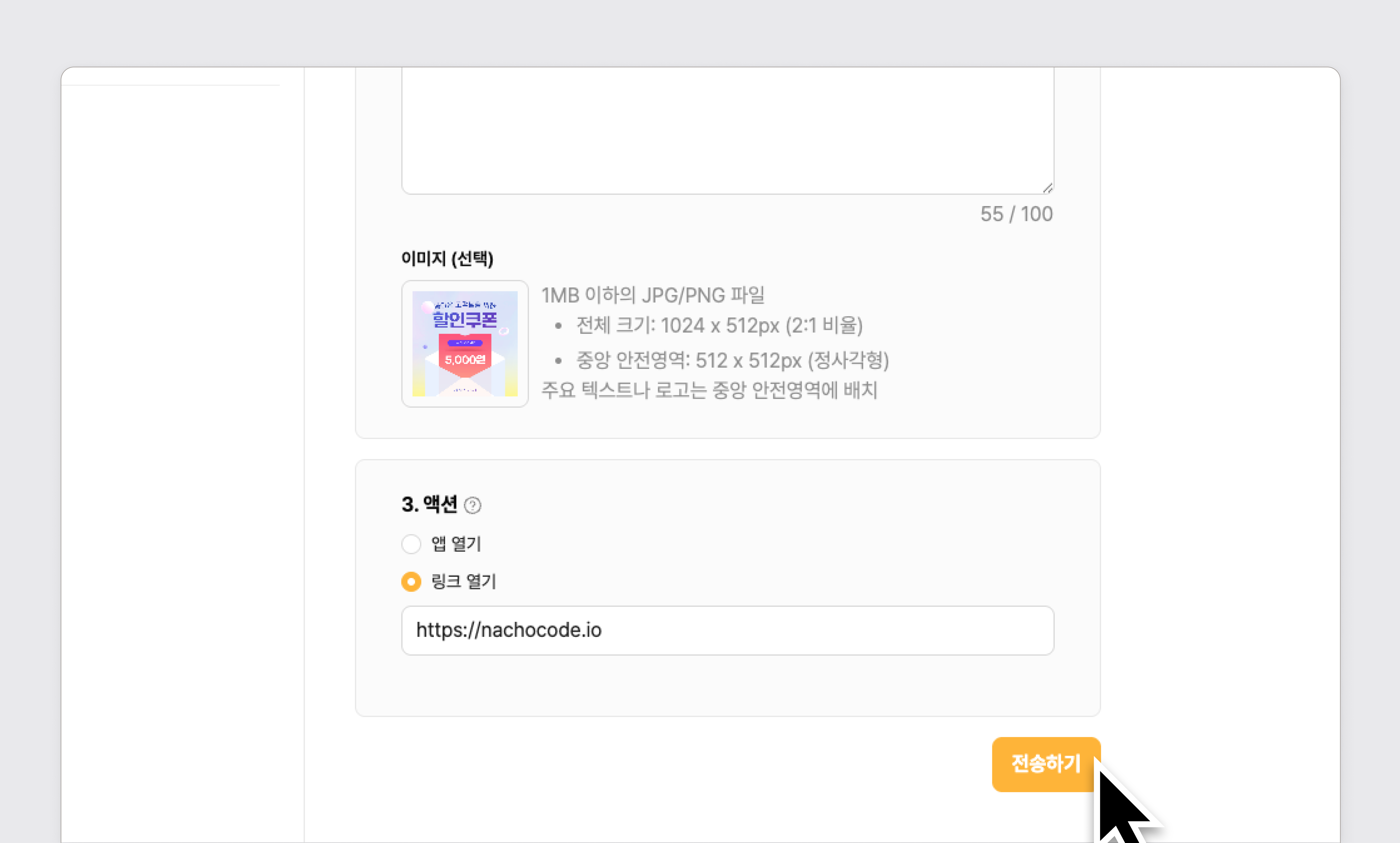 10단계) 전송하기 버튼 클릭 > 개인화 푸시 전송 완료
