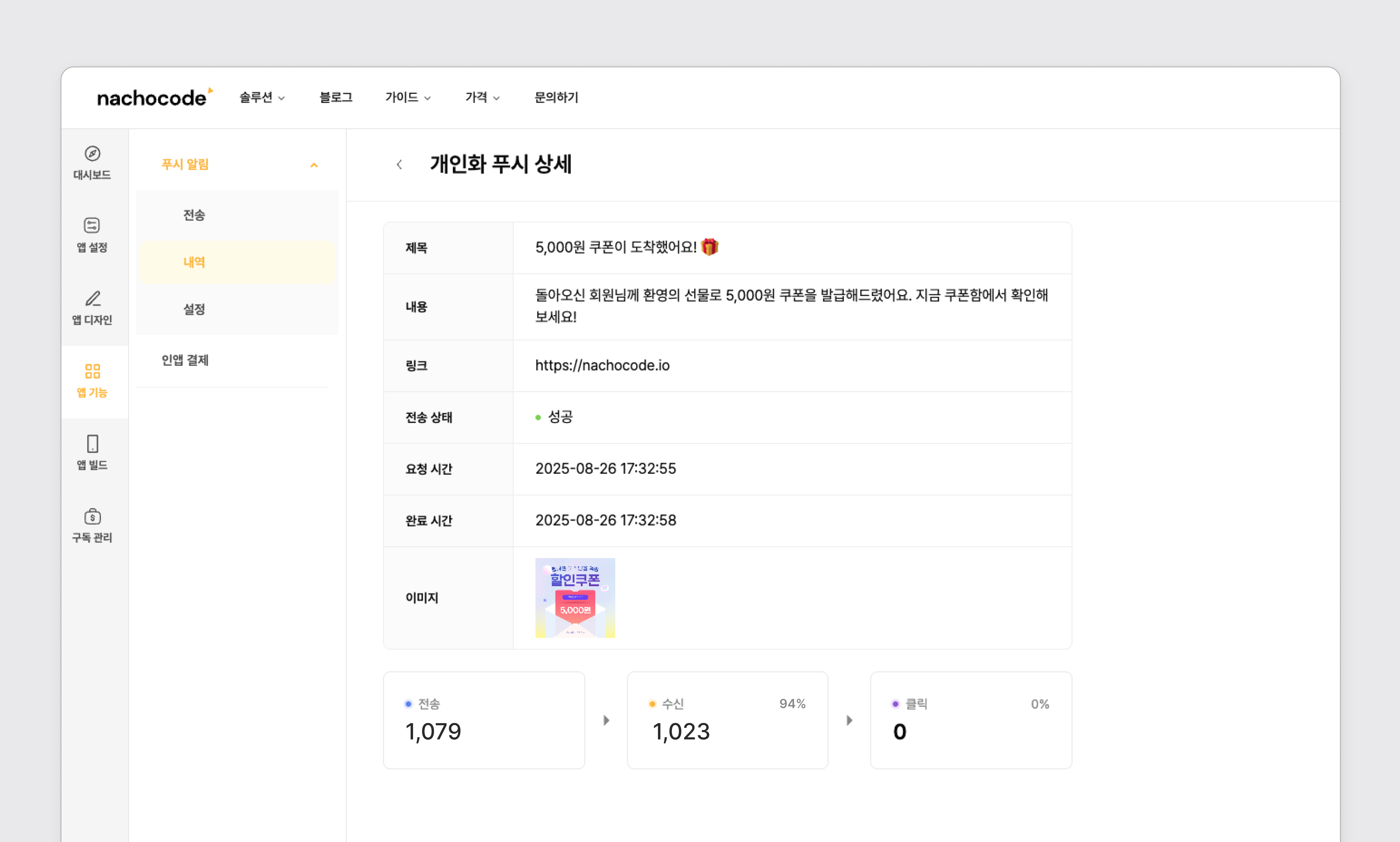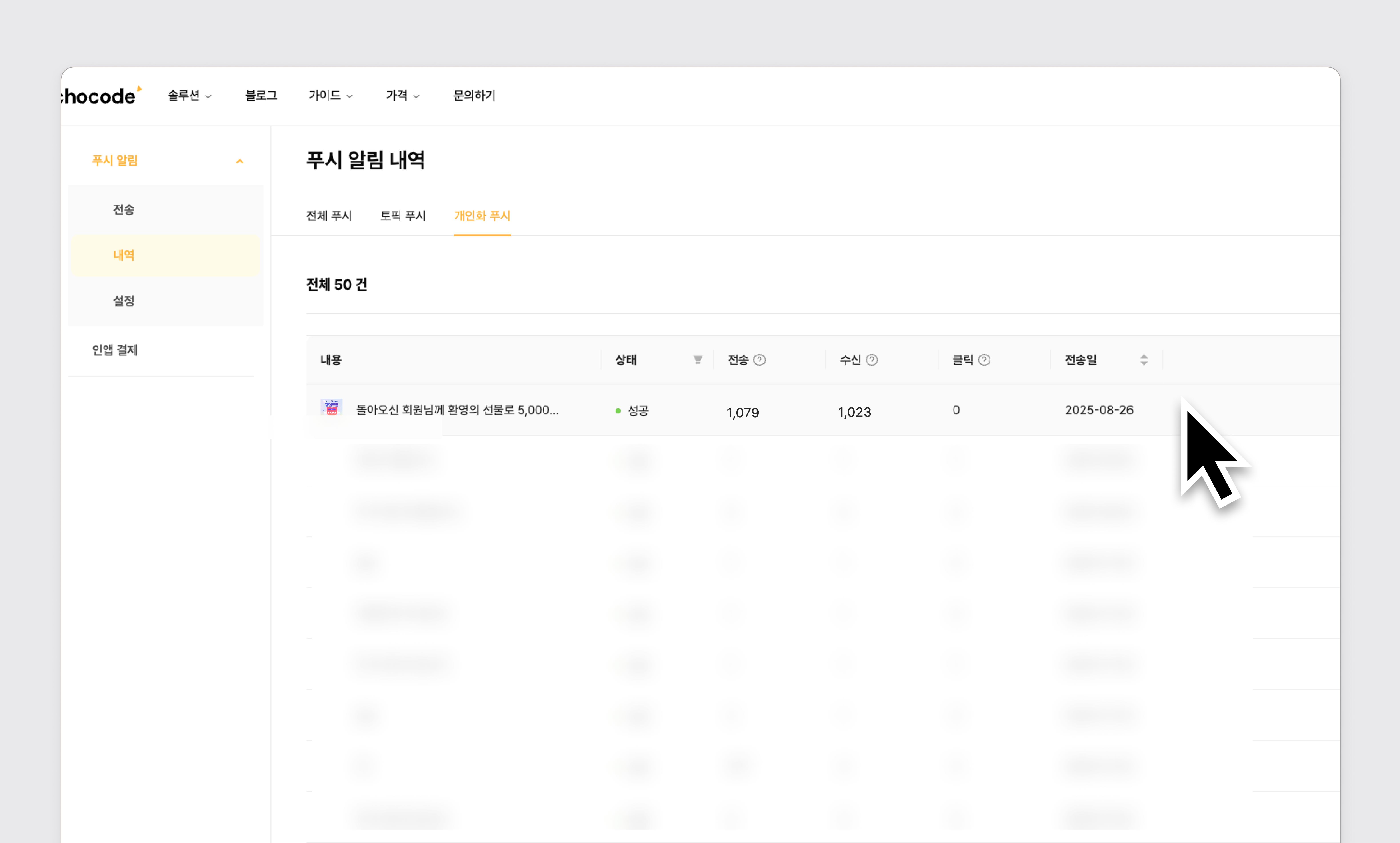 1단계) 앱 기능 > 푸시 알림 > 내역 >개인화 푸시 클릭