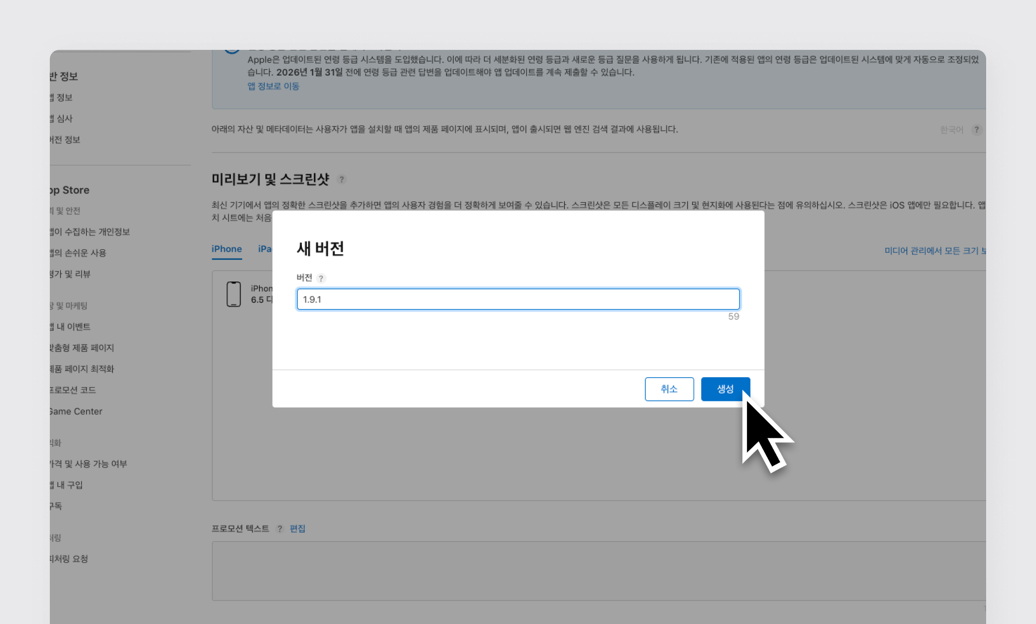 3단계) 새 버전 입력 > [생성] 클릭