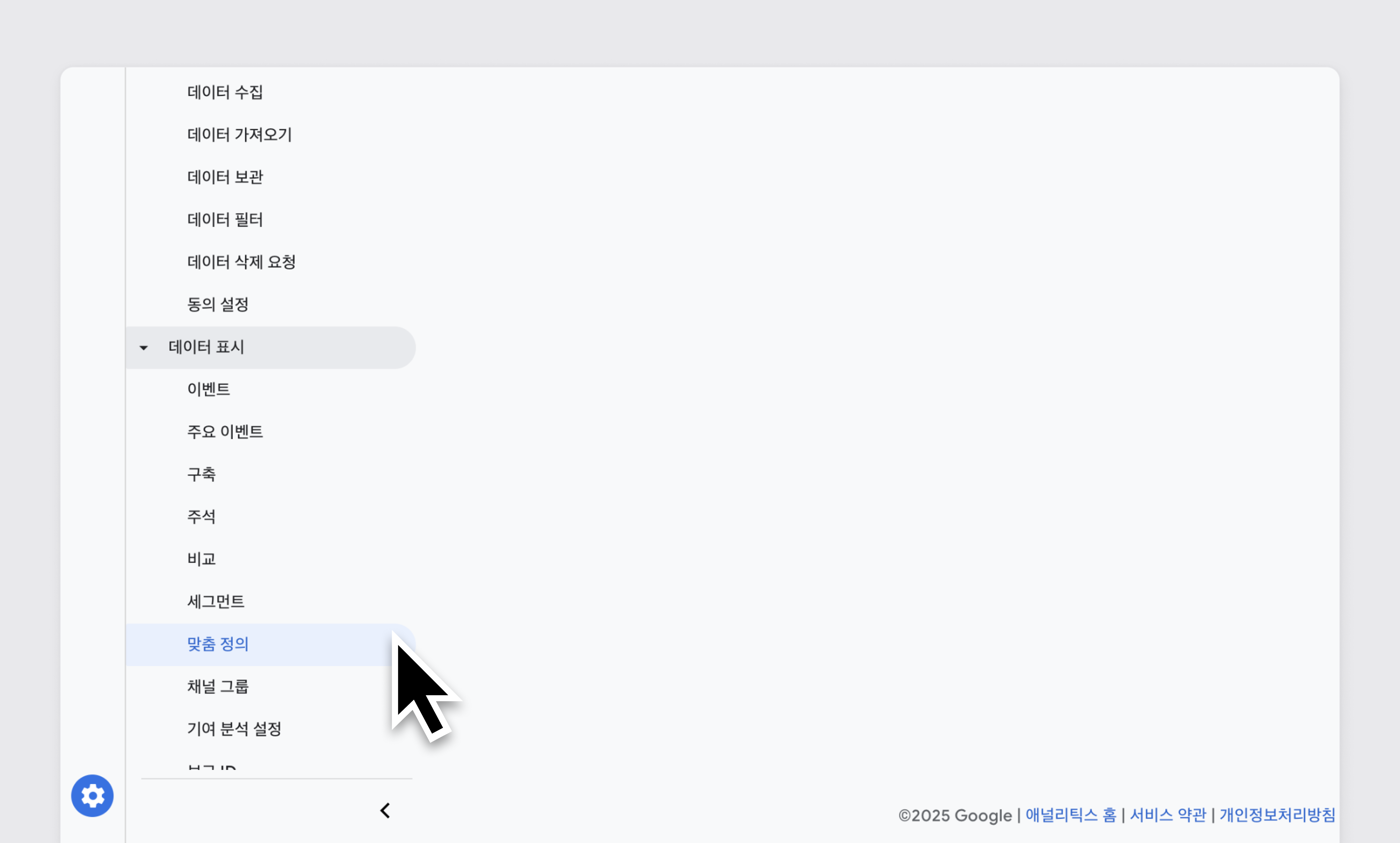 1단계) GA4 > 설정 > 데이터 표시 > 맞춤정의 클릭