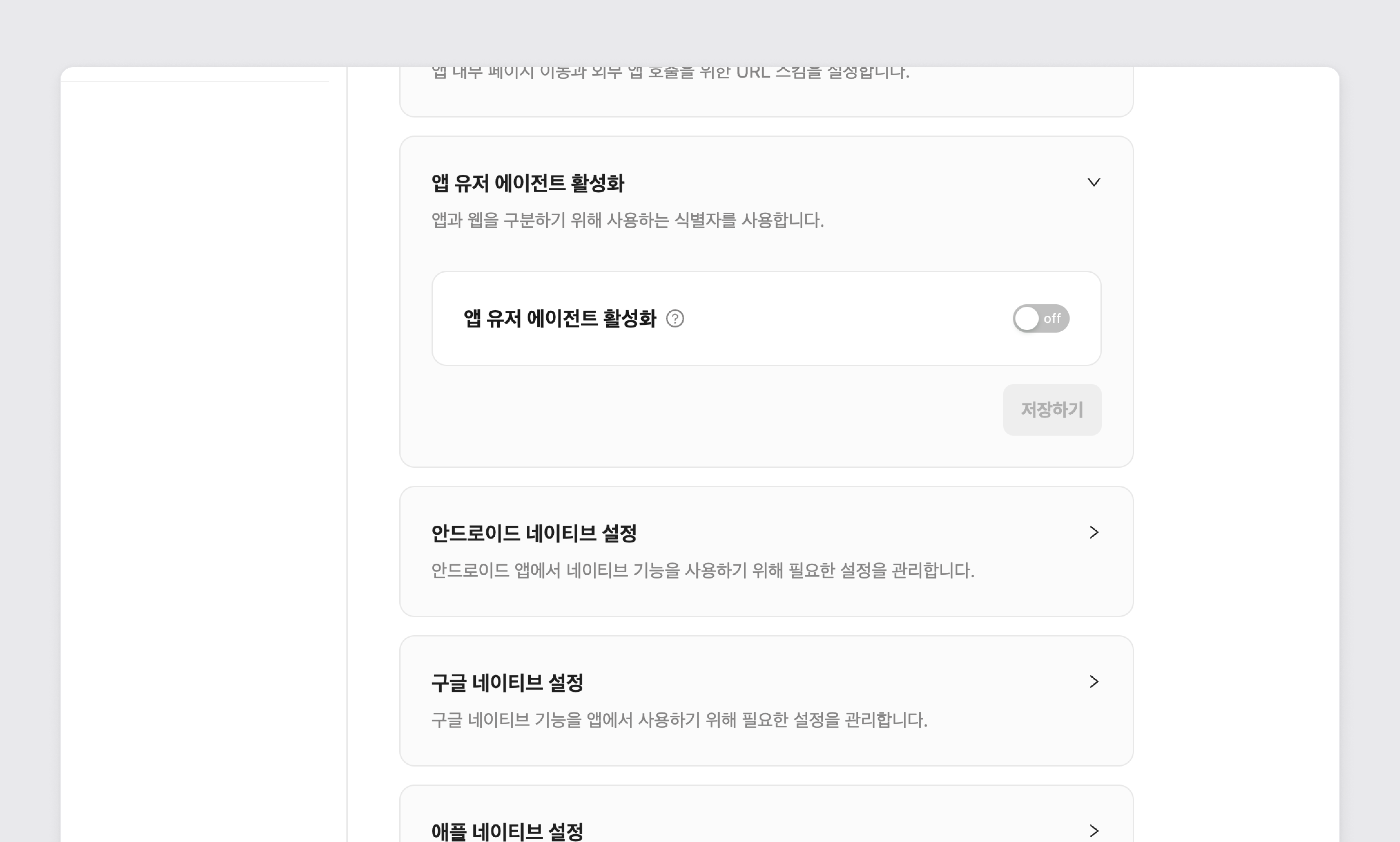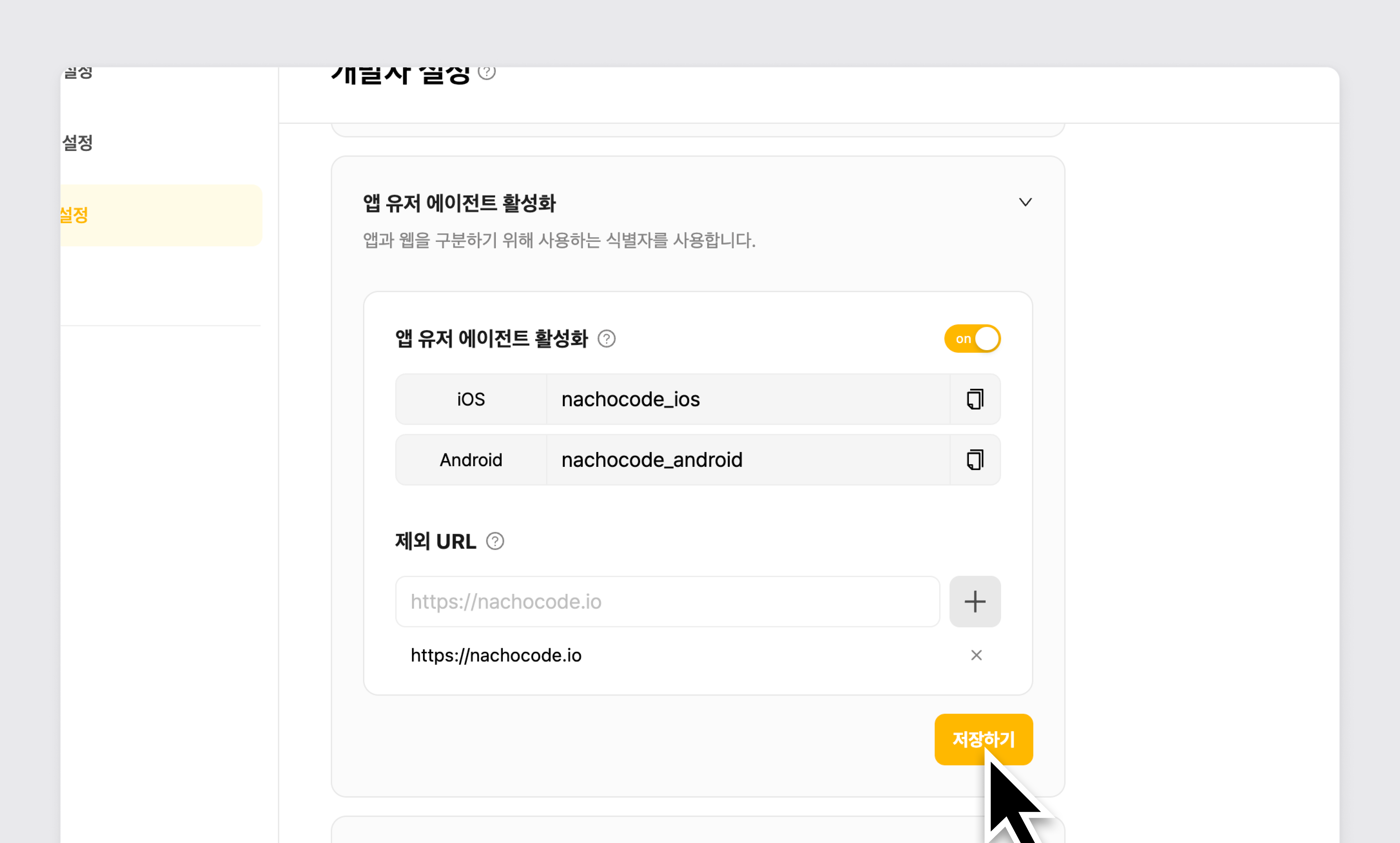 1단계) 나쵸코드 대시보드 > 앱 설정 > 개발자 설정 >앱 유저 에이전트 활성화 토글 ON