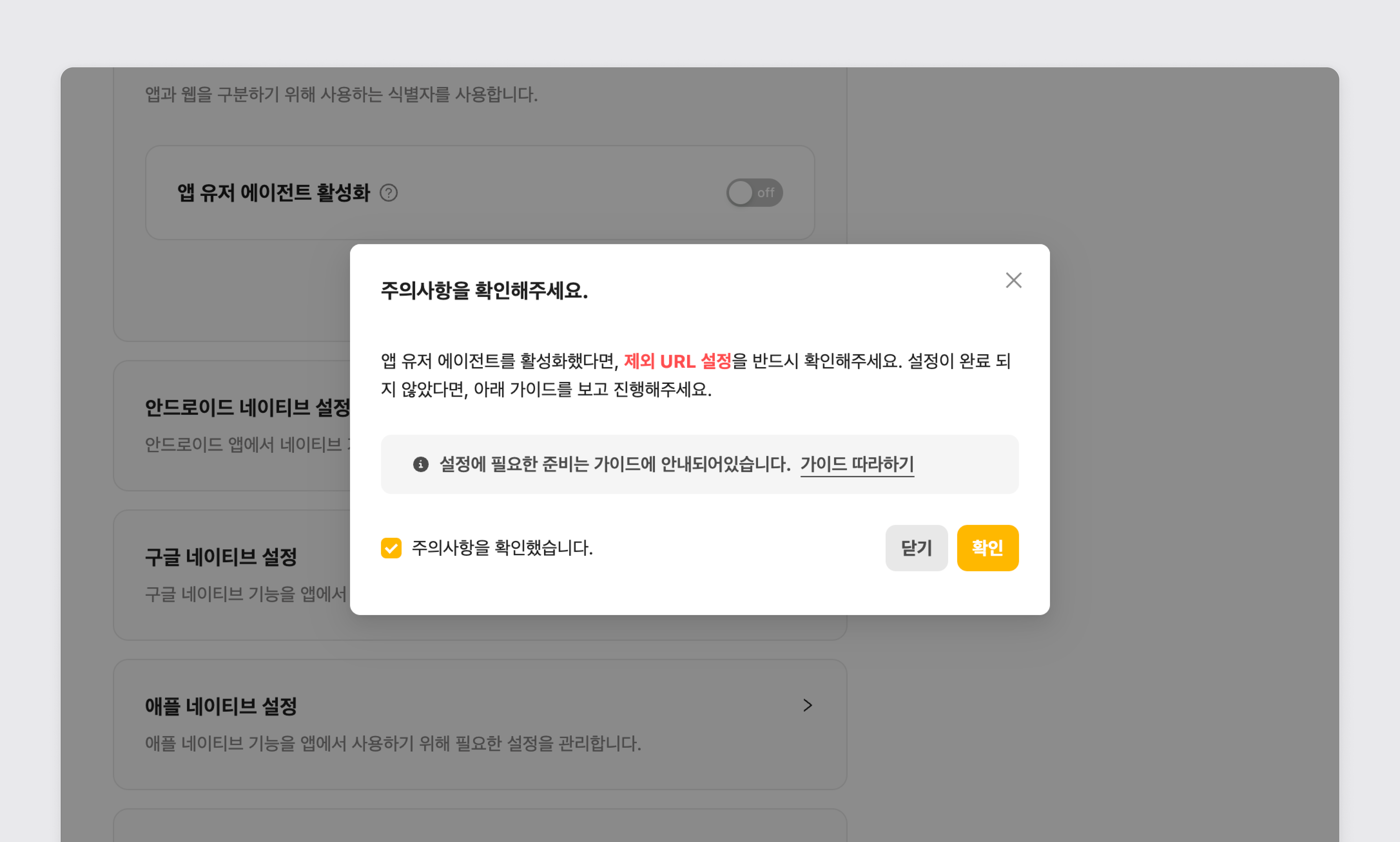 앱 유저 에이전트를 새로 활성화했다면, 반드시 앱을 새로 빌드해주세요.