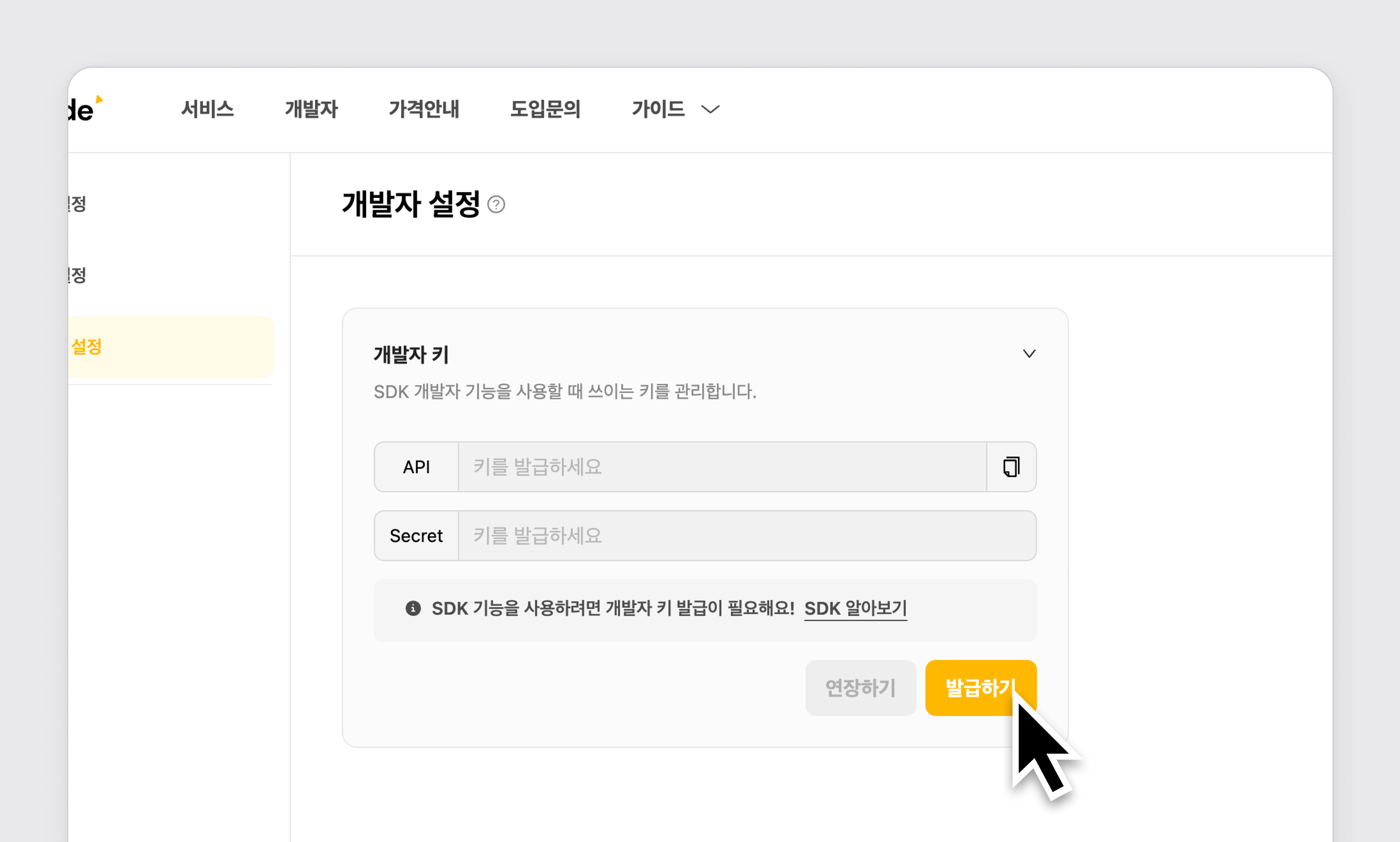 1단계) 앱 설정 > 개발자 설정에서 [발급하기] 버튼 클릭