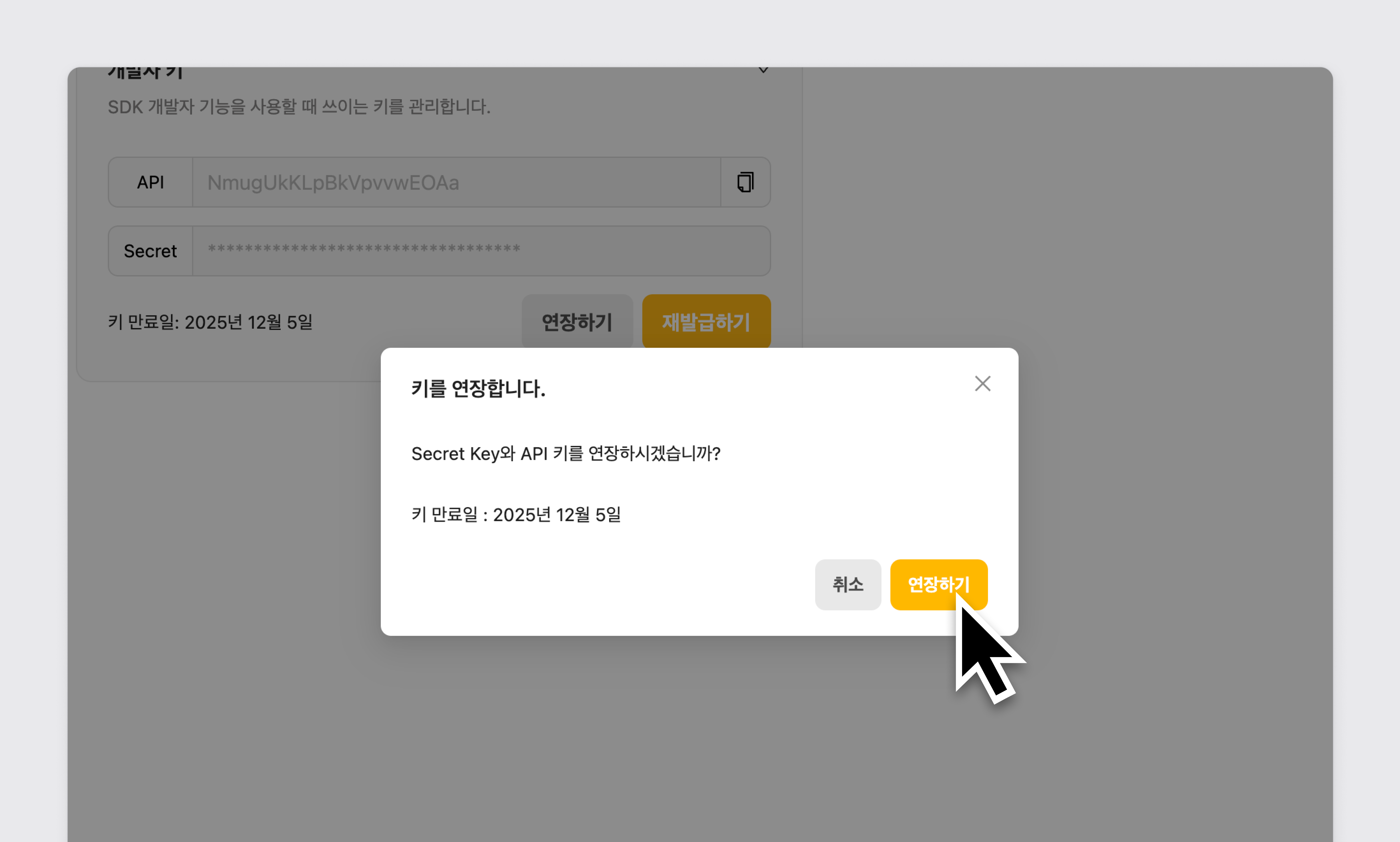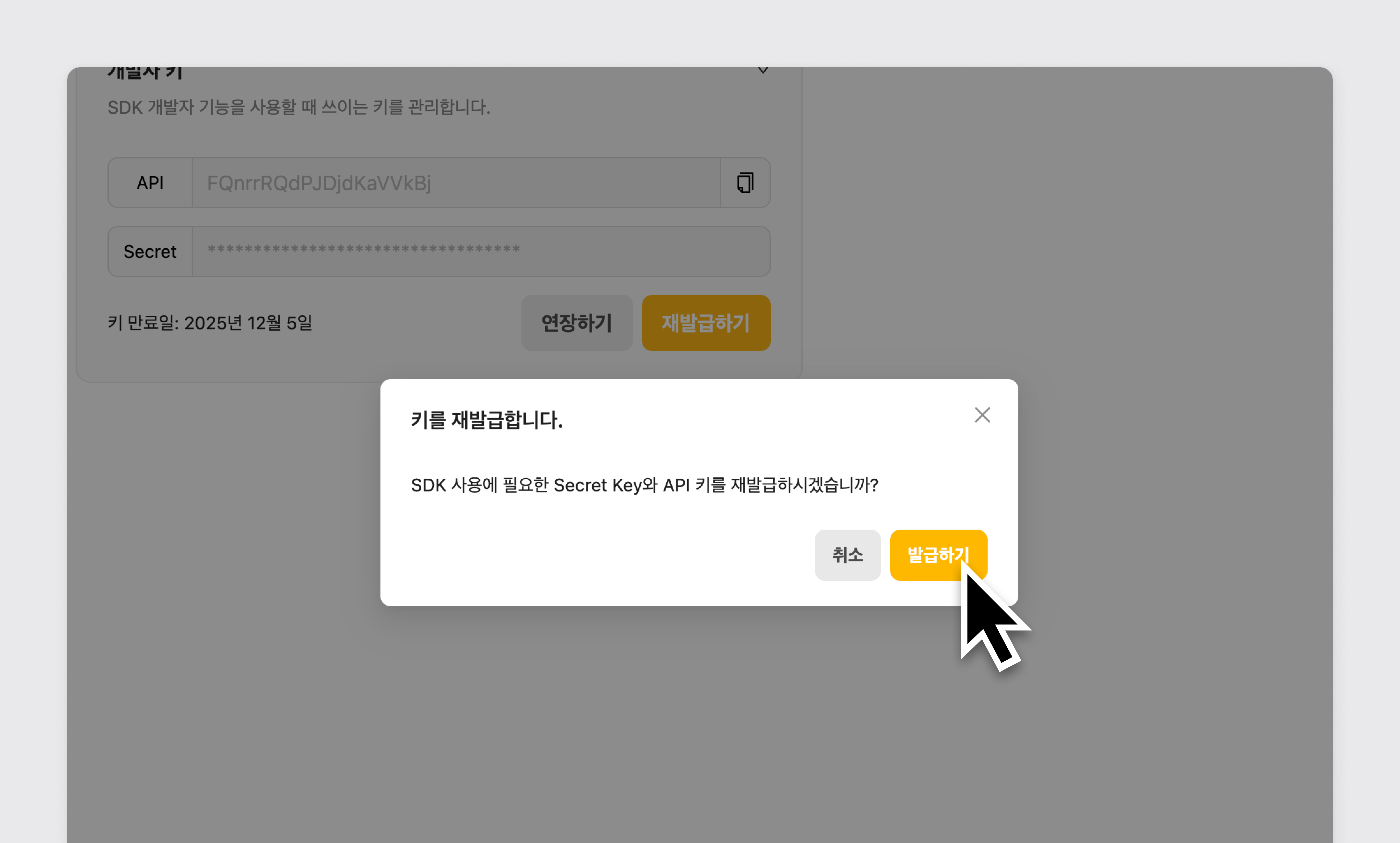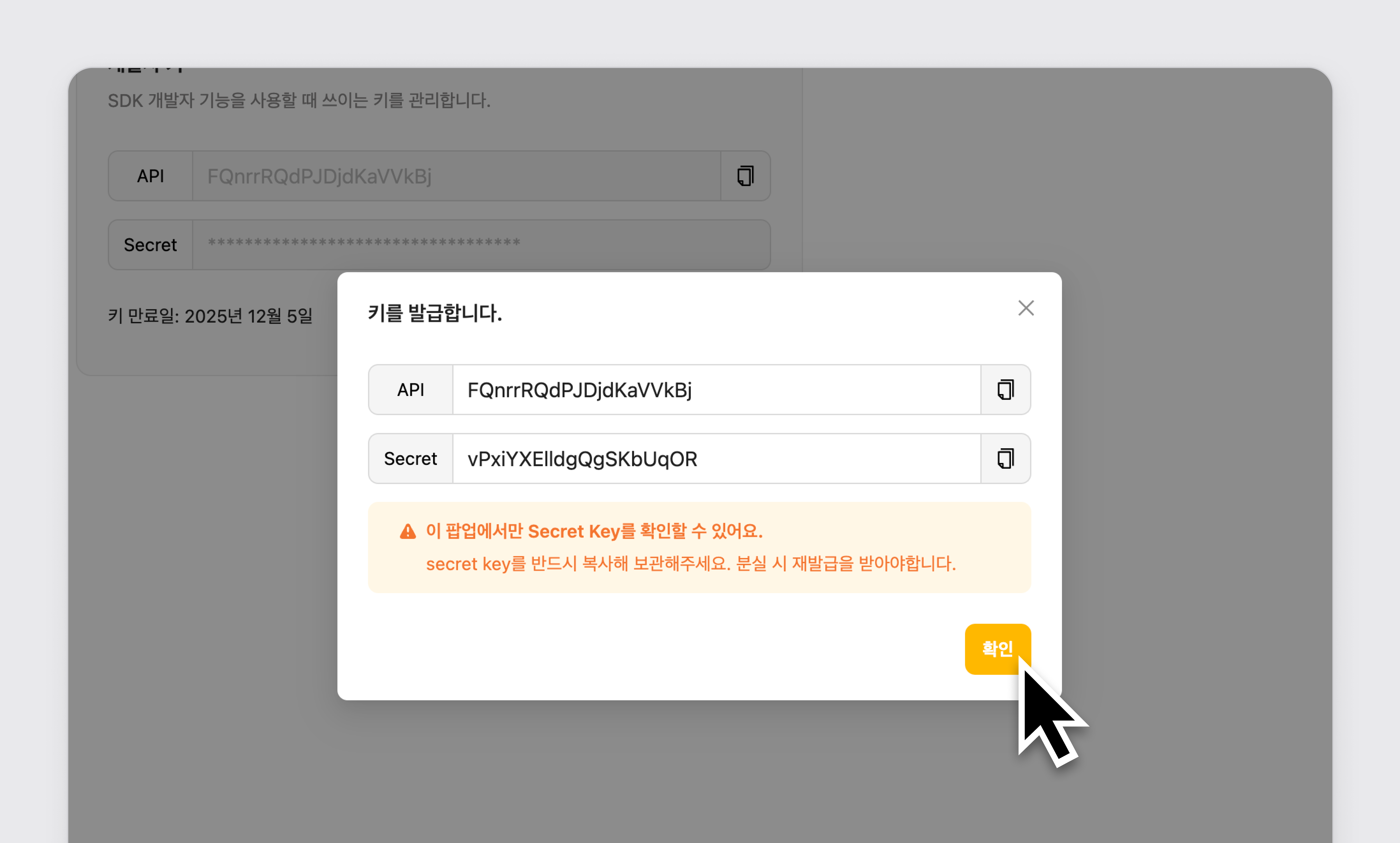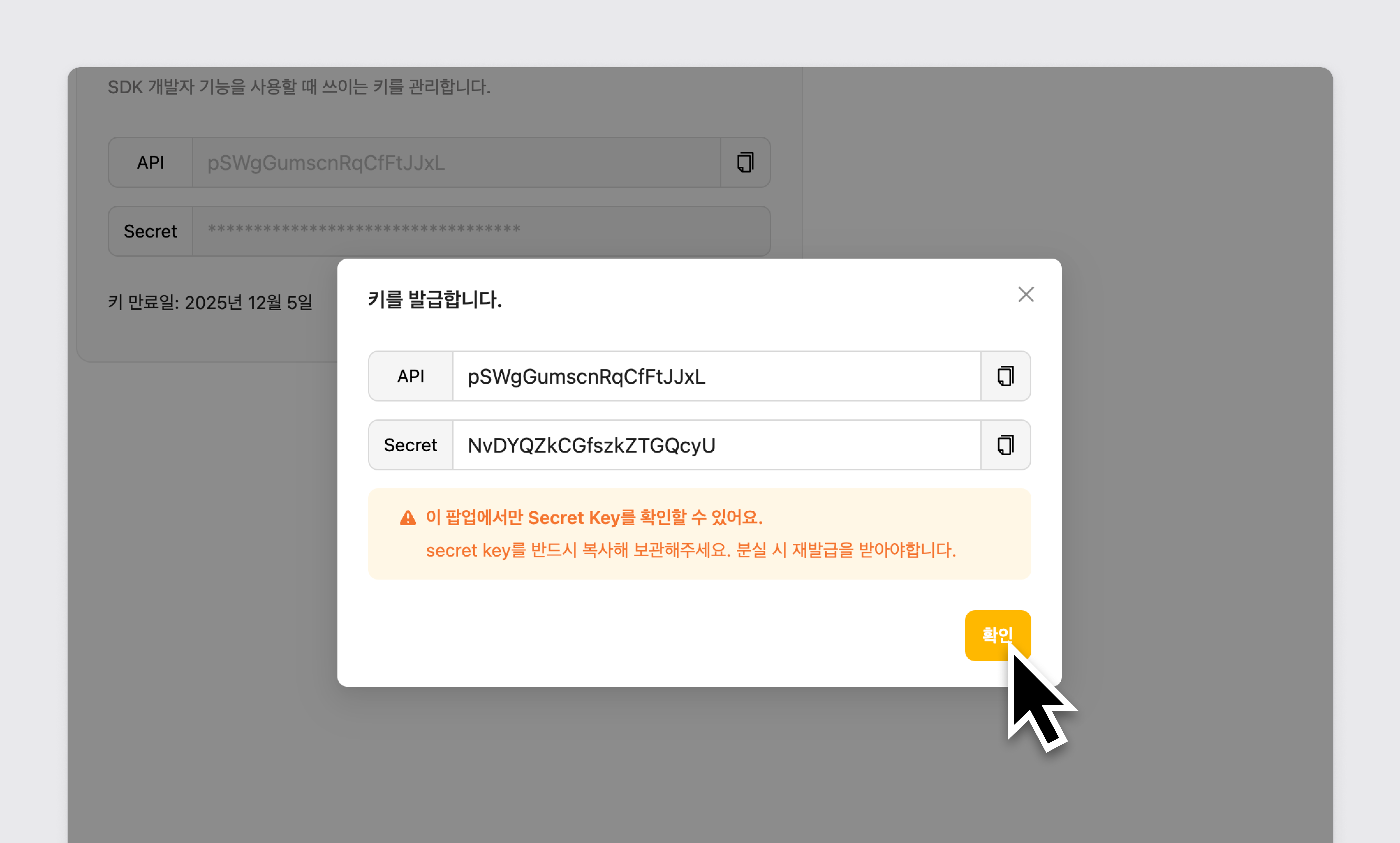 Secret Key는 위 팝업에서만 확인할 수 있으니 반드시 복사해서 붙여넣기 해주세요. 분실 시 재발급 받아야합니다.