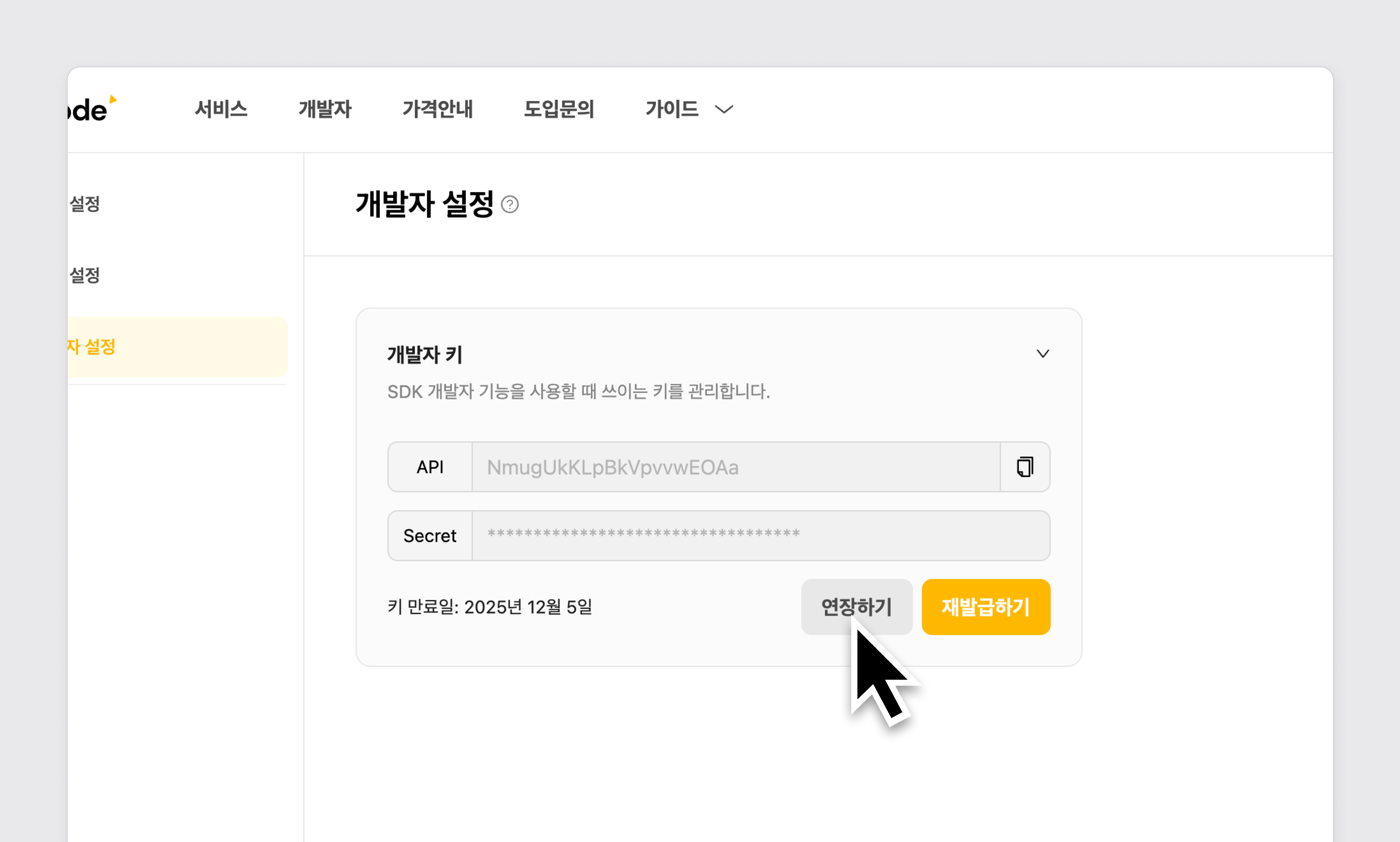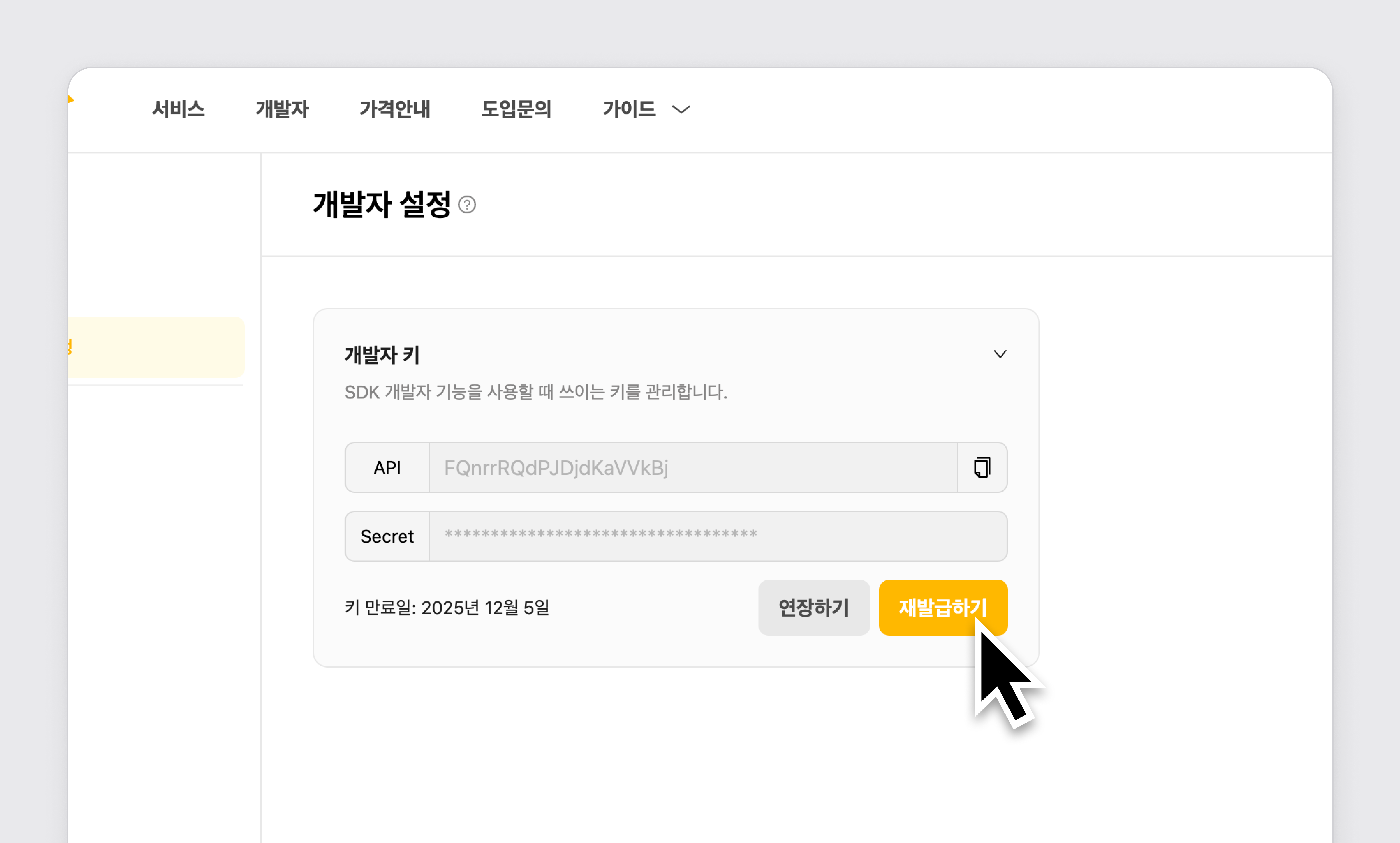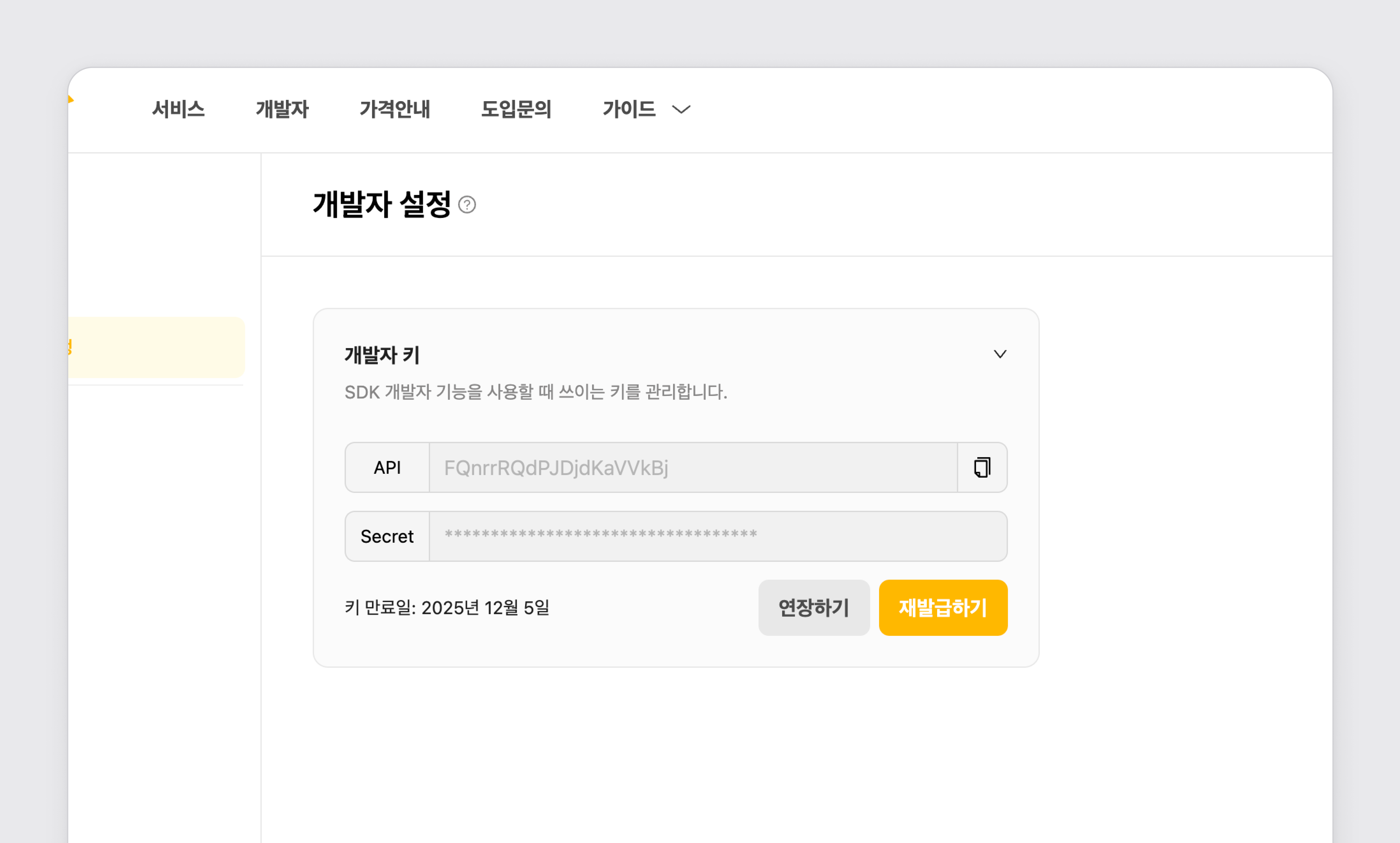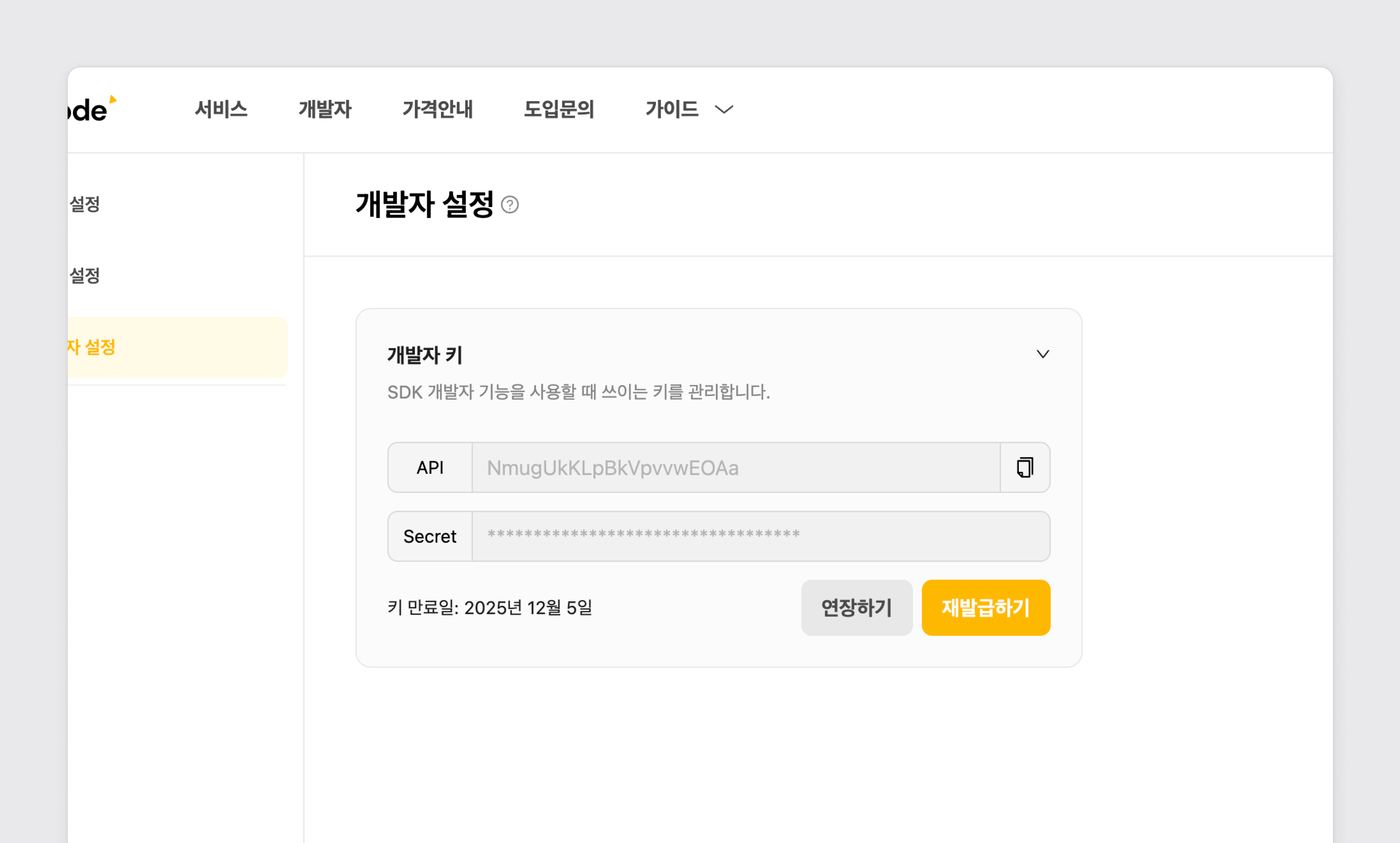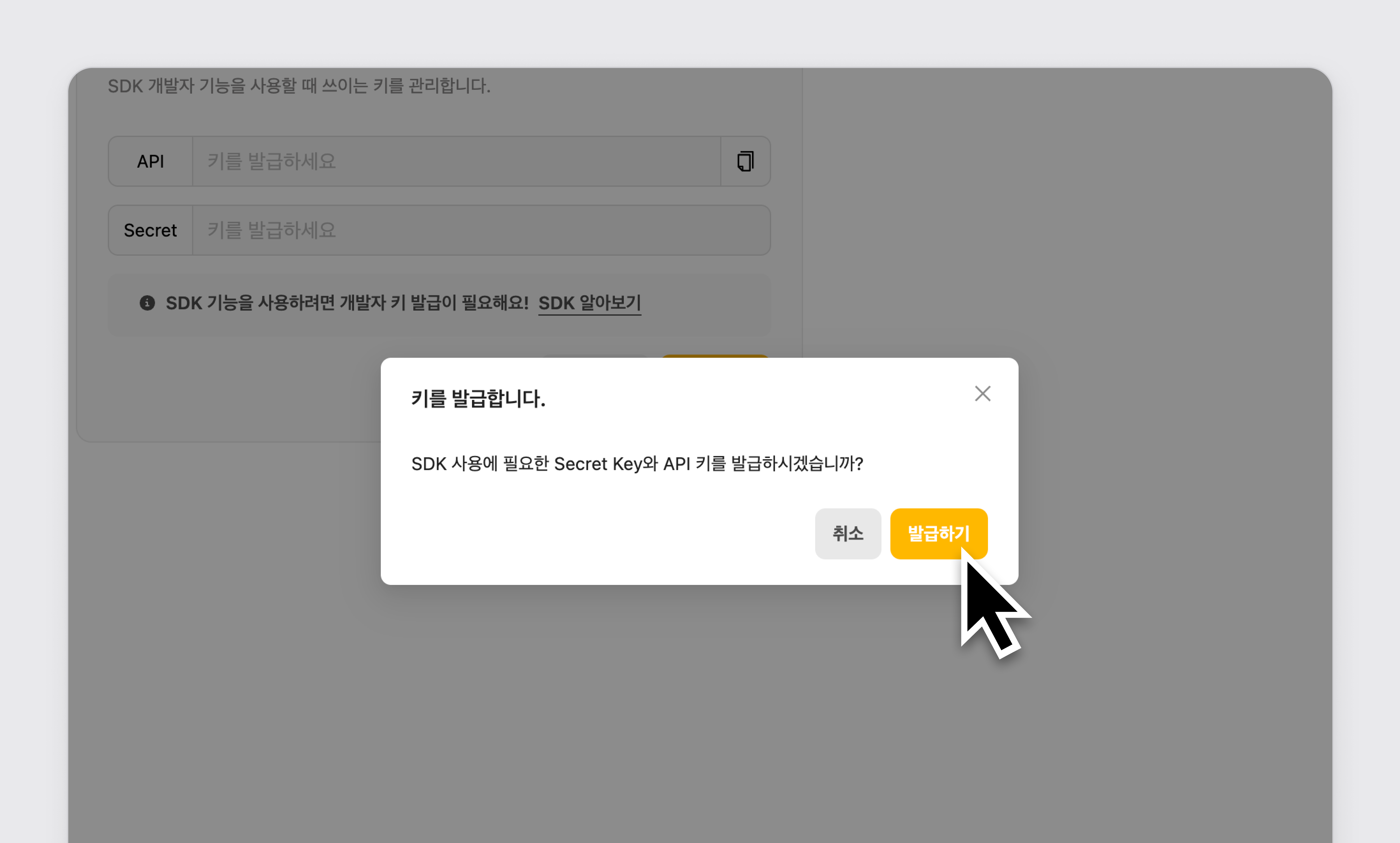 Secret Key는 위 팝업에서만 확인할 수 있으니 반드시 복사해서 붙여넣기 해주세요. 분실 시 재발급 받아야합니다.