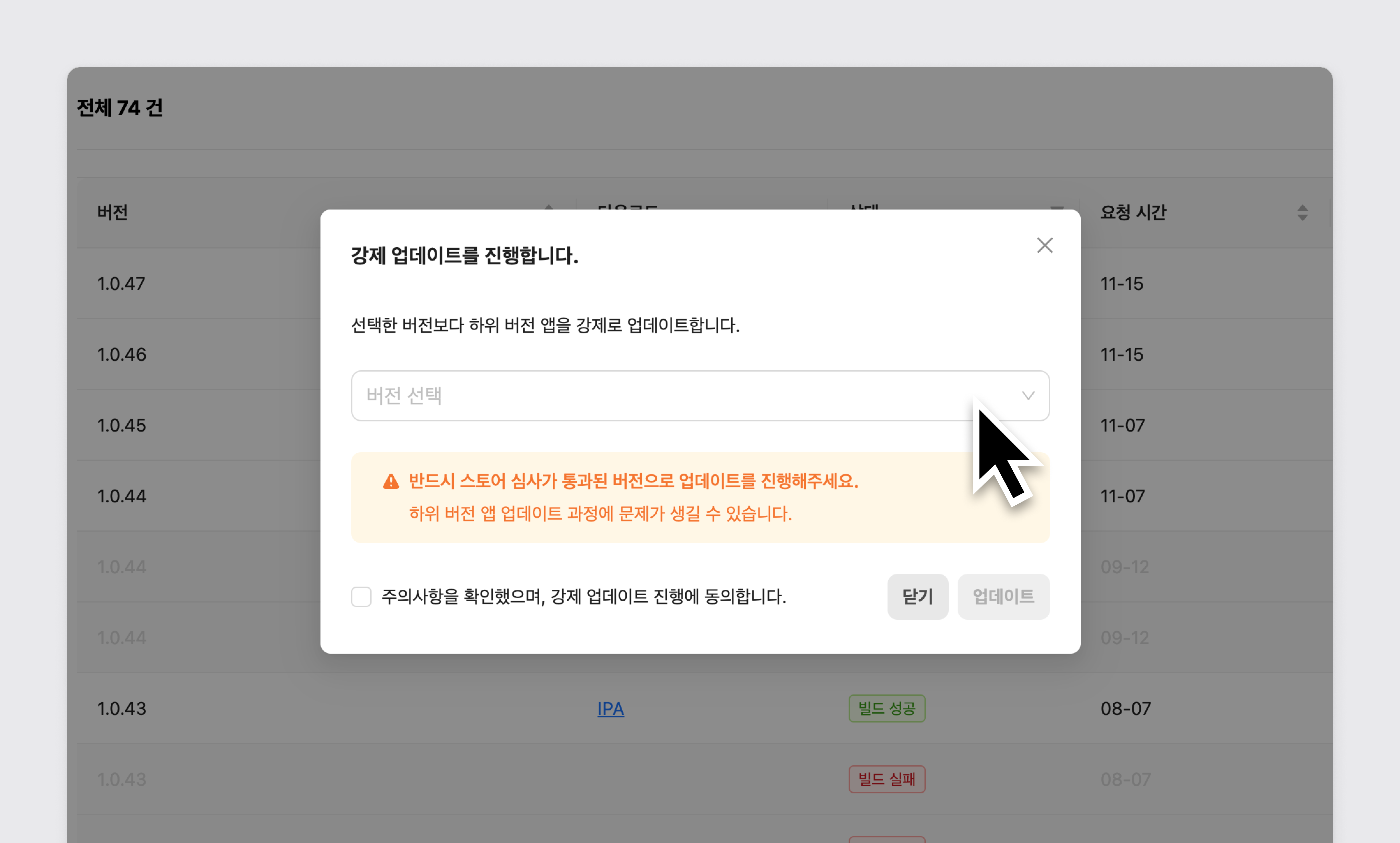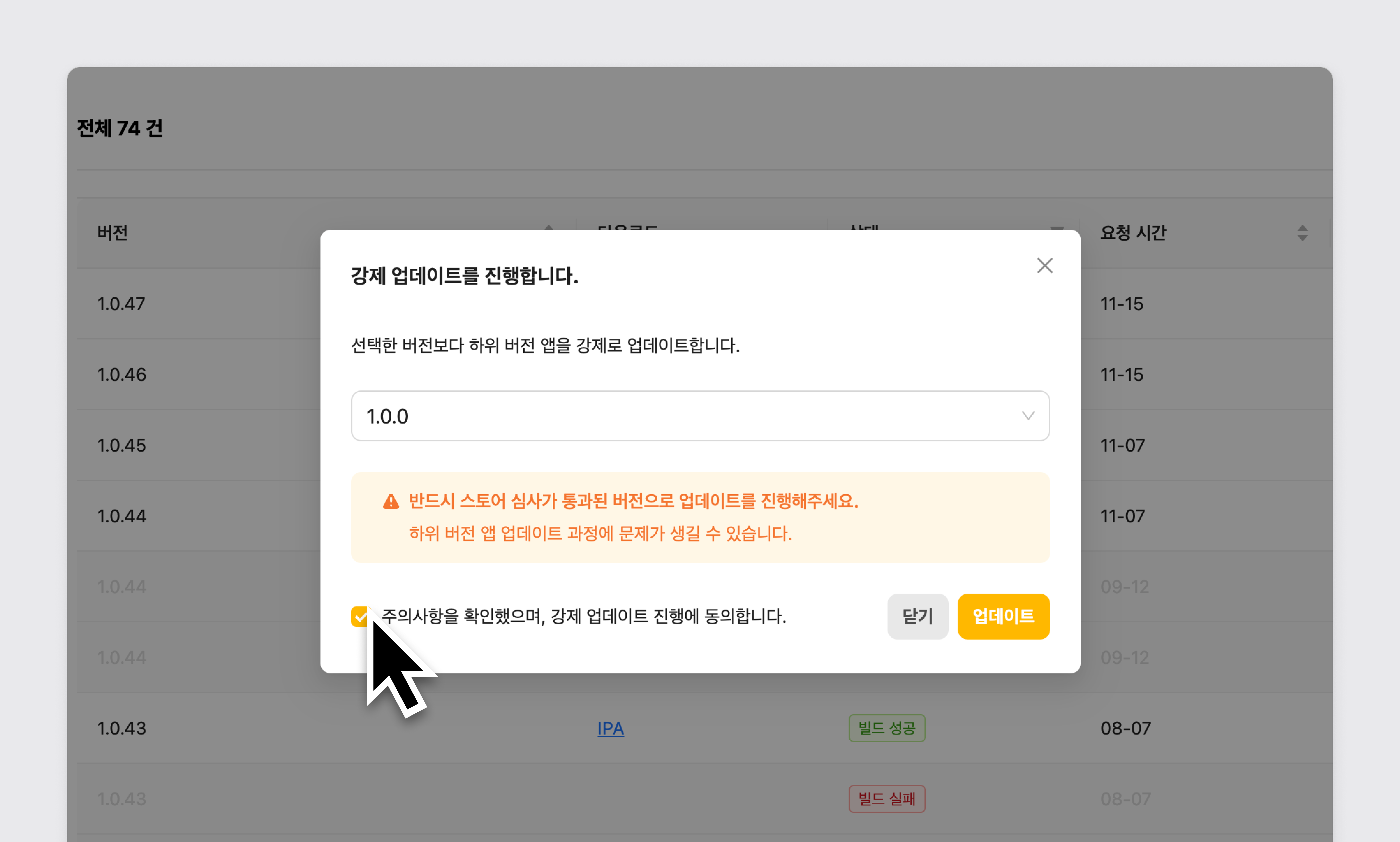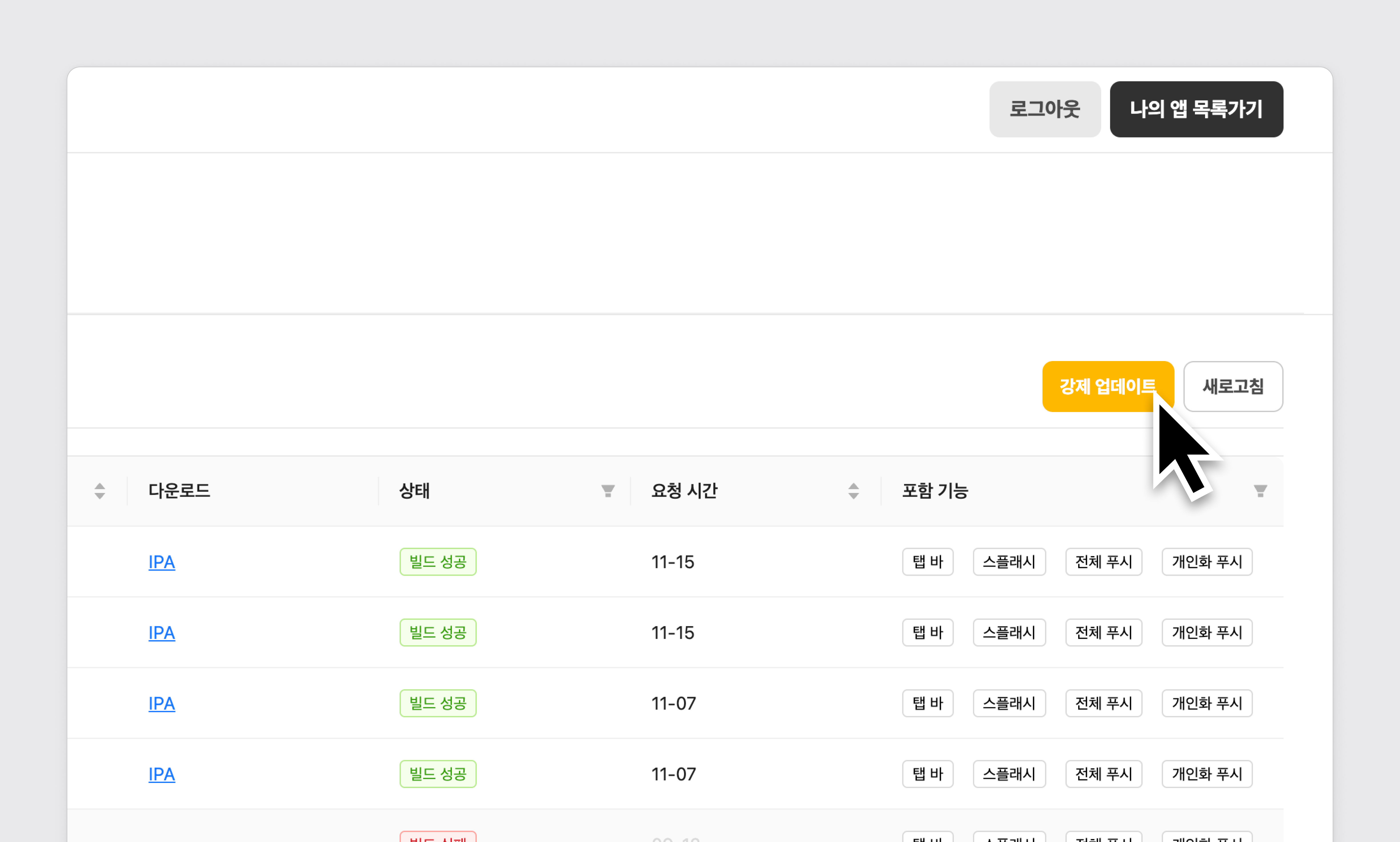 1단계) 앱 빌드 > 빌드 히스토리에서 [강제 업데이트] 클릭
