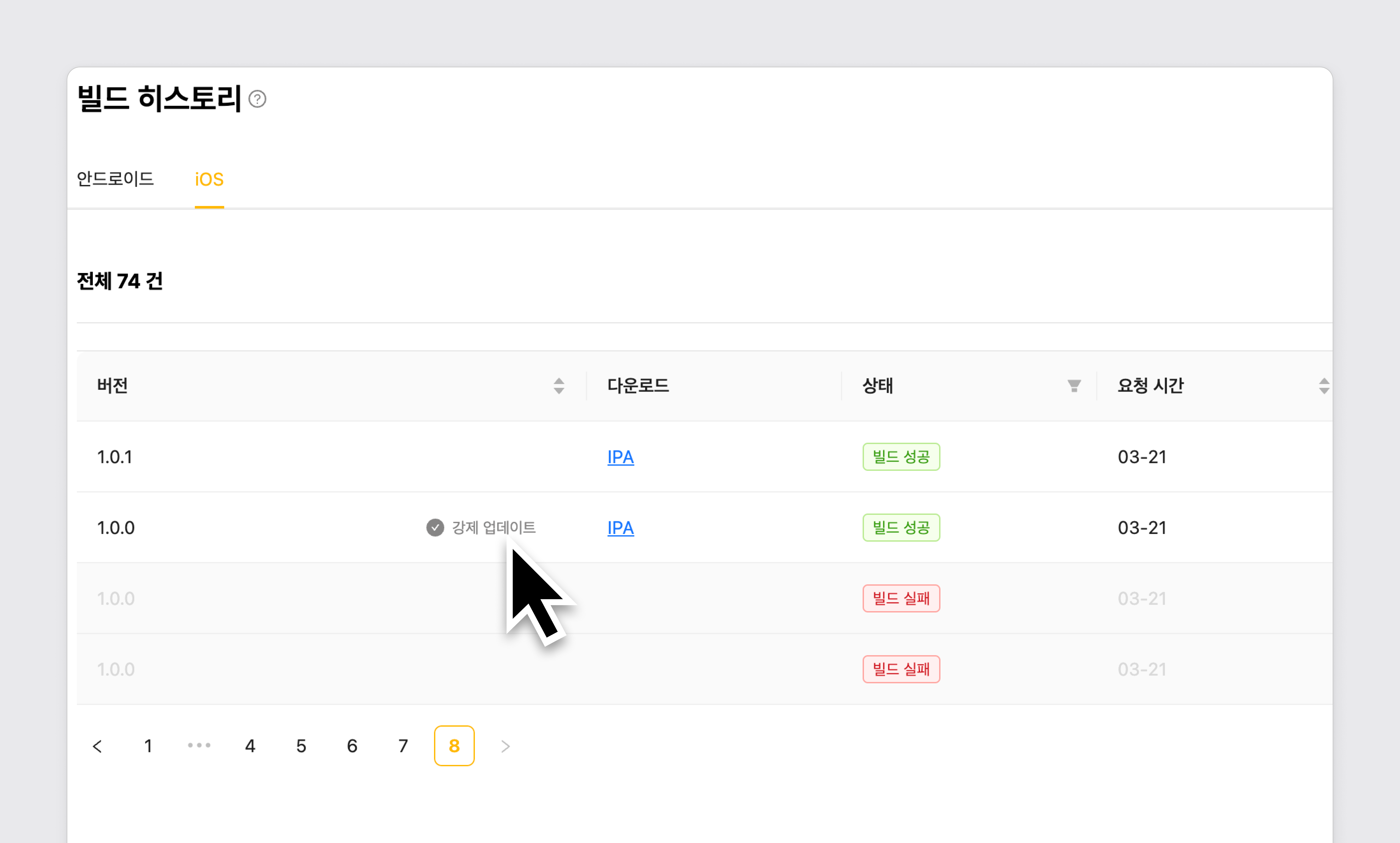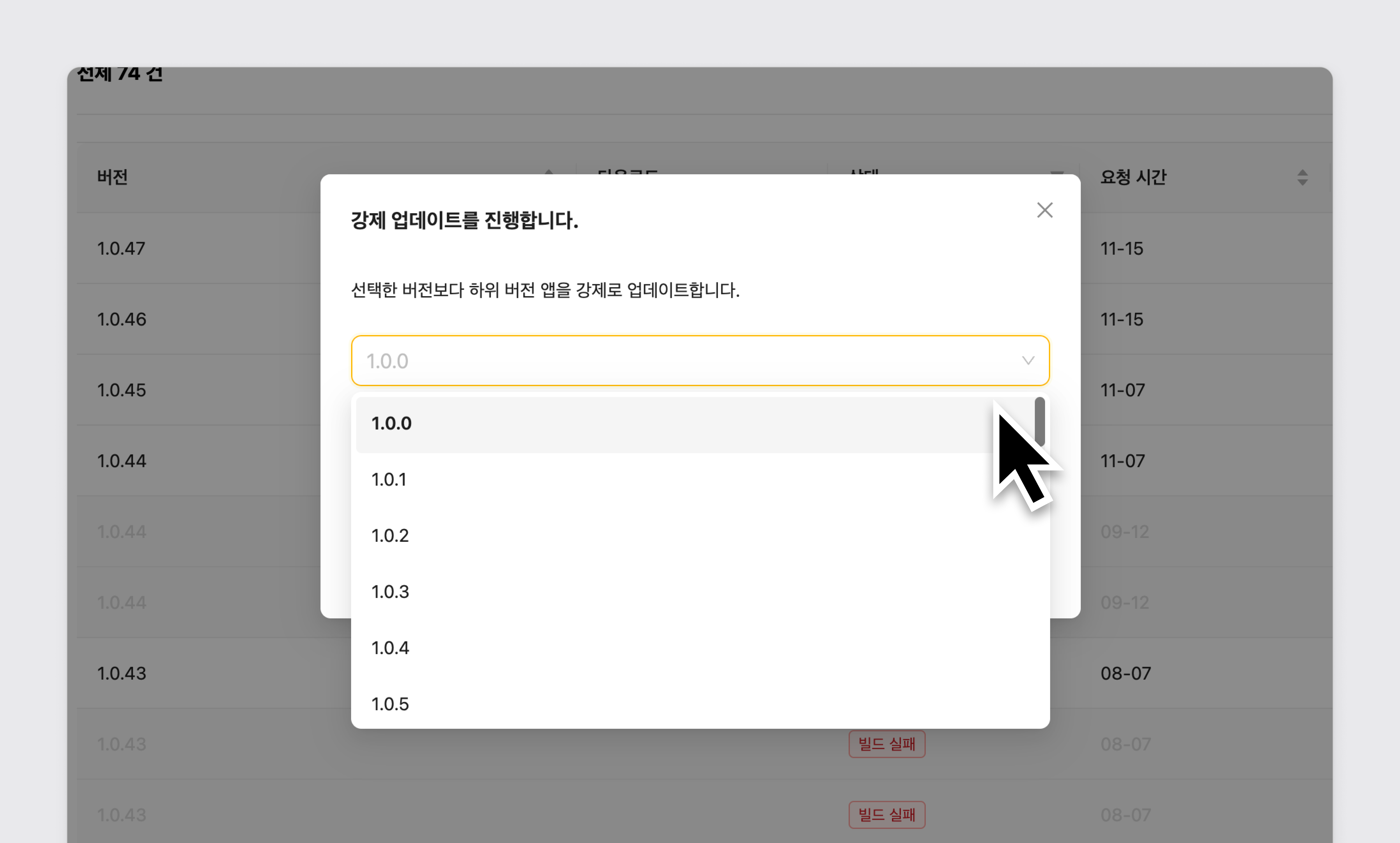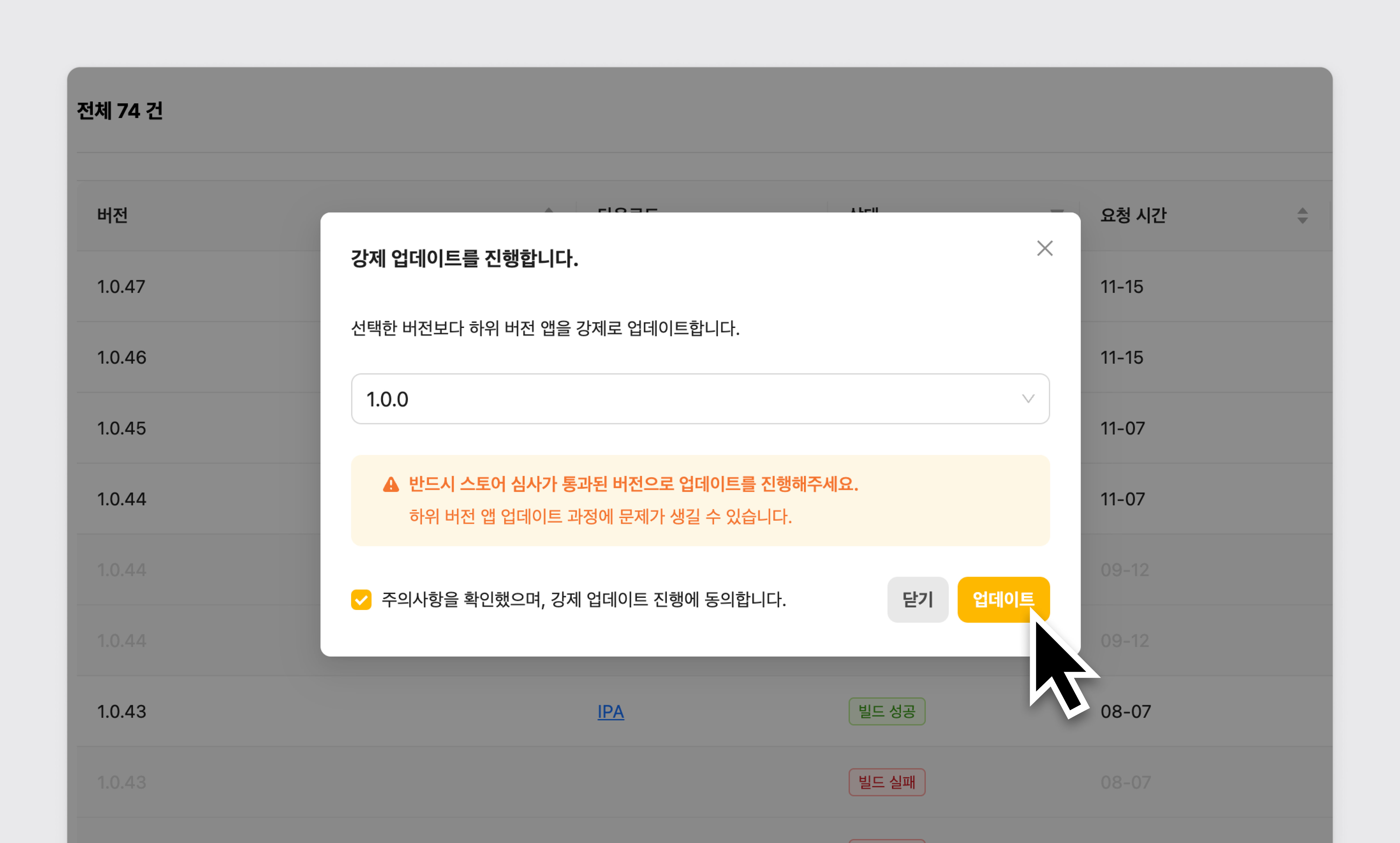 1단계) 앱 빌드 > 빌드 히스토리에서 [강제 업데이트] 클릭