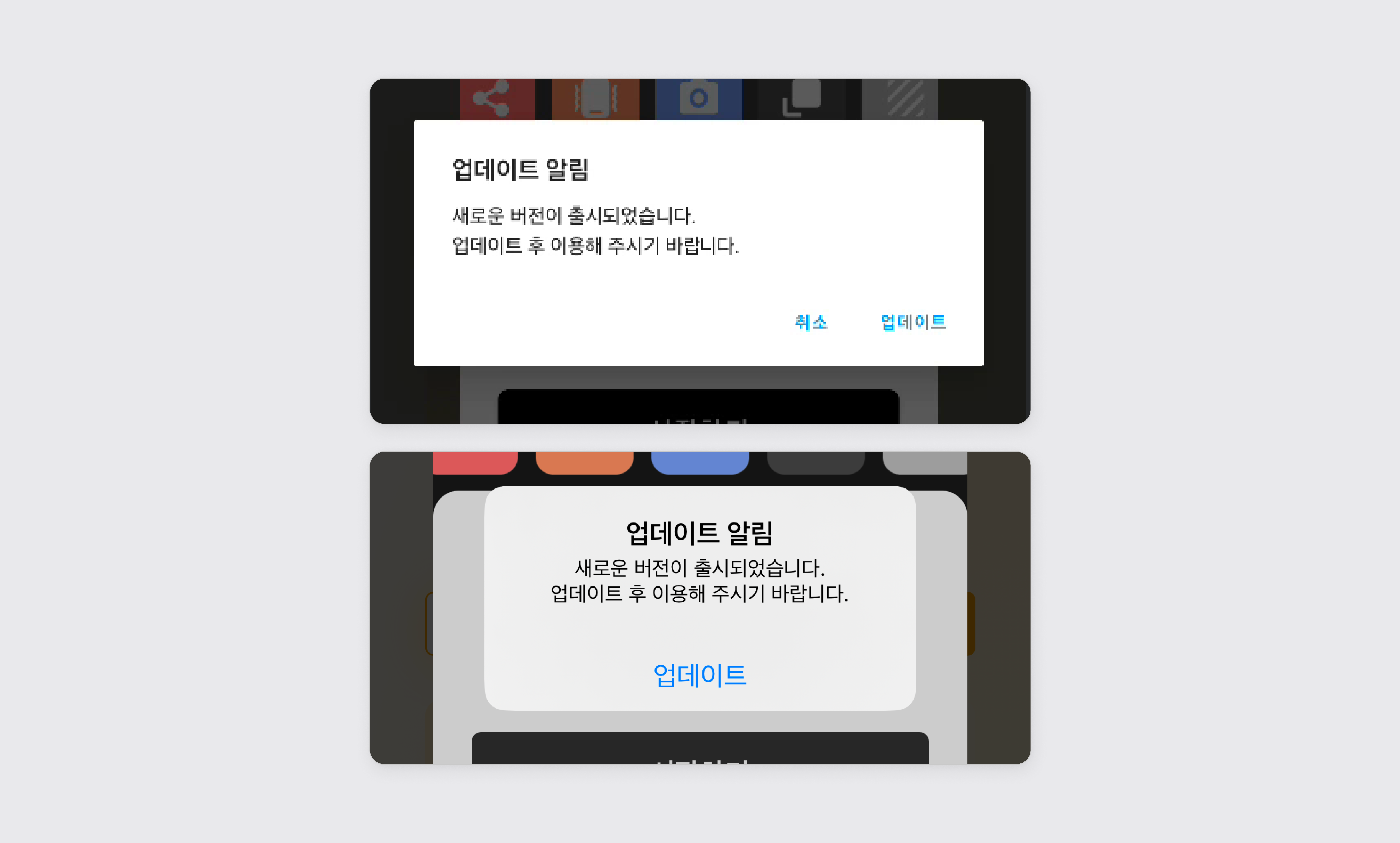 강제 업데이트가 활성화 되면, 설정한 버전보다 하위 버전을 사용하는 고객들의 앱에 팝업 문구가 뜨게됩니다.