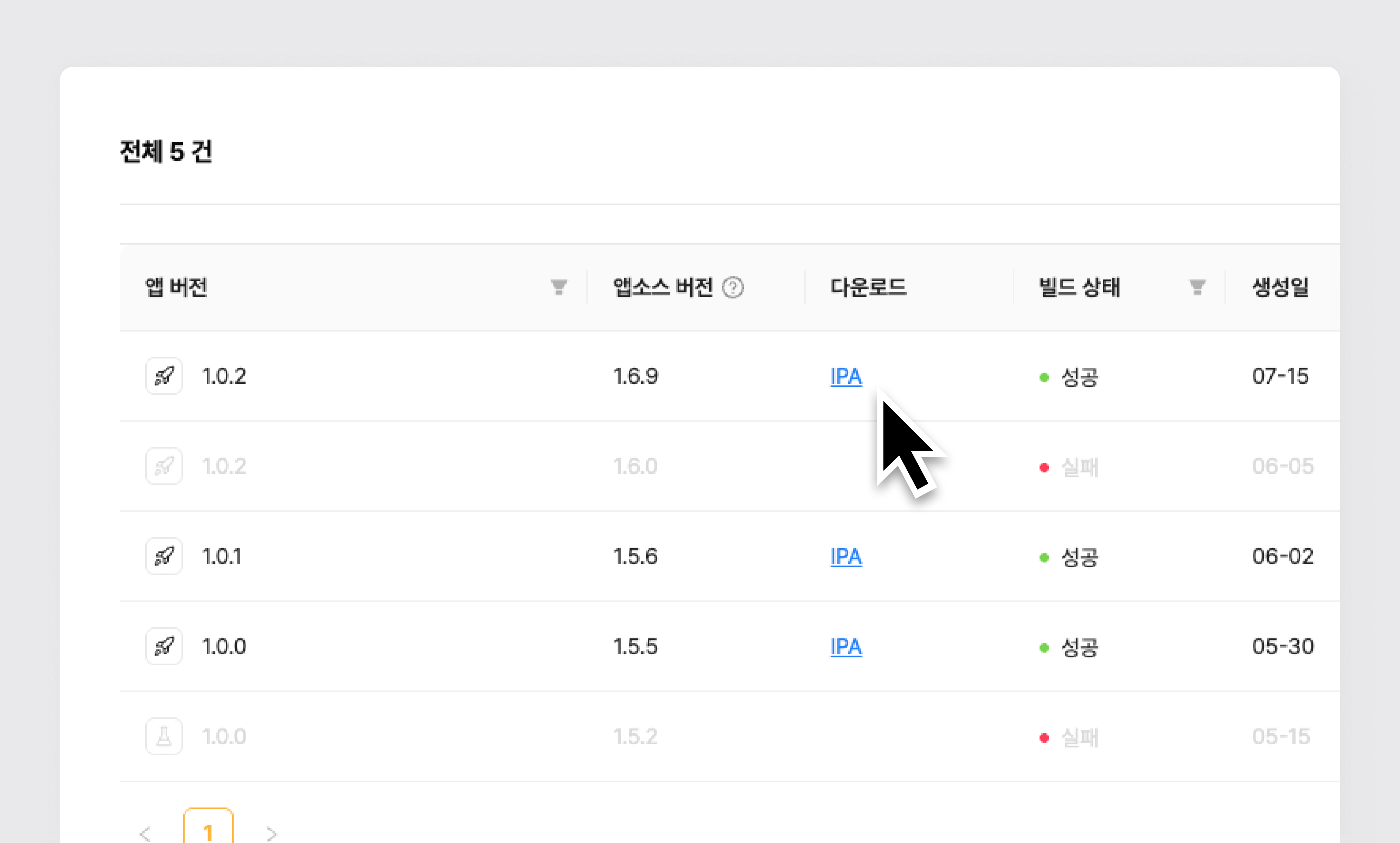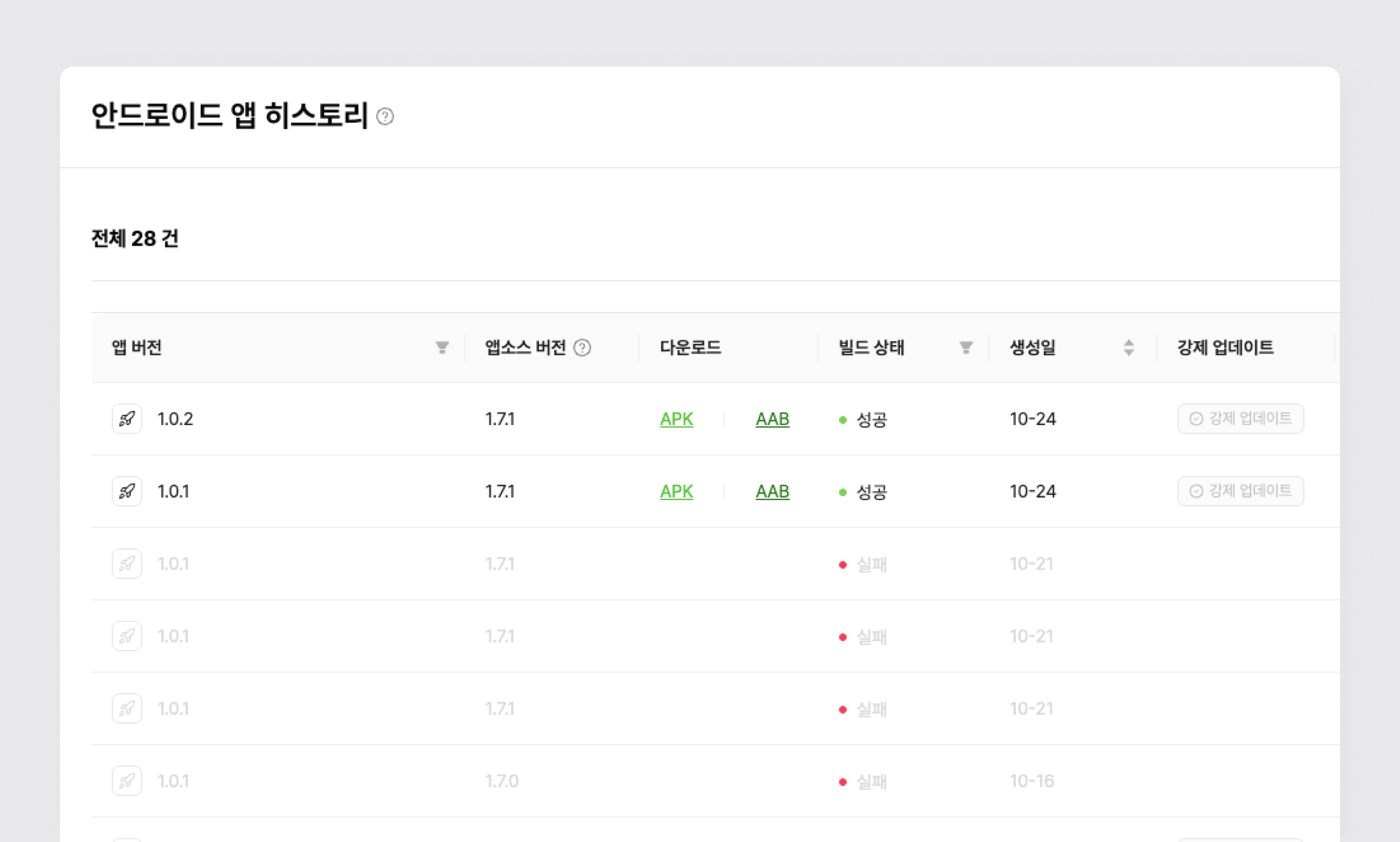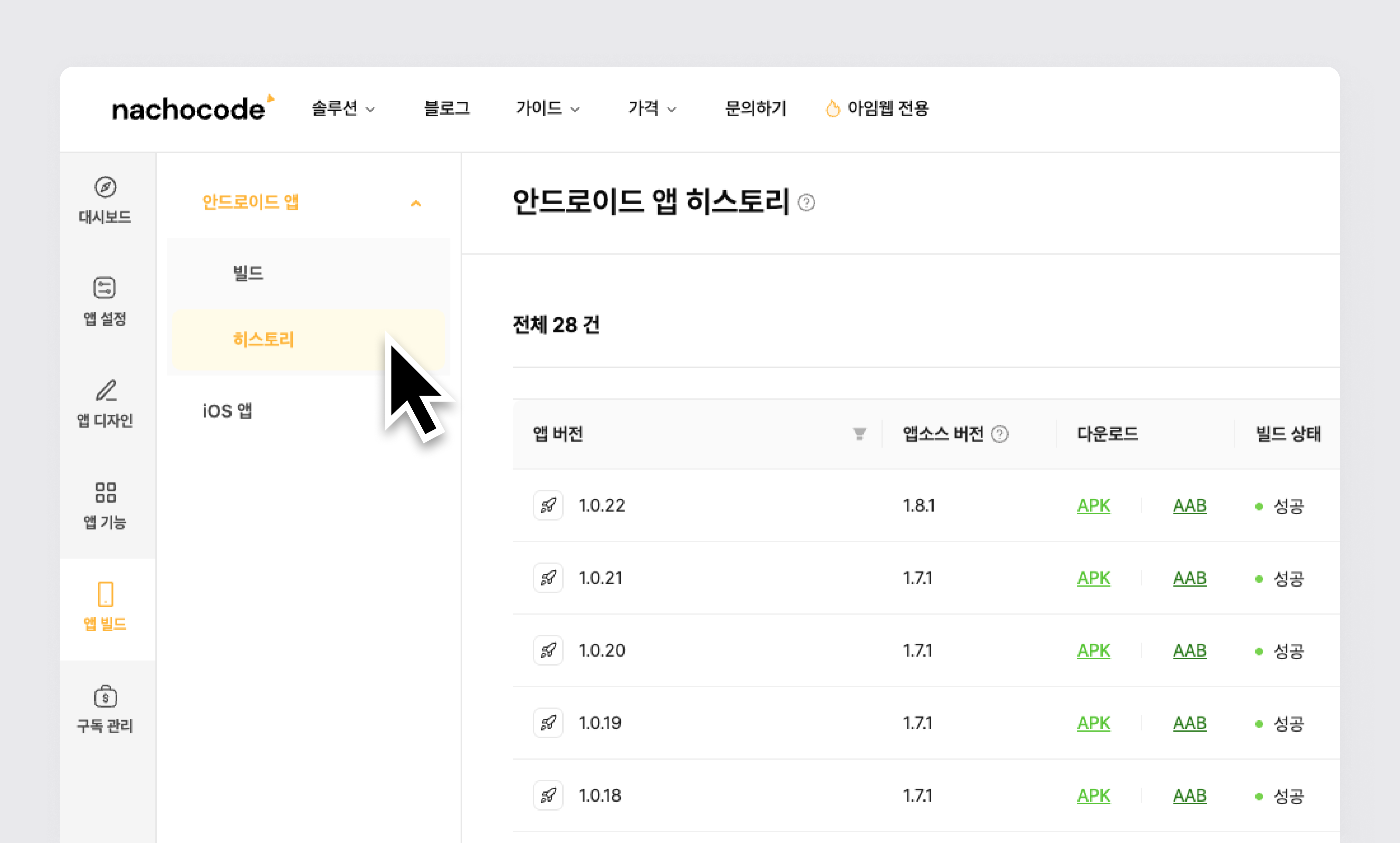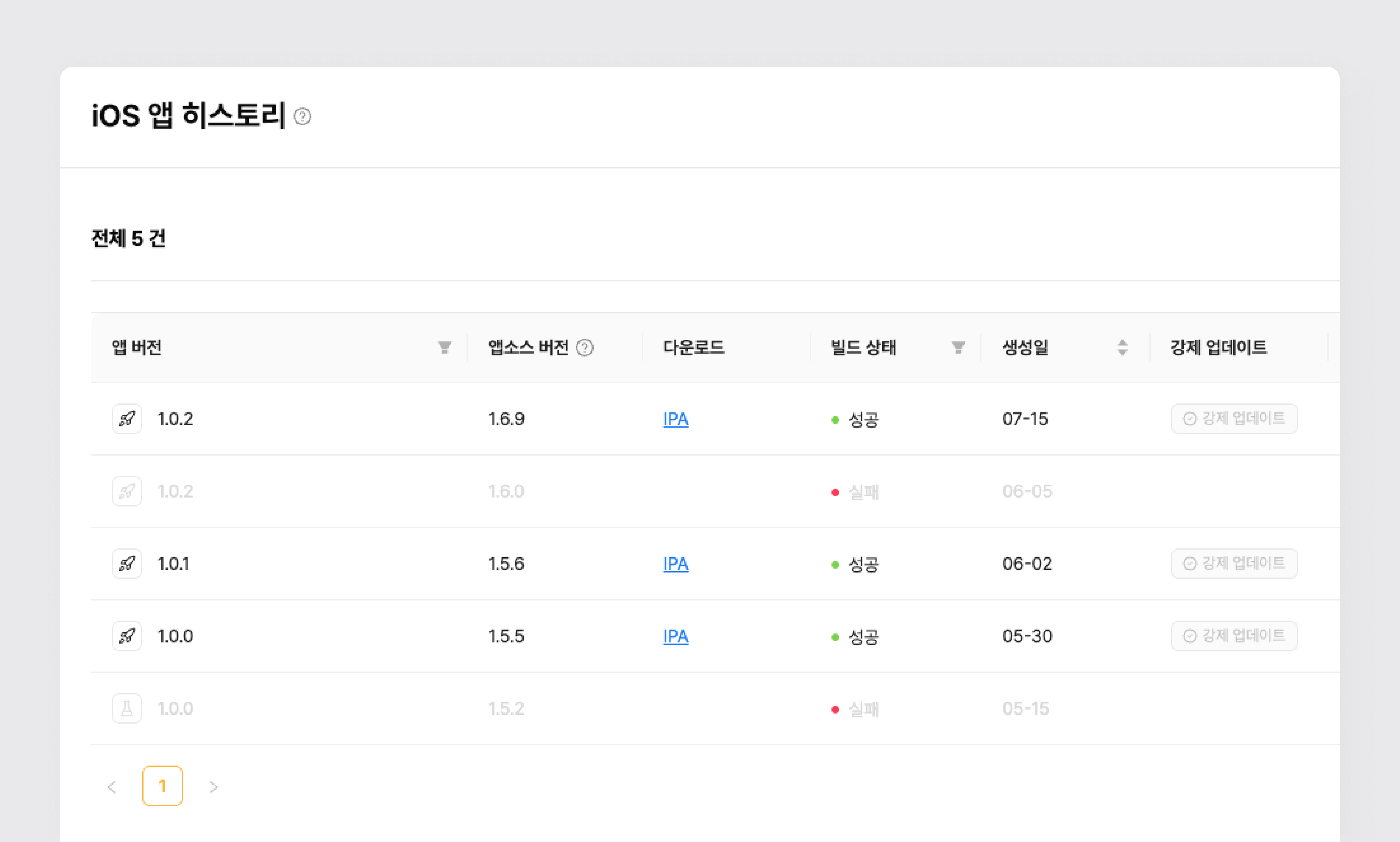 2단계) 히스토리에서 앱 버전, 앱 다운로드, 빌드 성공 여부, 해당 앱에 포함된 기능 확인 가능