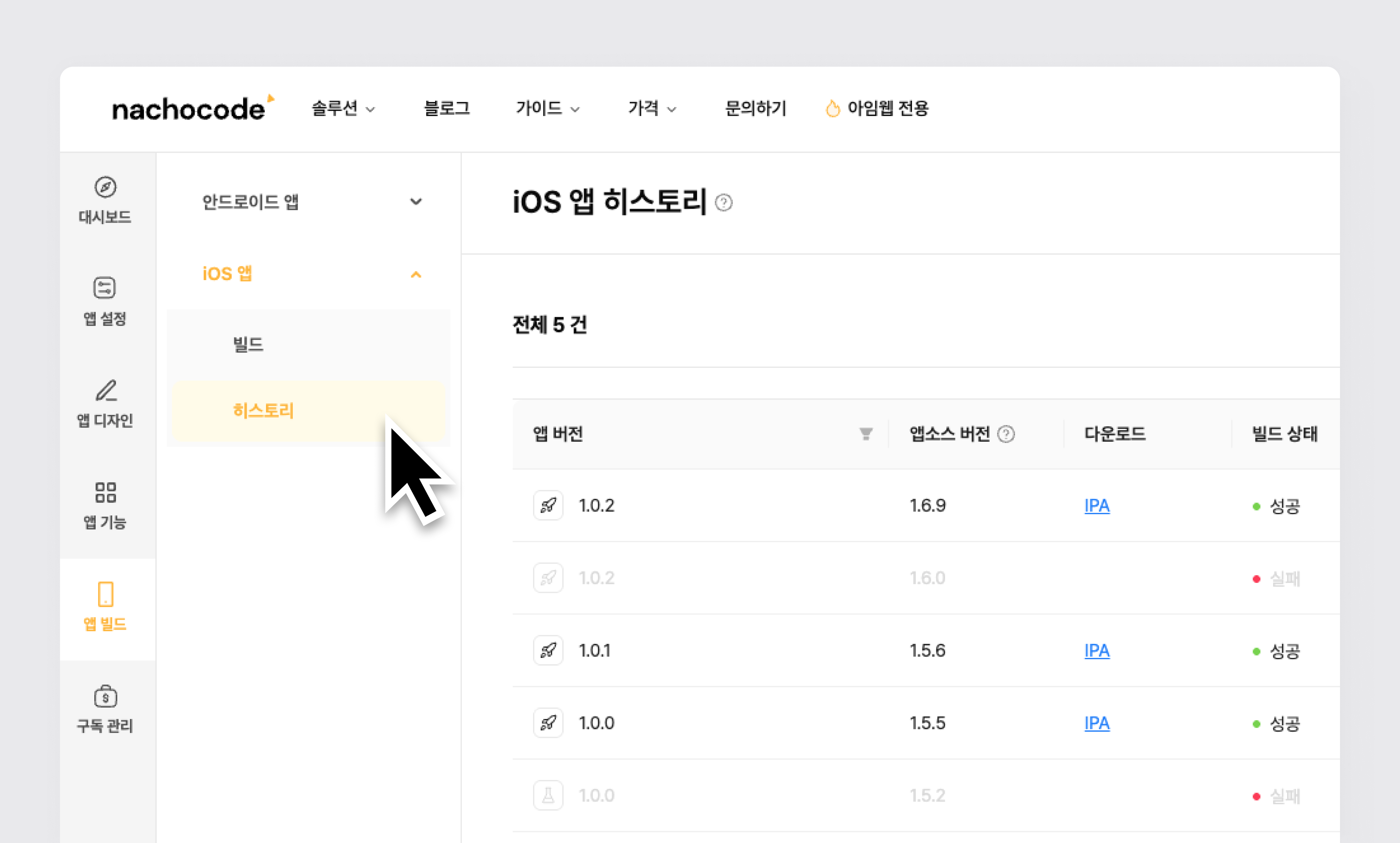 2단계) 히스토리에서 앱 버전, 빌드 성공 여부, 해당 앱에 포함된 기능 확인 가능