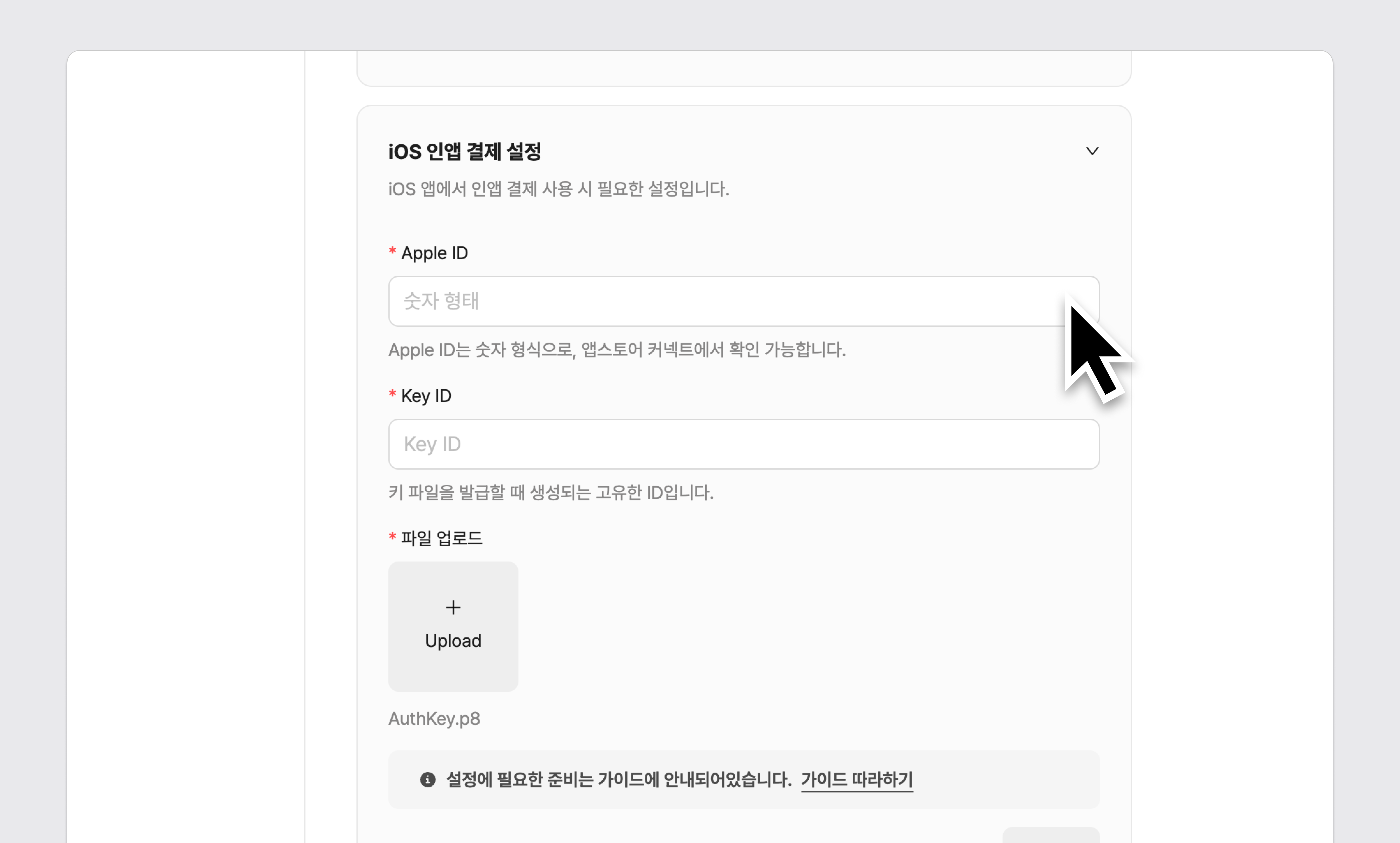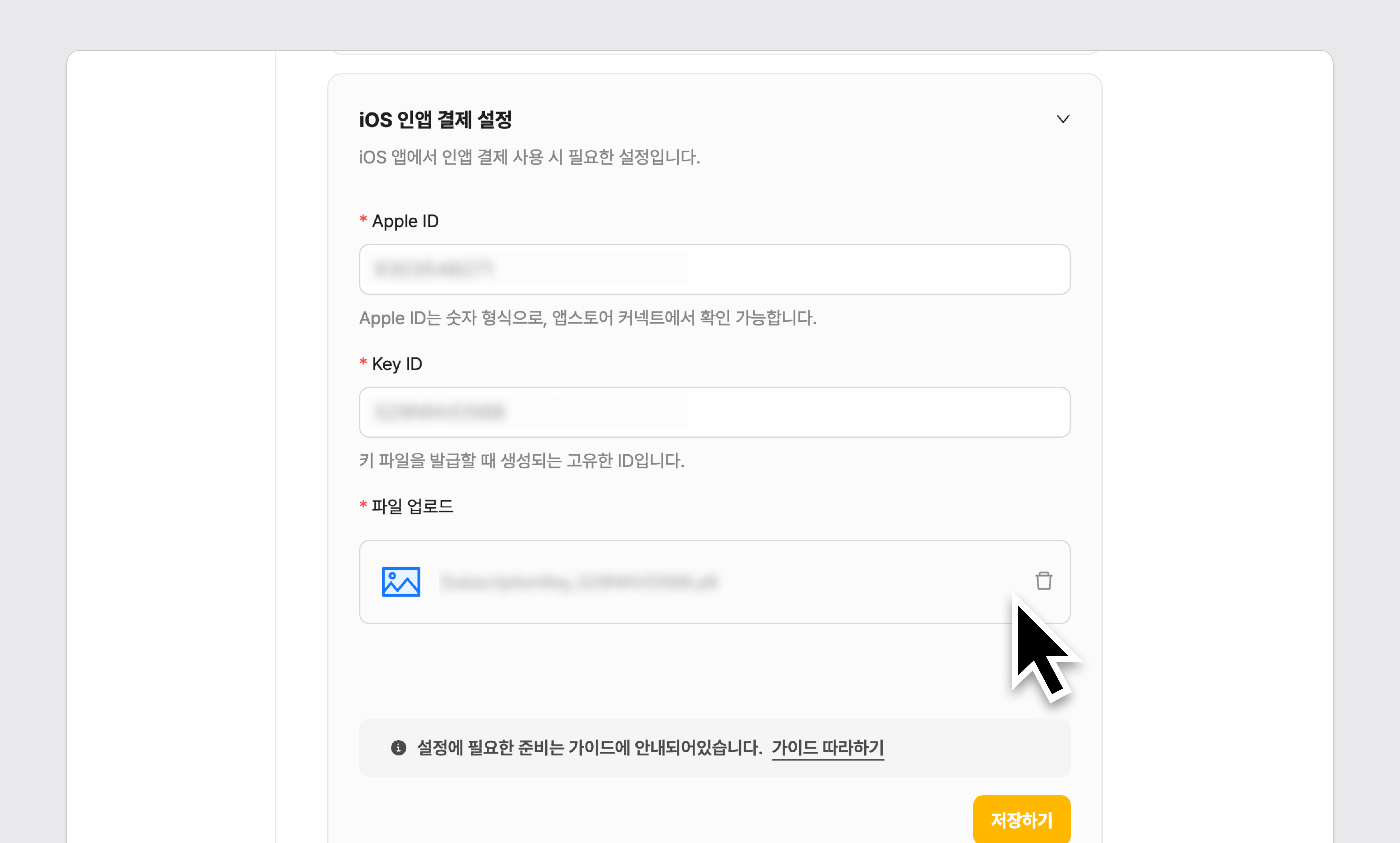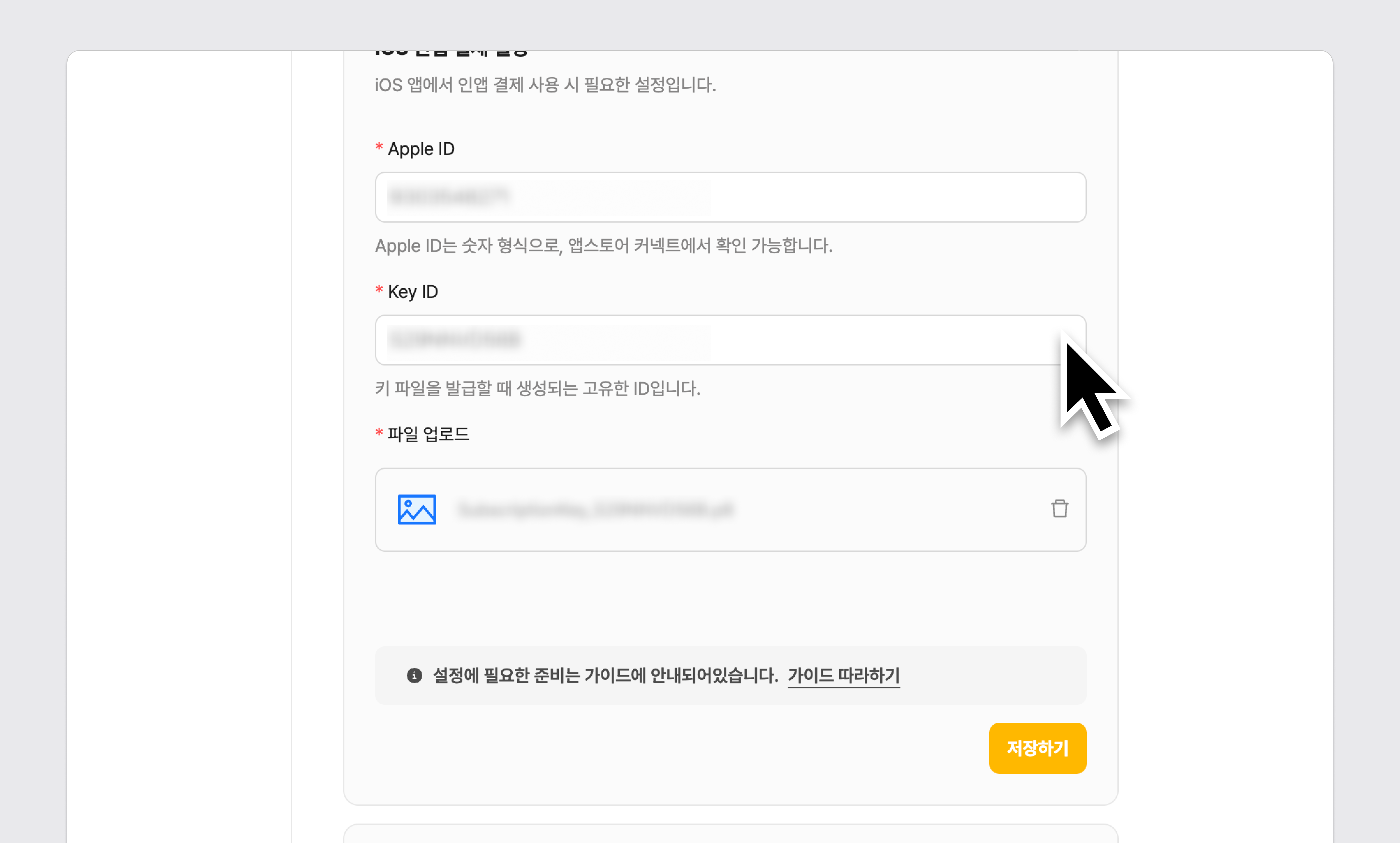 4단계) iOS에서 인앱 결제 사용시 iOS 인앱 결제 설정에 Key ID 입력