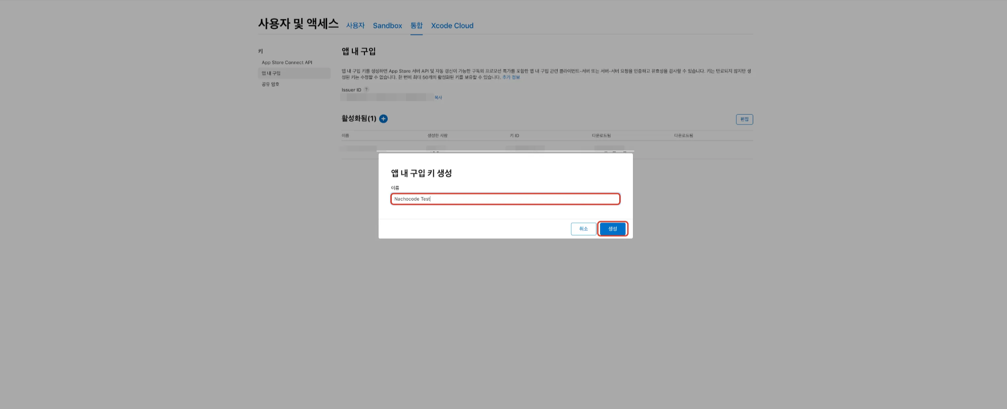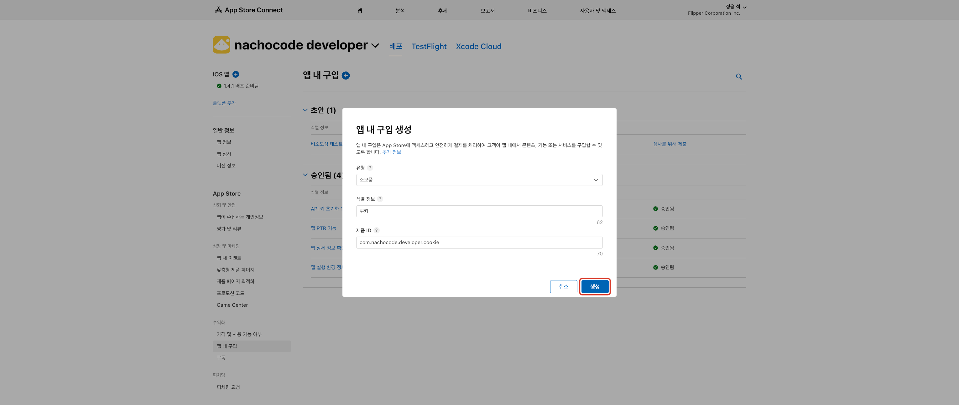 5단계) 사용할 인앱 결제 키의 이름을 입력 후 [생성] 버튼 클릭