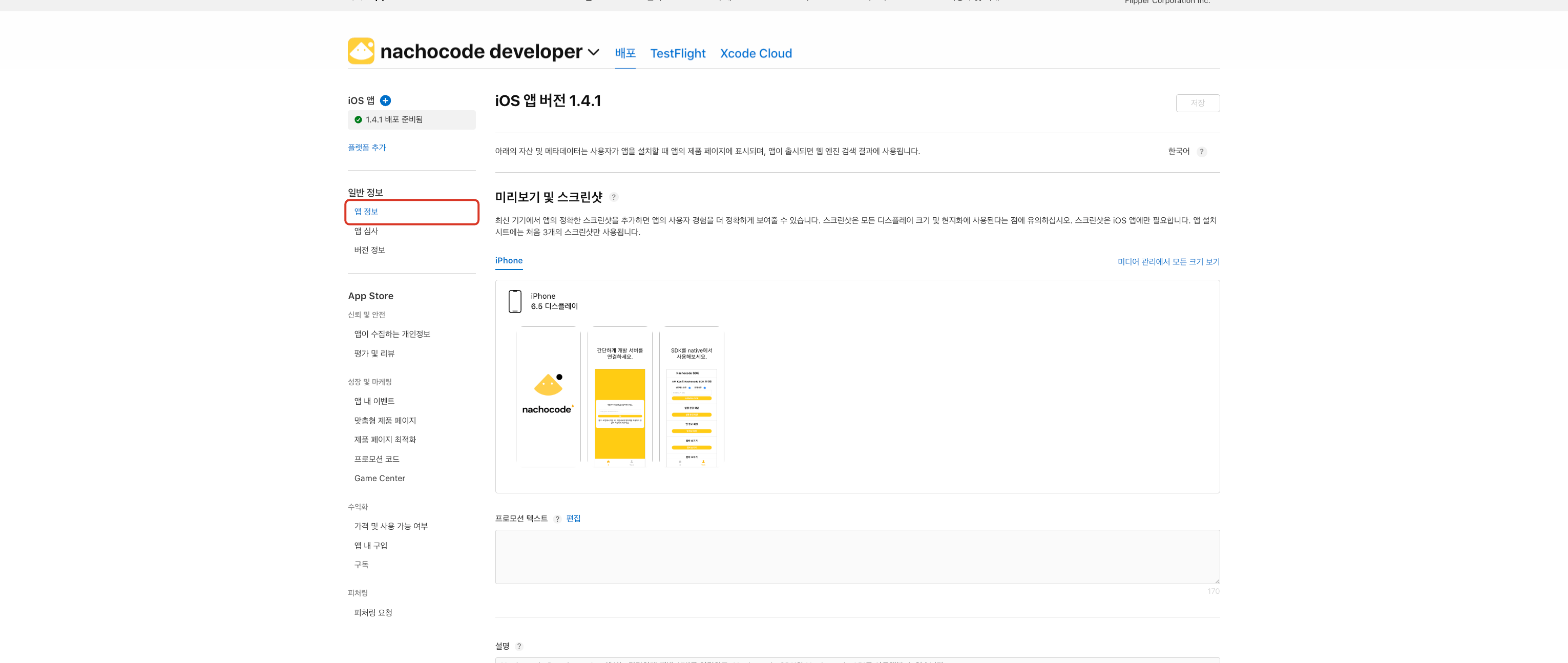 1단계) App Store Connect에 접속 후, [앱] 버튼 클릭 → 나쵸코드에서 빌드한 앱 선택