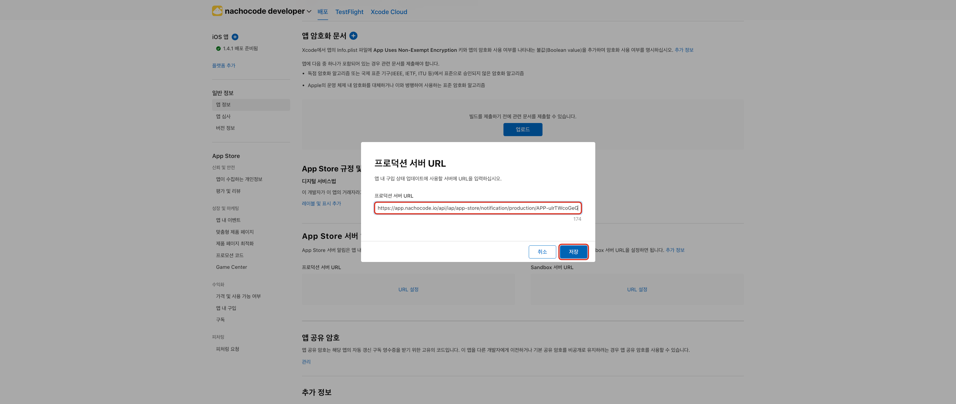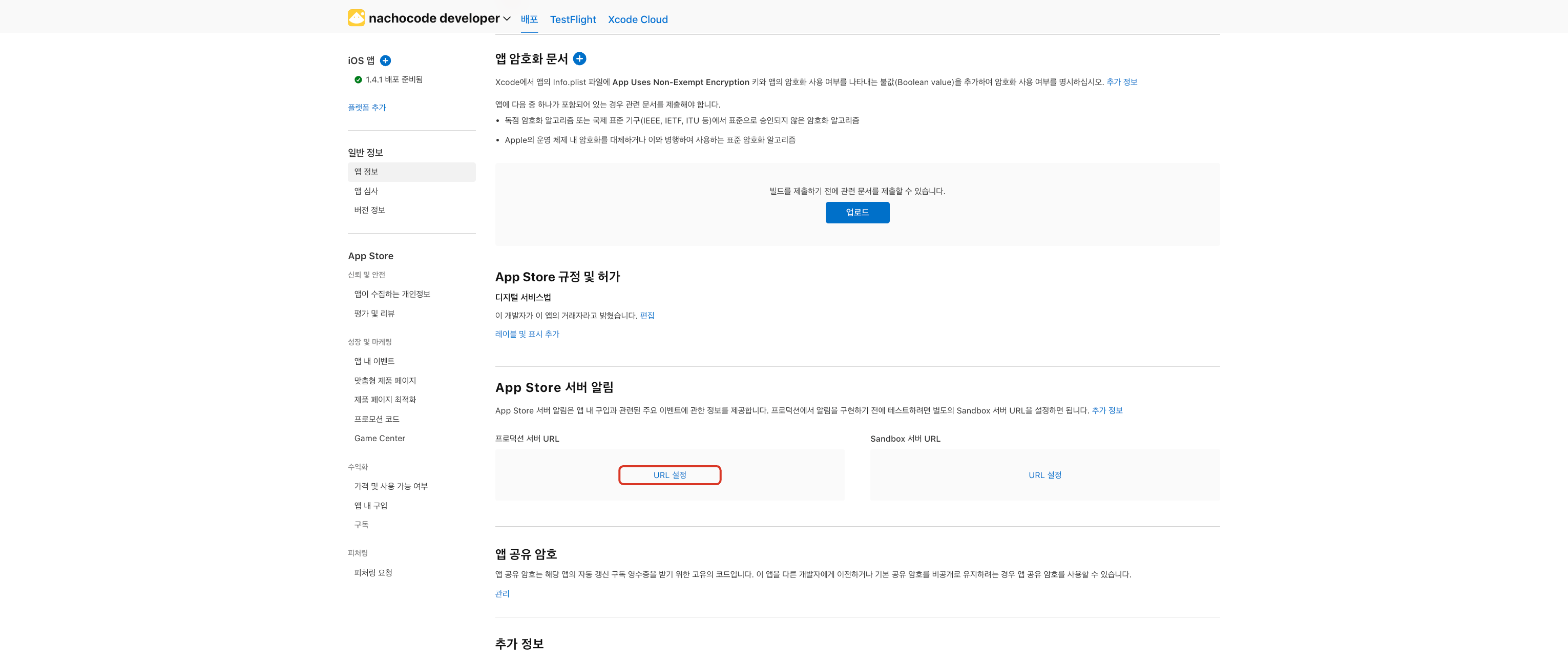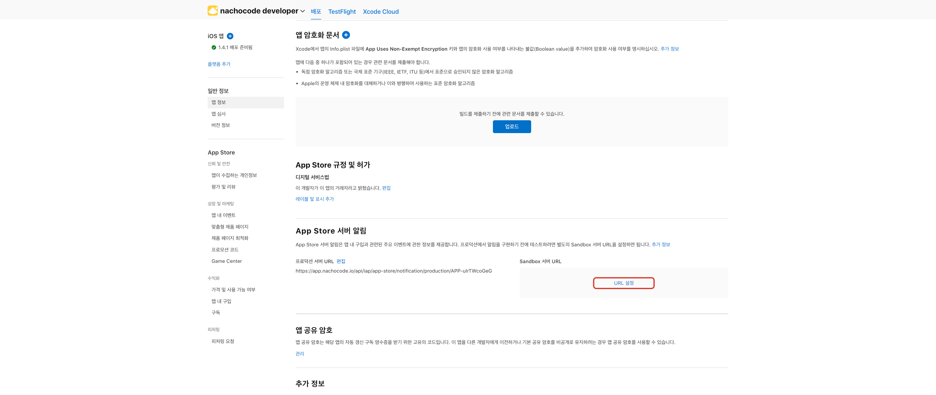 3단계) AppStore 서버 알림에 프로덕션 서버 URL의 [URL 설정] 클릭