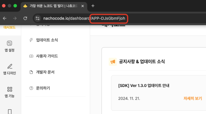 4단계) 새로운 창을 열어 나쵸코드 홈페이지 → 인앱 결제를 사용할 앱 대시보드 접속 → 접속한 URL의 앱 키 확인