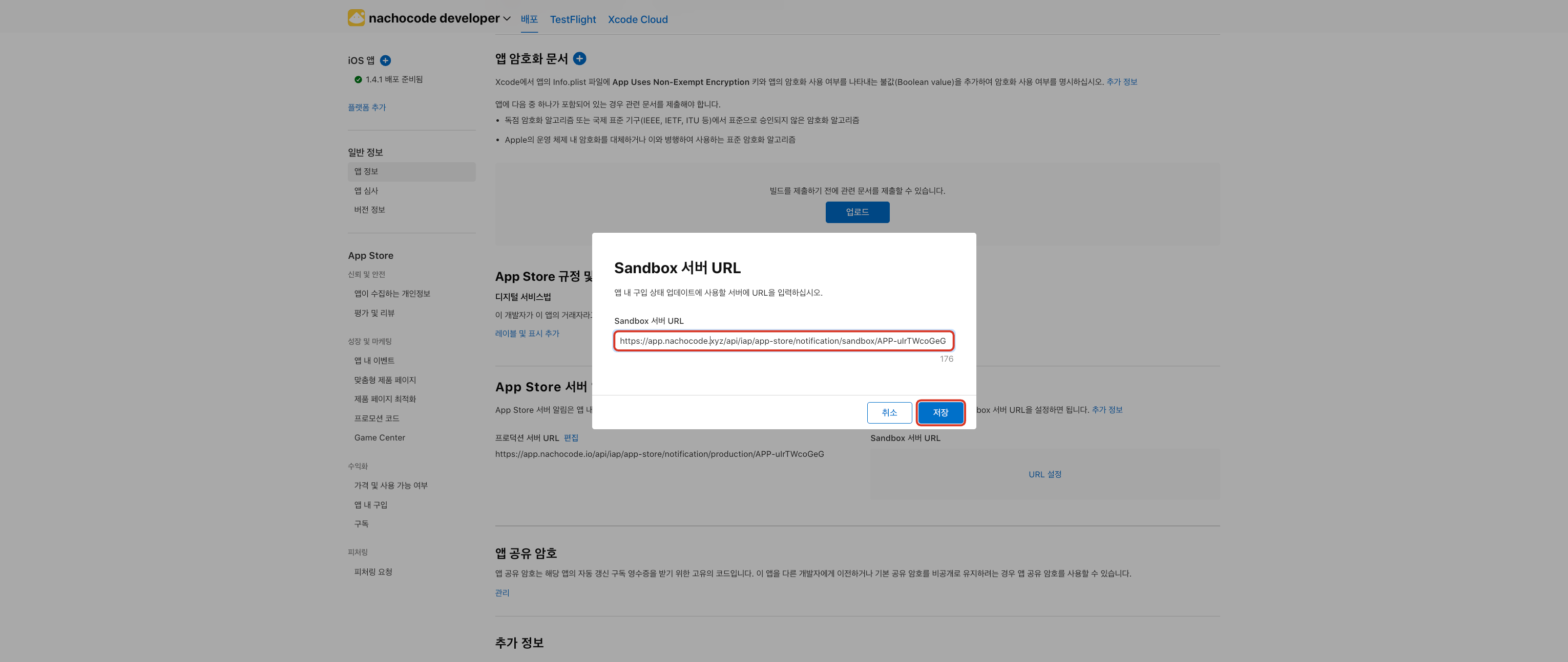 6단계) AppStore 서버 알림에 Sandbox 서버 URL의 [URL 설정] 클릭