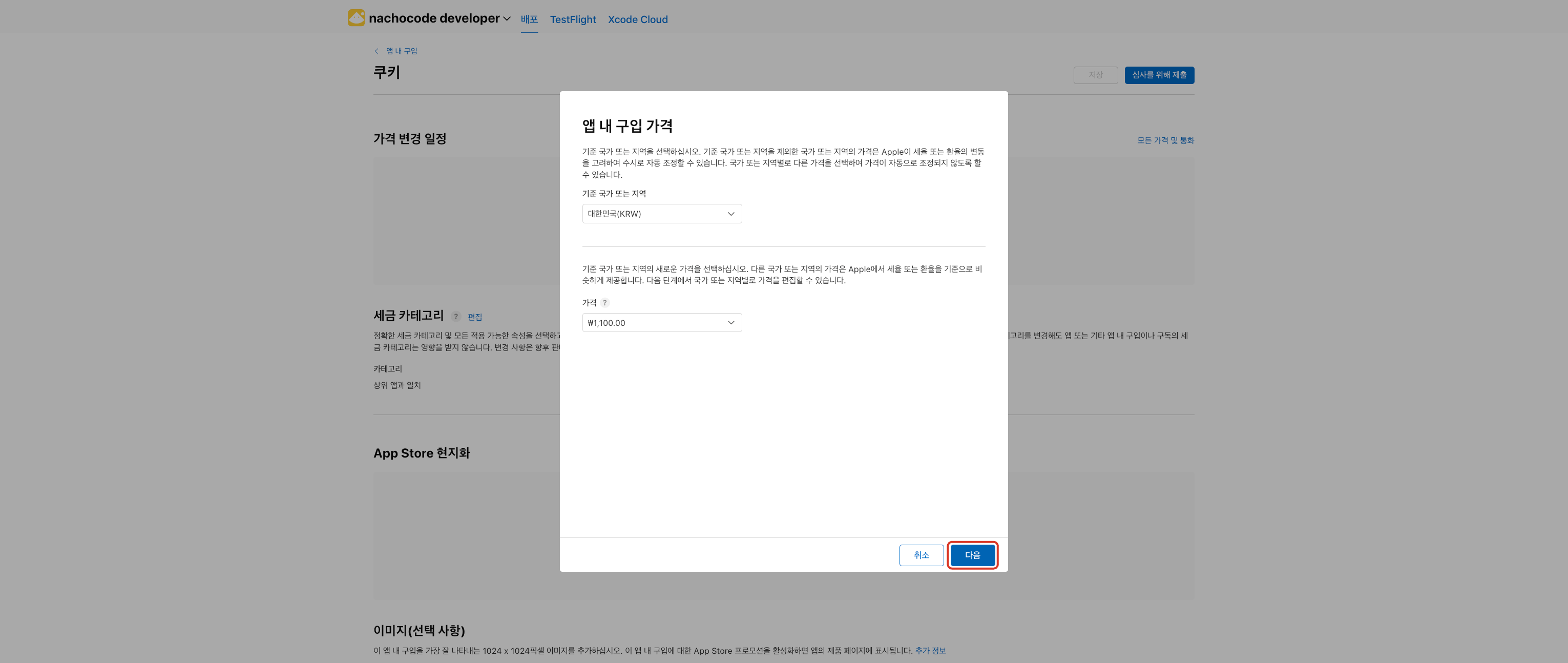 4단계) 인앱 상품의 기준 가격이 될 국가와 가격 입력 후 [다음] 버튼 클릭