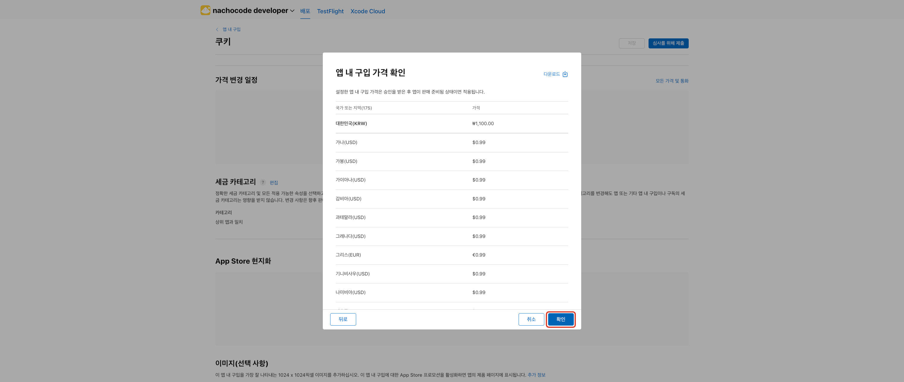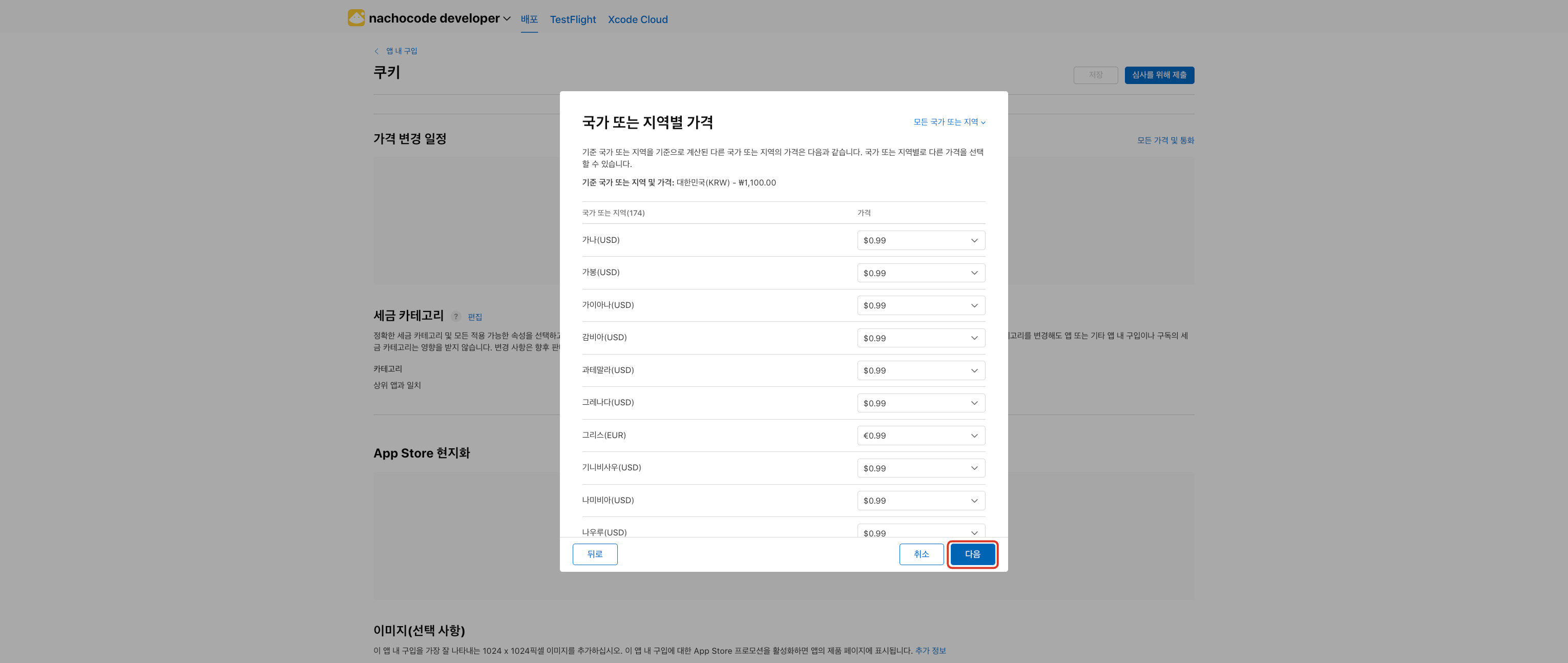 5단계) 국가별 가격 설정 후 [다음] 버튼 클릭
