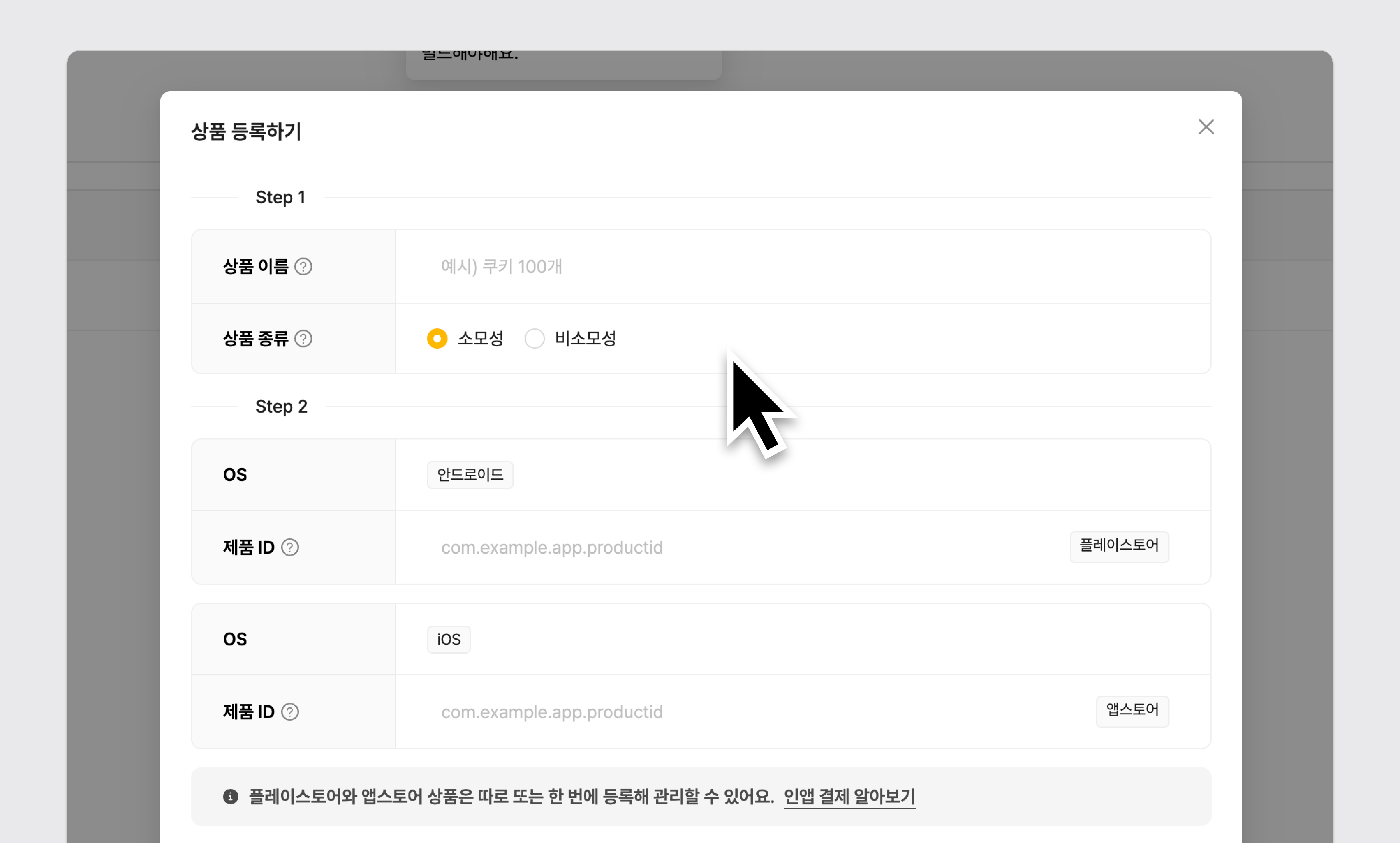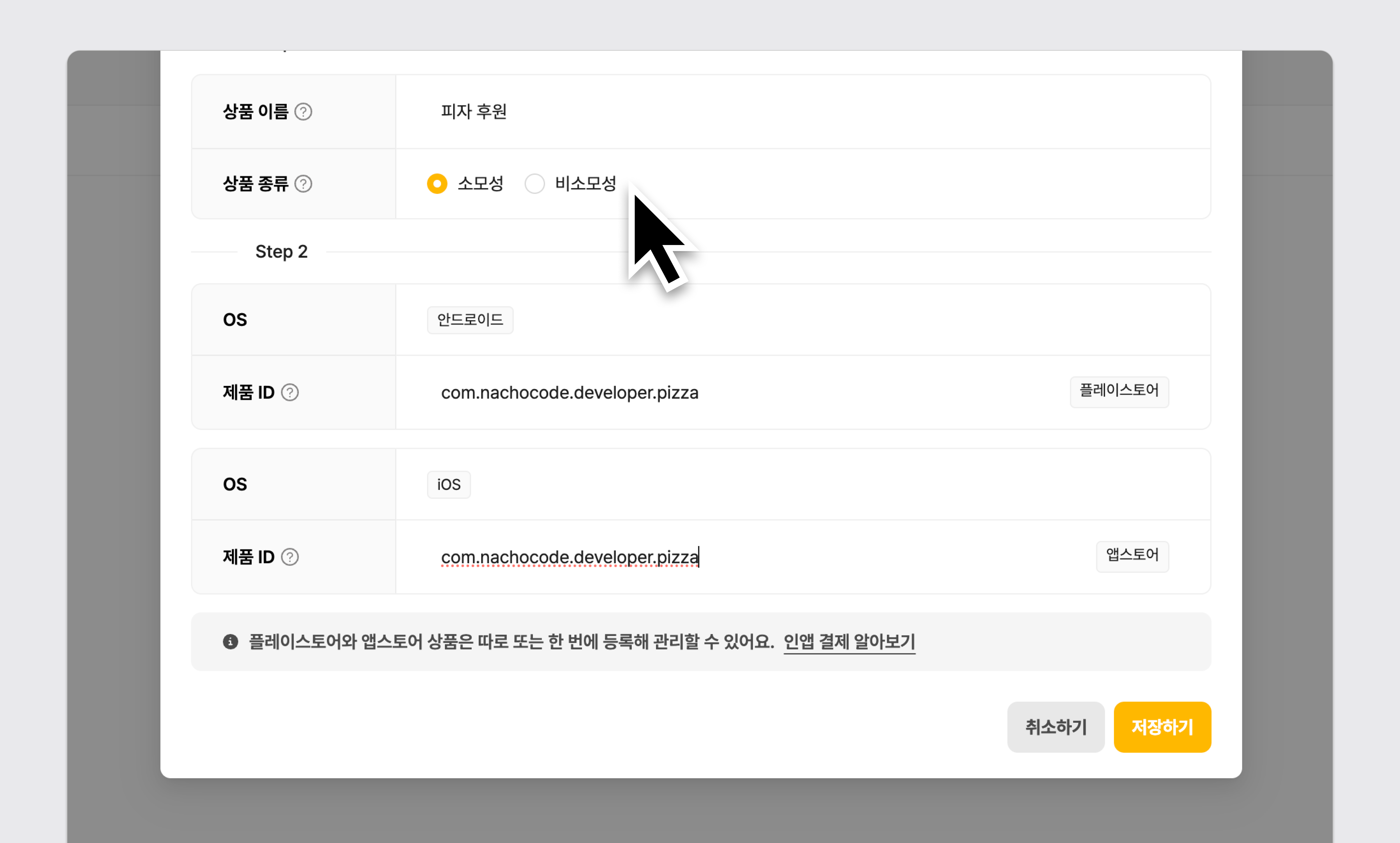 스토어에 등록된 상품의 종류(소모성/비소모성)를 확인하고 동일하게 선택하세요.