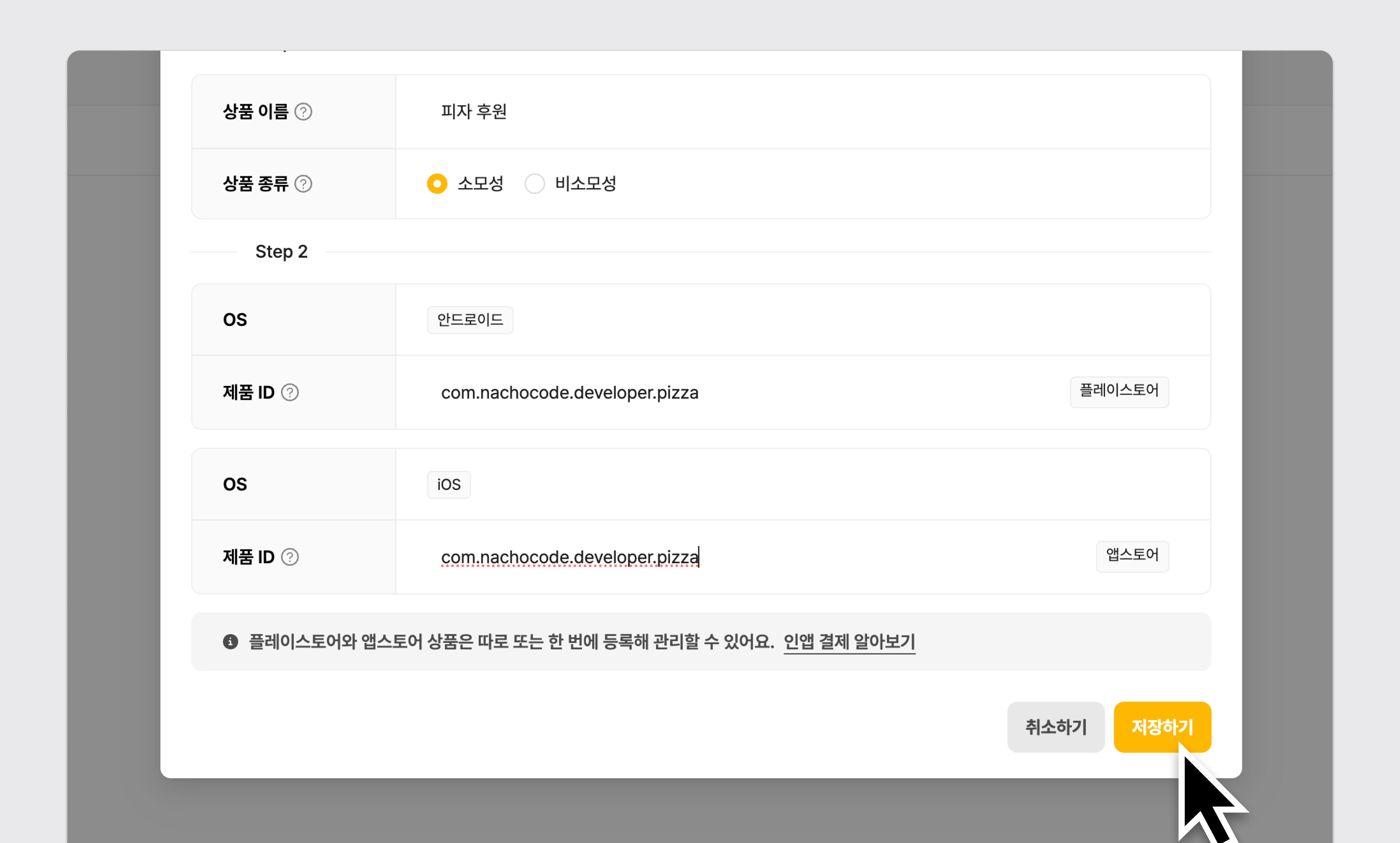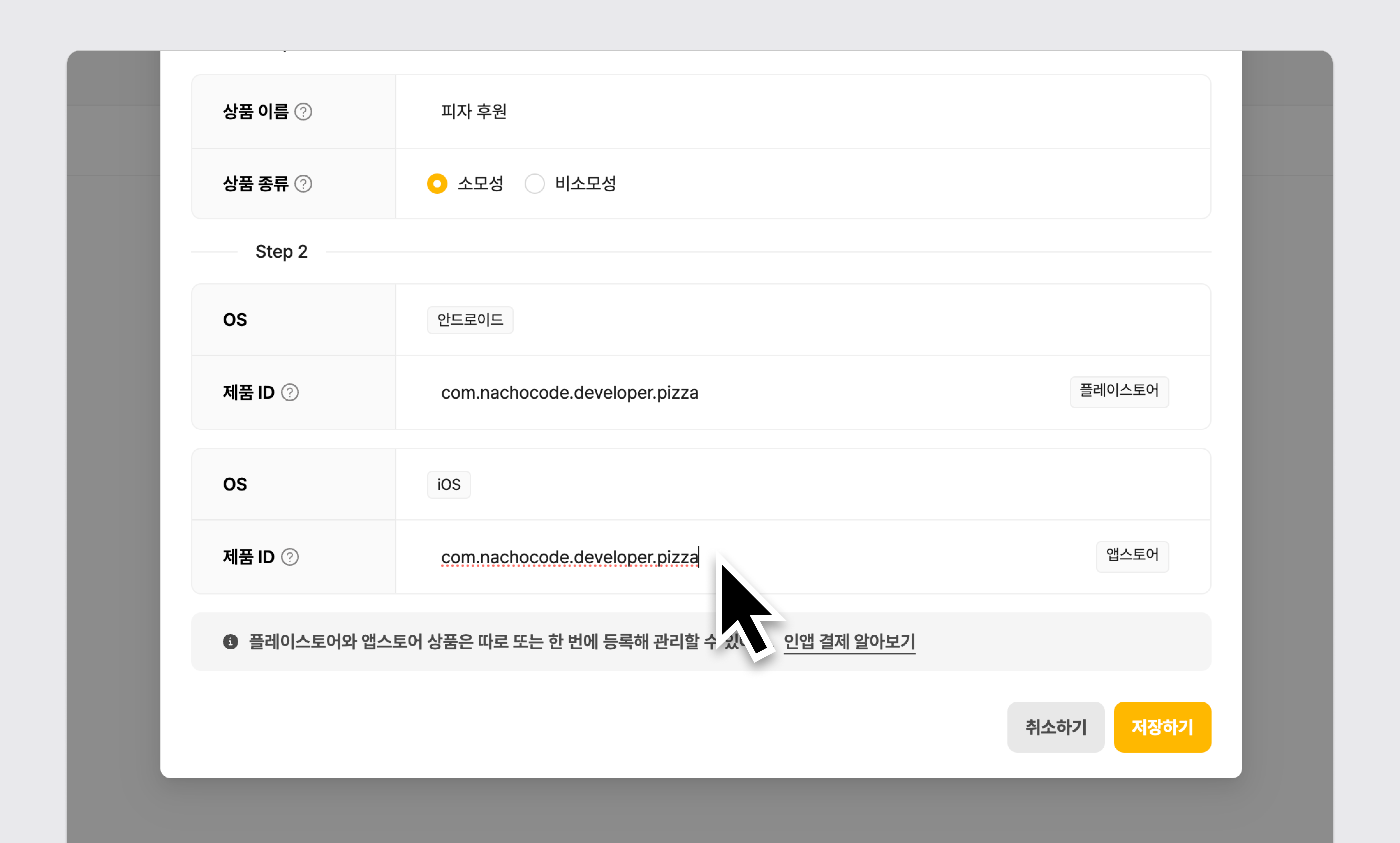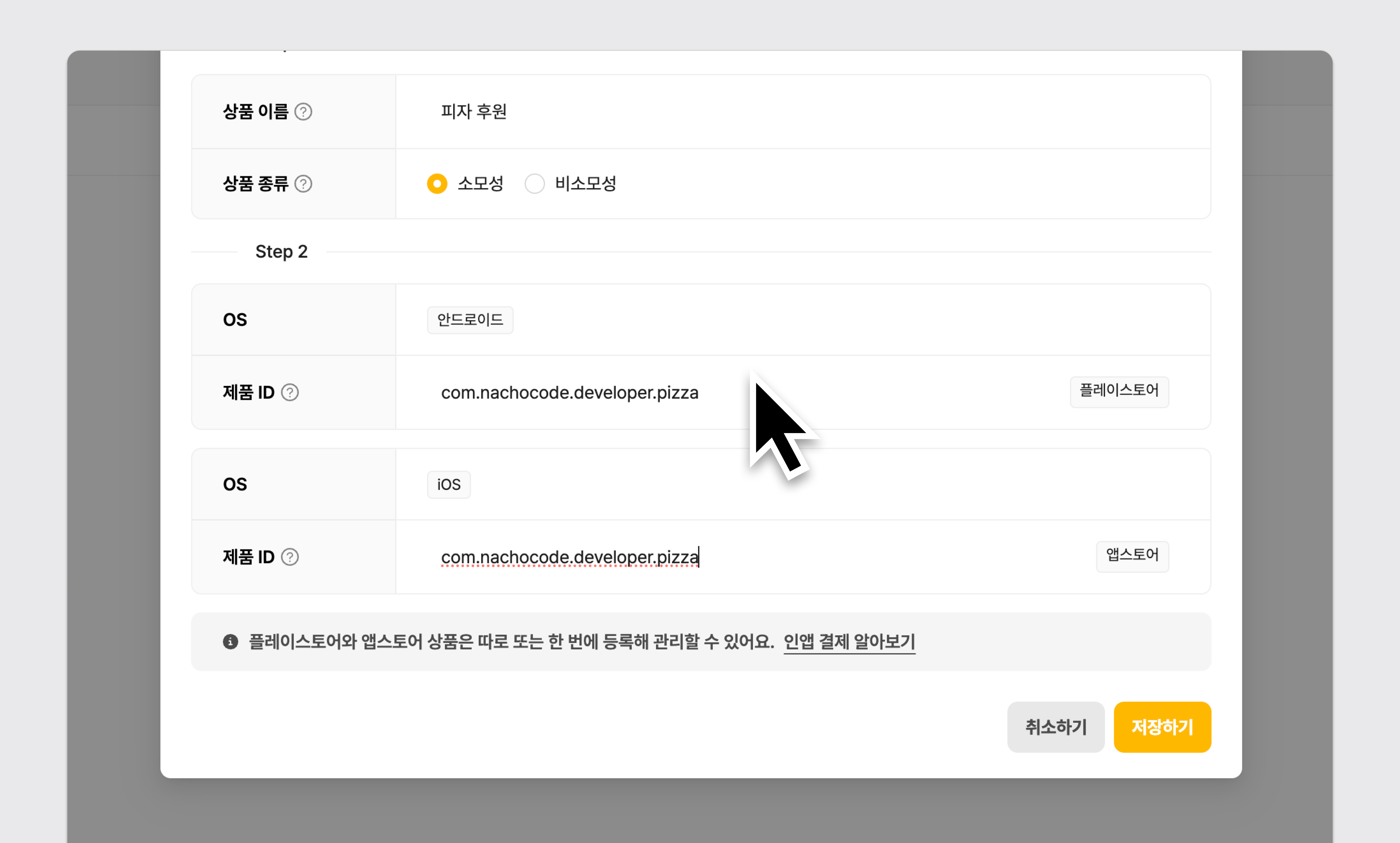 플레이스토어에 등록되어있는 인앱 결제 상품의 제품 ID를 정확히 입력해주세요.