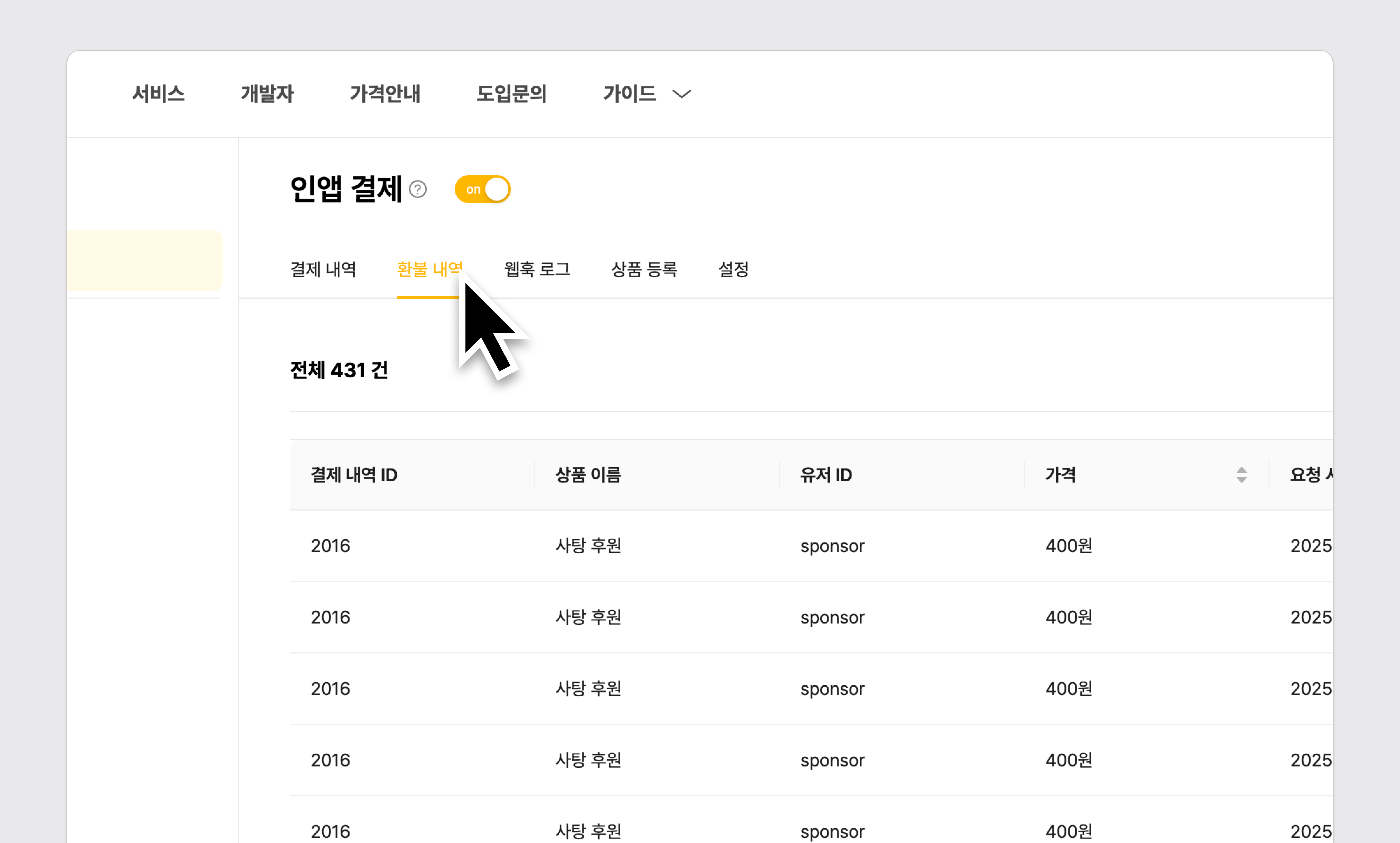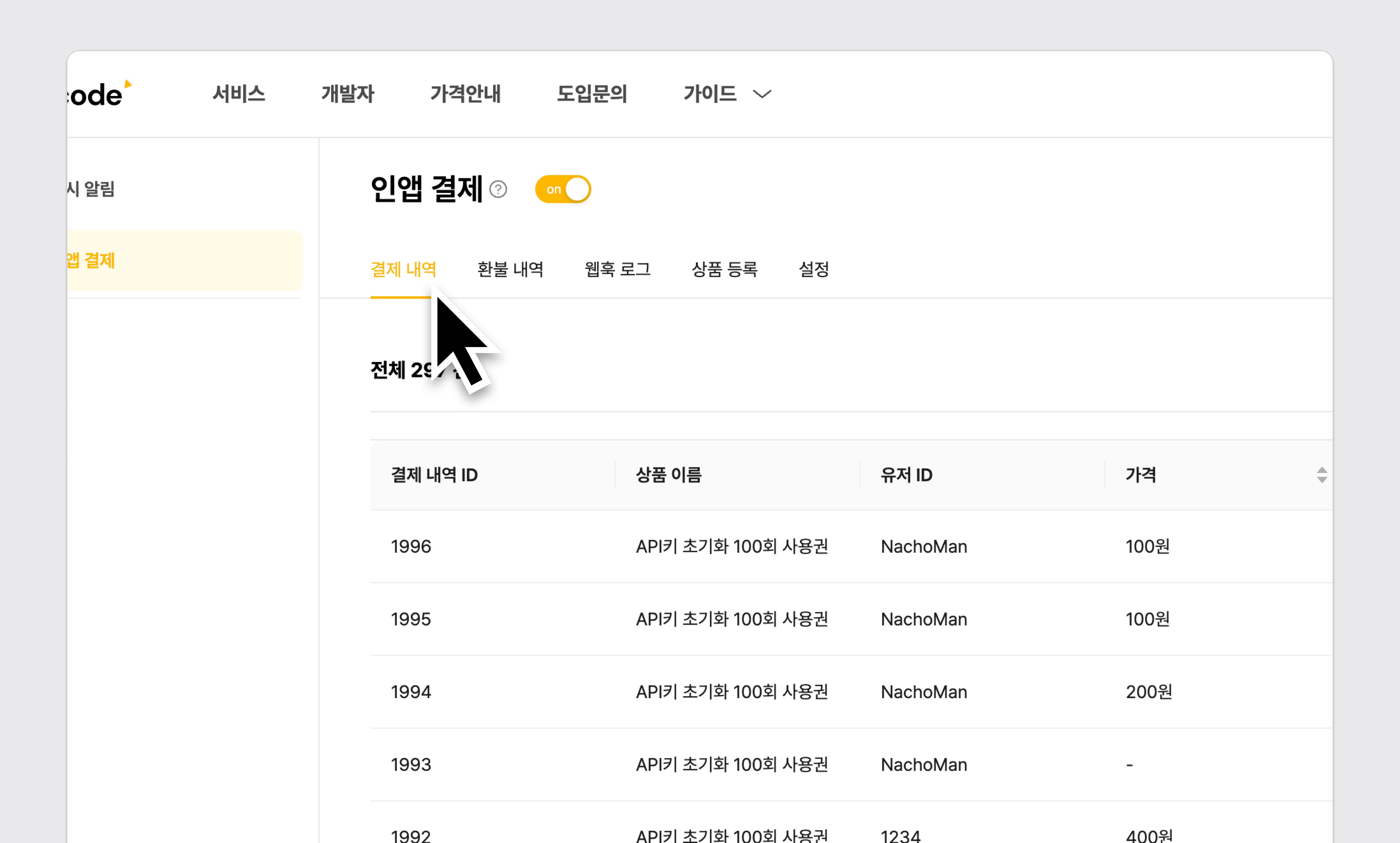 1단계) 앱 기능 > 인앱 결제 > [결제 내역] 탭 클릭