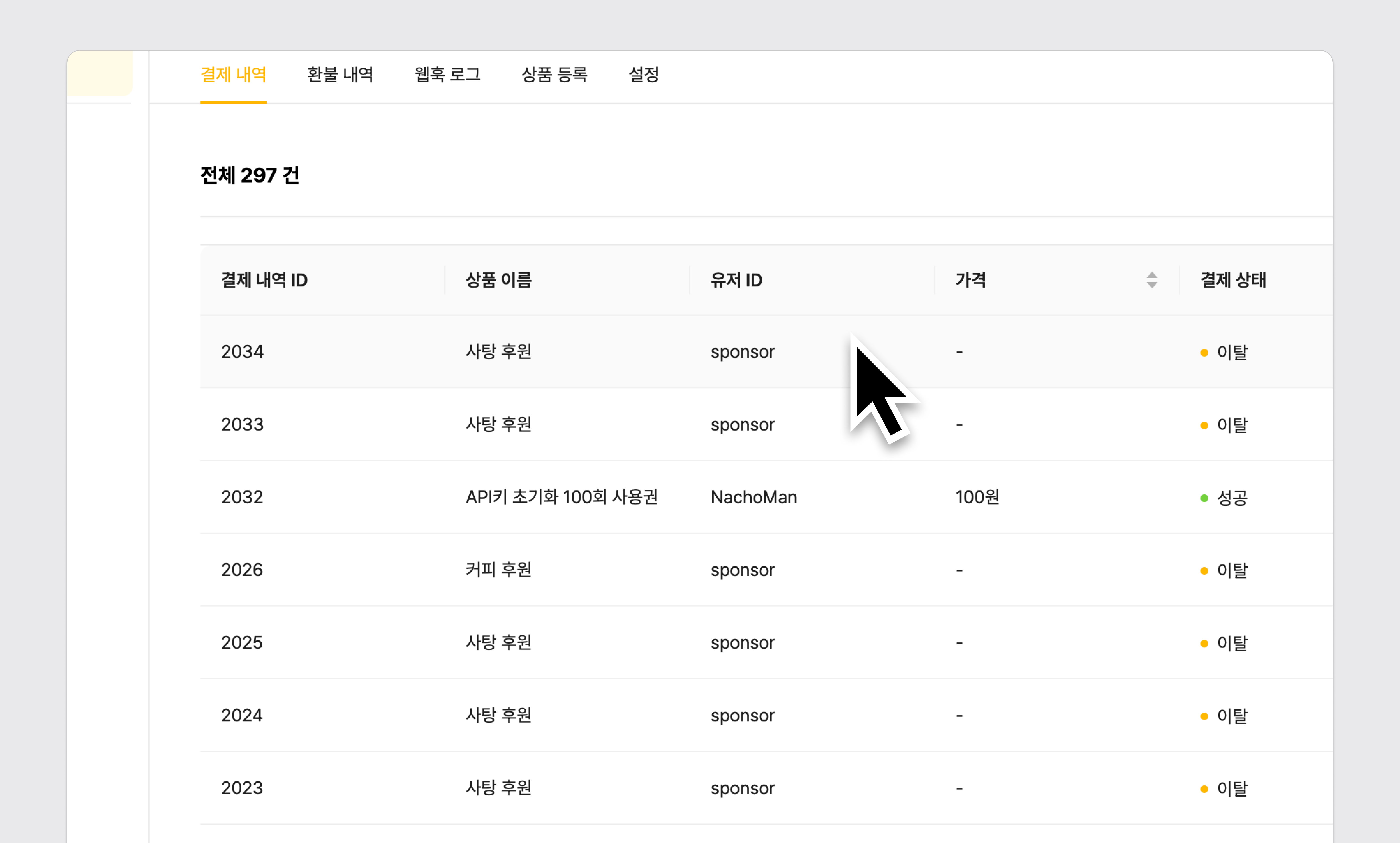 성공한 결제 내역은 상세 내용과 전송된 웹훅을 확인할 수 있습니다.