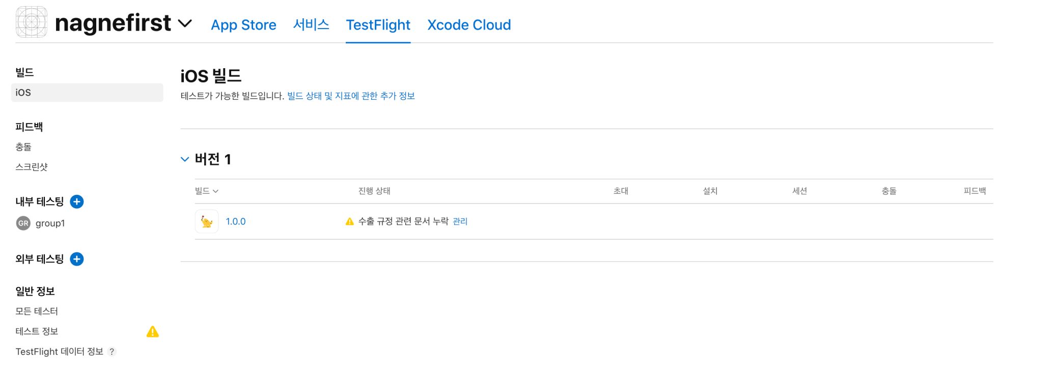 1. "TestFlight"에 앱 등록이 완료되면 진행 상태에서 수출 규정 관련 문서 누락 문구를 확인하실 수 있습니다.