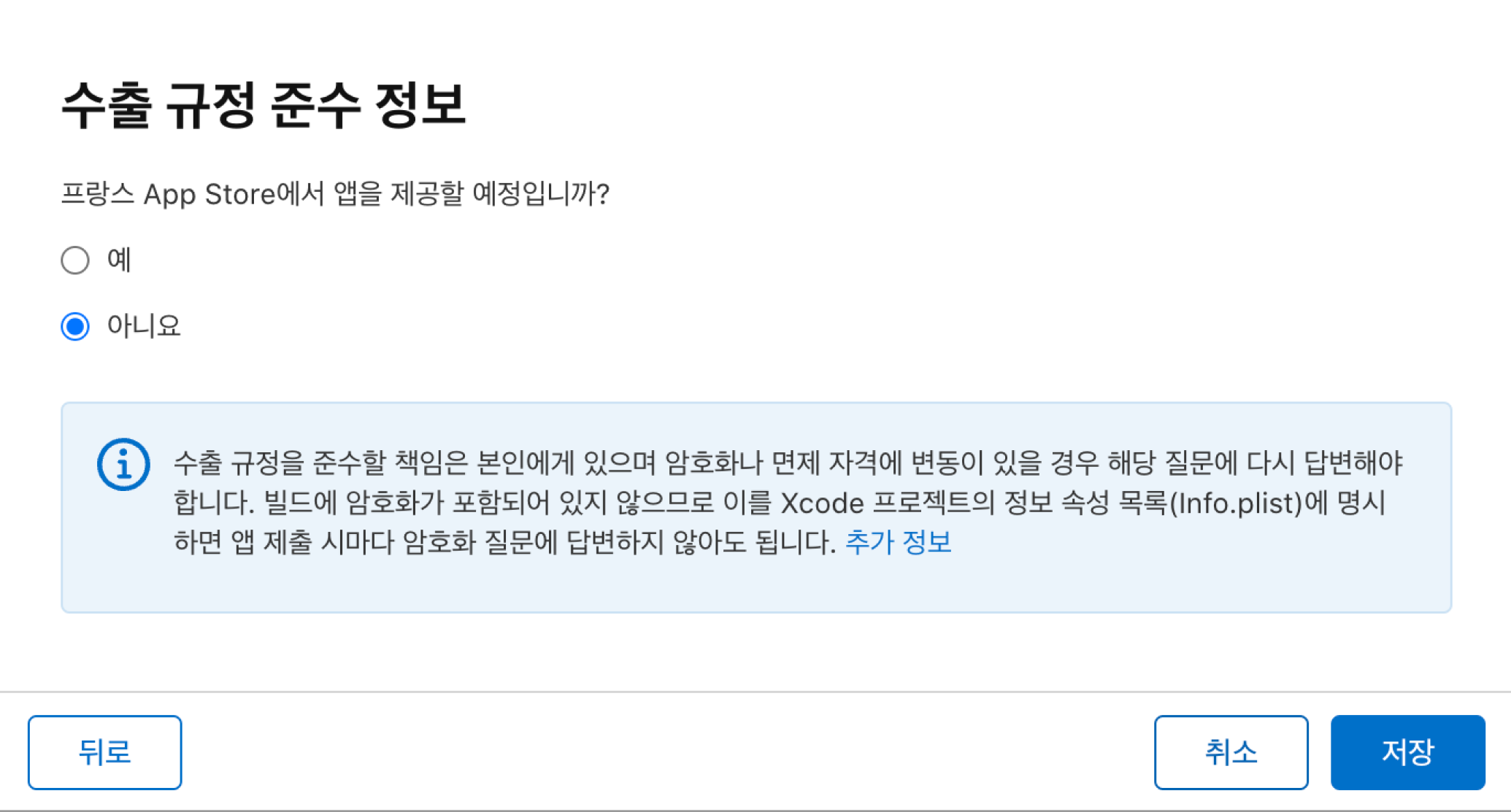 2. 프랑스 App Store에 대한 앱 제공 예정 여부를 선택해주세요. 없다면 아니요를 선택하고 저장을 누릅니다.