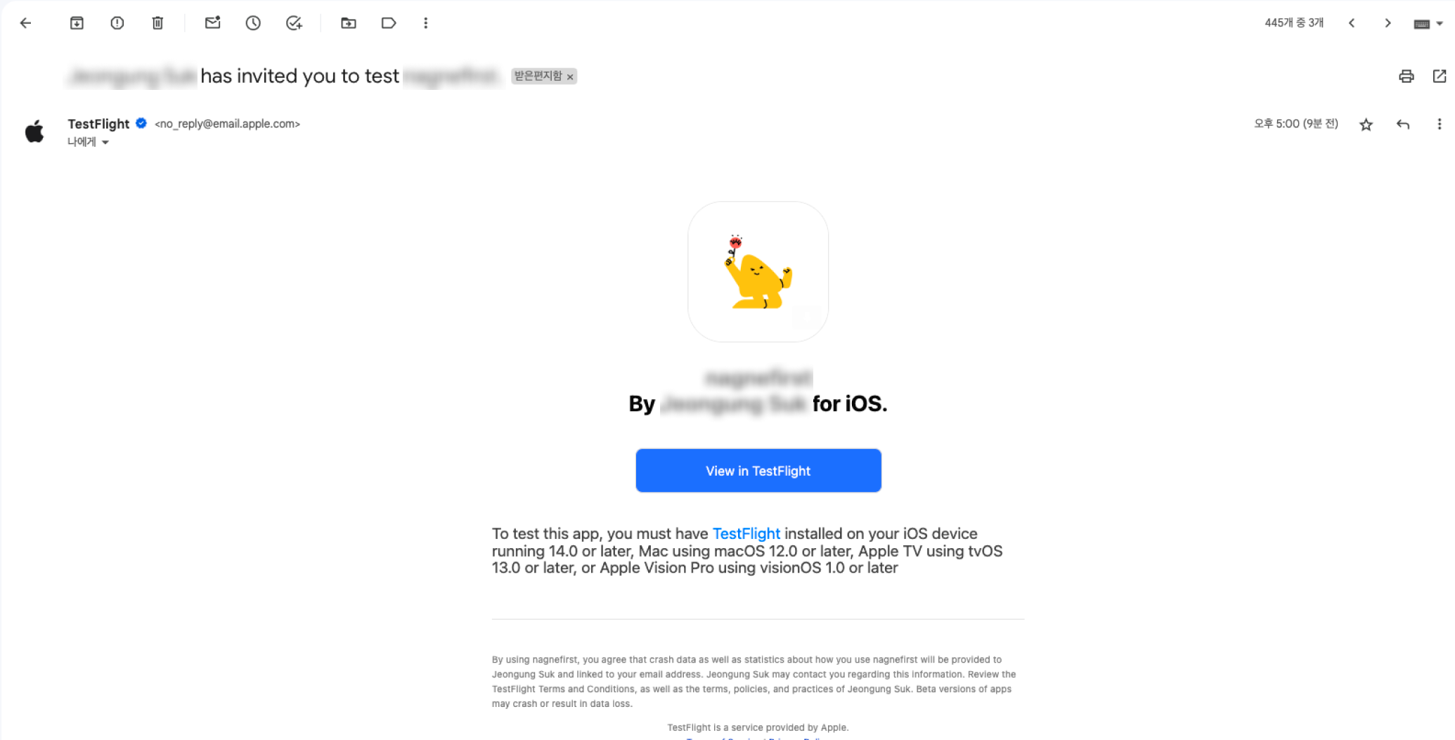 1. 테스터의 메일로 접속해 "TestFlight"에서 전송된 메일을 확인할 수 있습니다.