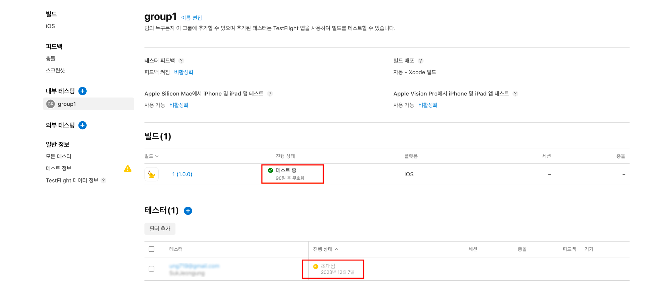 2. 심사가 끝나고 앱이 "TestFlight"에 등록이 완료된다면 진행 상태가 빨간 박스와 같이 테스트 중, 초대됨 이라고 표시됩니다. 이 상태라면 해당 테스터의 메일로 앱을 테스트할 수 있는 ipa 다운 링크가 전송된 것입니다.