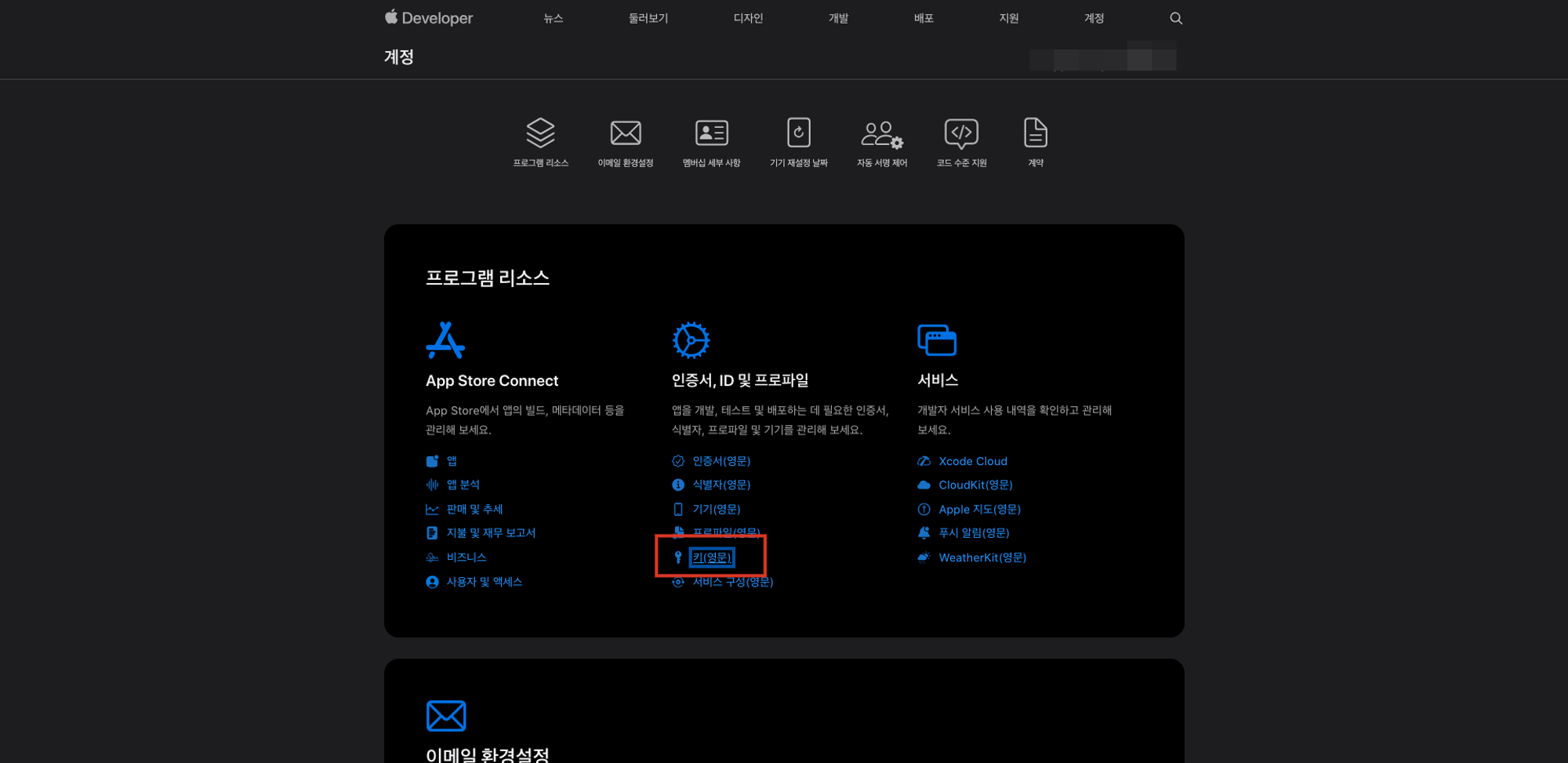 파일키 ID : developer.apple.com [계정 > 인증서, ID 및 프로파일 > 키(영문)]
