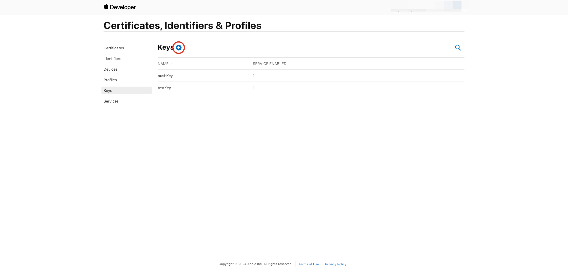 2단계) [프로그램 리소스 > 인증서, ID 및 프로파일 > 키(영문)]탭 클릭 → Certificates, Identifiers & Profiles > Keys로 이동