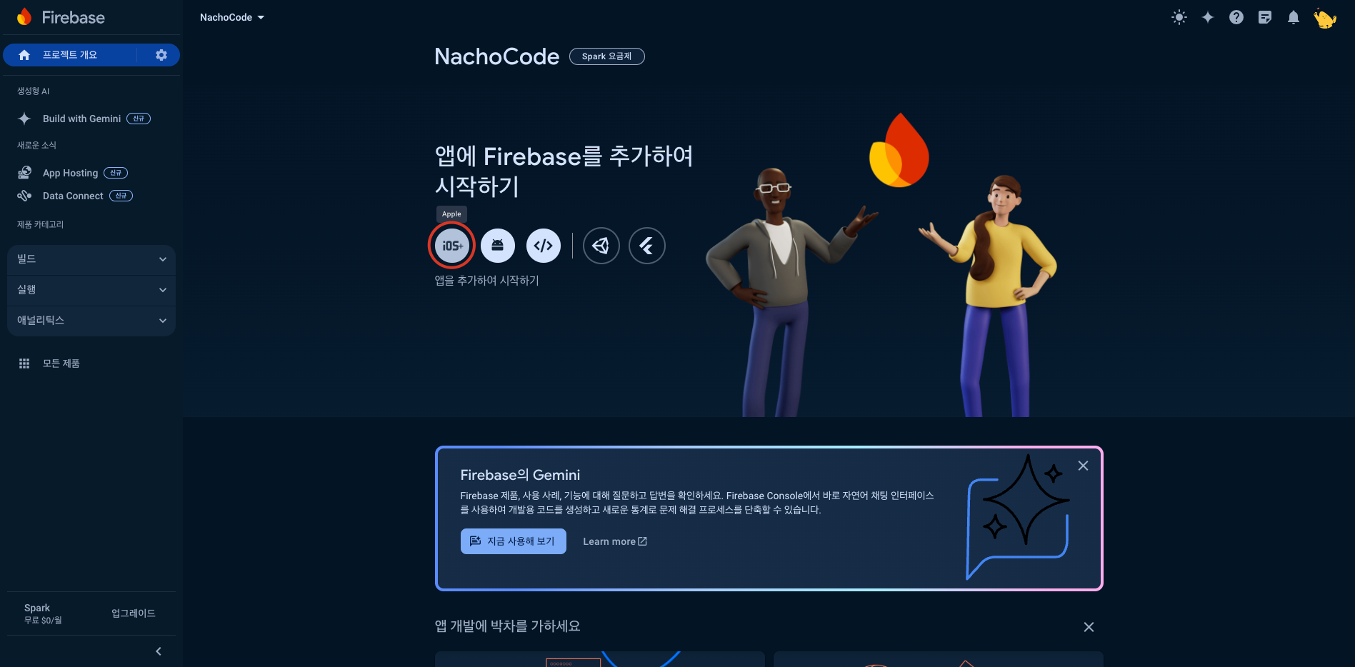 또는 이미 생성된 프로젝트가 있다면, [ + 앱추가 ] 버튼을 클릭 후 나타나는 [iOS+] 버튼 클릭