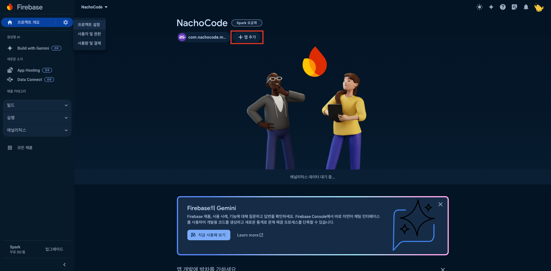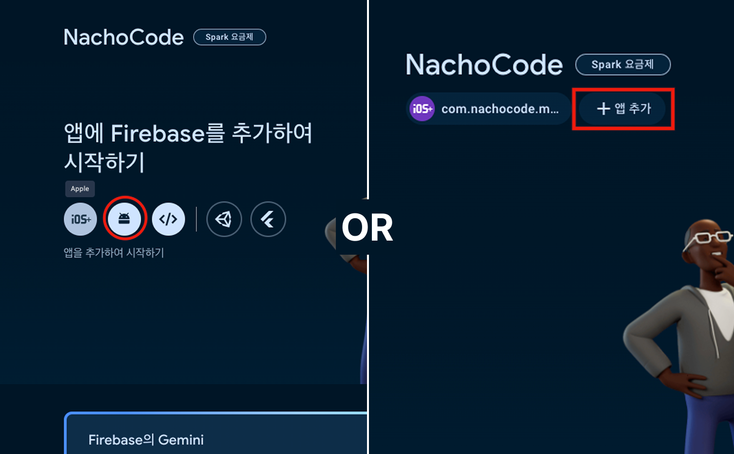 이미 생성된 프로젝트가 있다면, [ + 앱추가 ] 버튼 클릭 후 나타나는 [안드로이드 아이콘] 버튼 클릭해주세요.