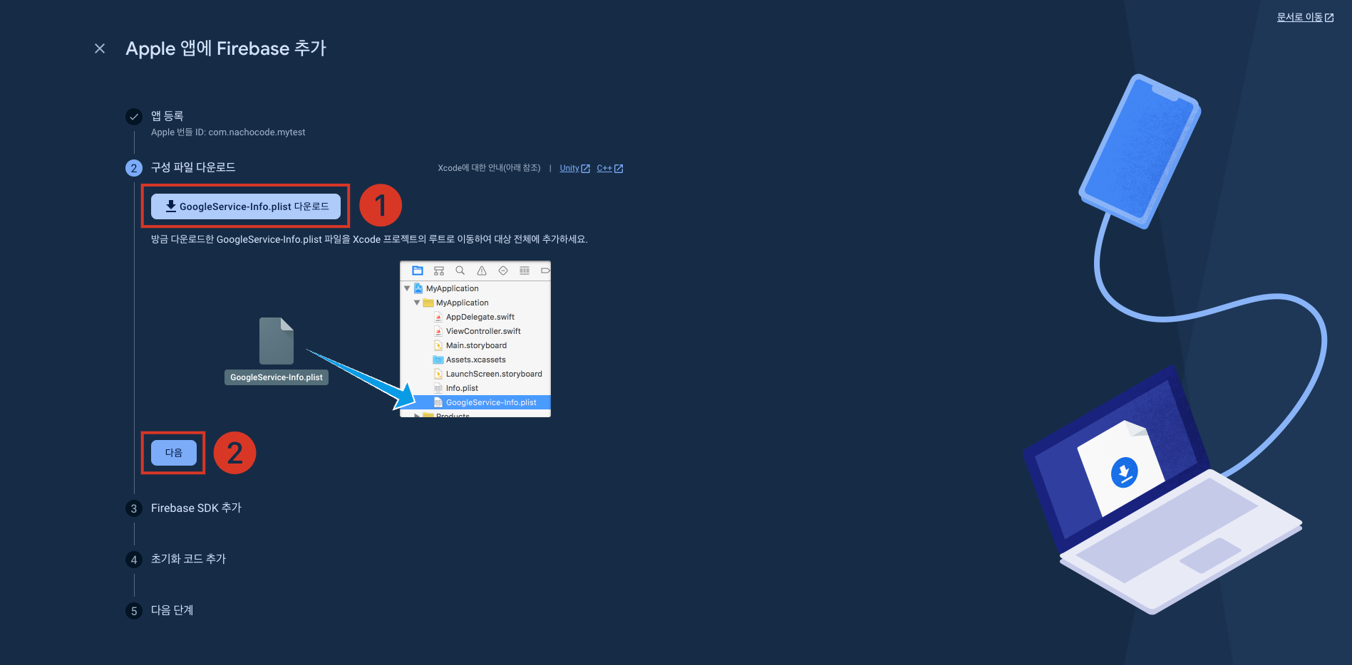 5단계) 구성 파일 다운로드에서 [GoogleService-Info.plist 다운로드] 버튼 클릭→ .json파일 다운로드 → [다음]버튼 클릭