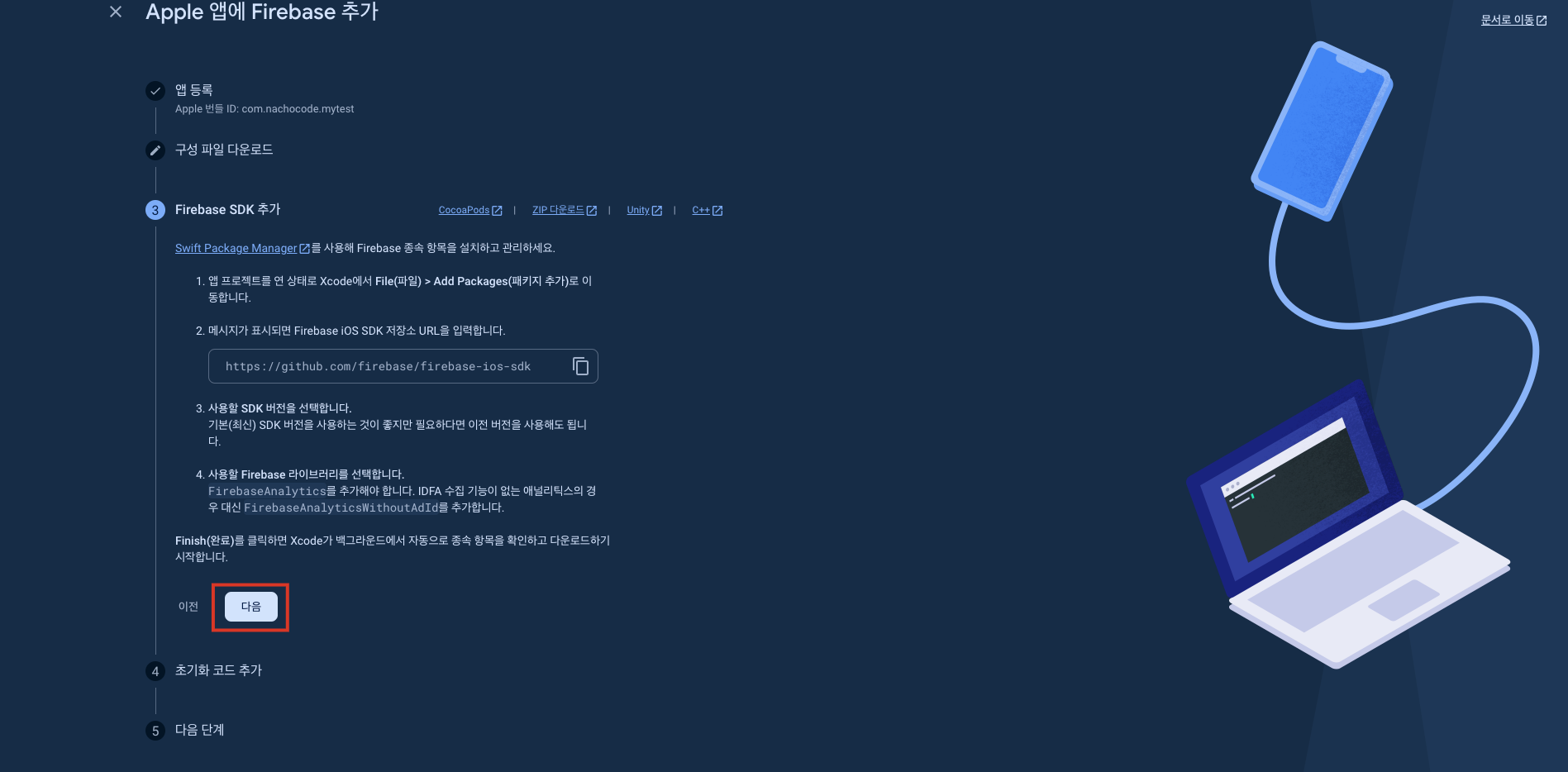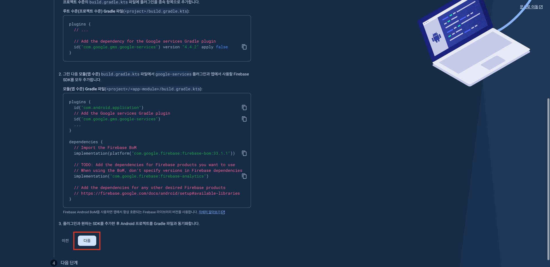 5단계) Firebase SDK 추가에서 [다음] 버튼 클릭