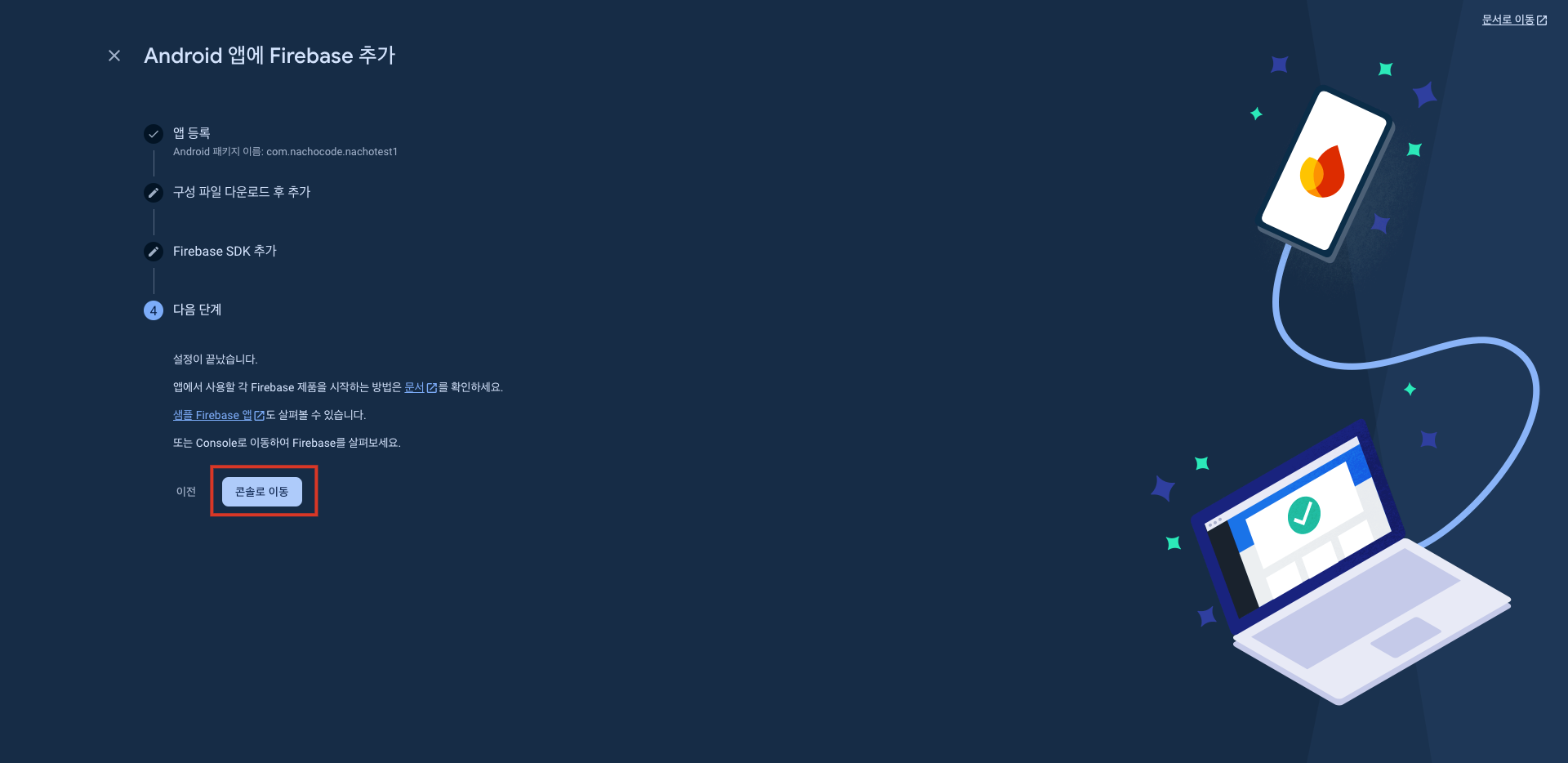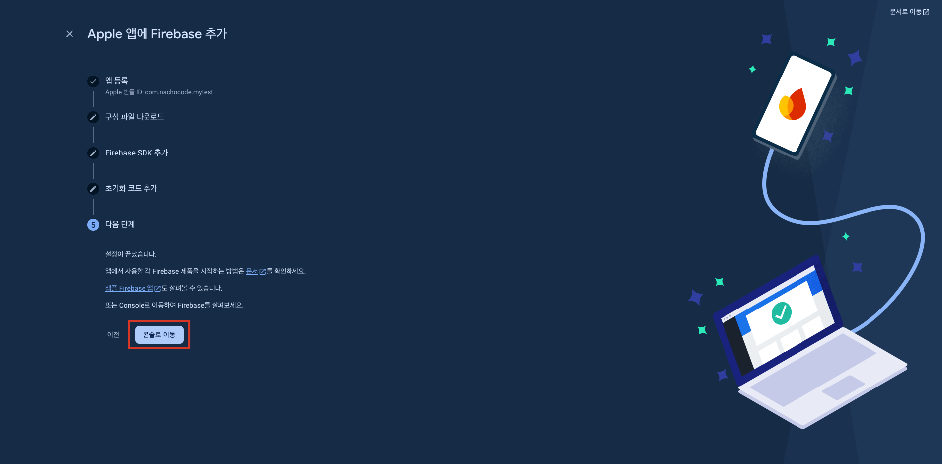 6단계) [콘솔로 이동] 버튼 클릭 → 앱 생성 완료 → 프로젝트 설정로 이동