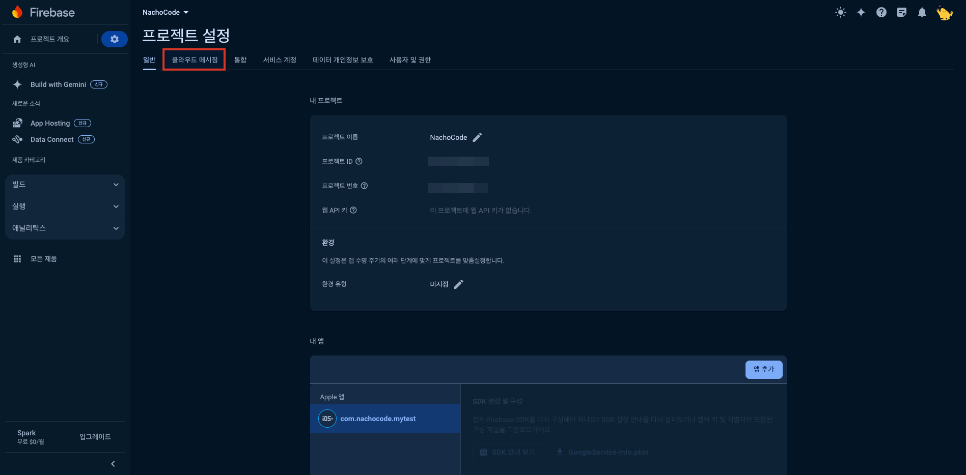 1단계) [클라우드 메시징] 탭 클릭 → APNs Key등록으로 이동