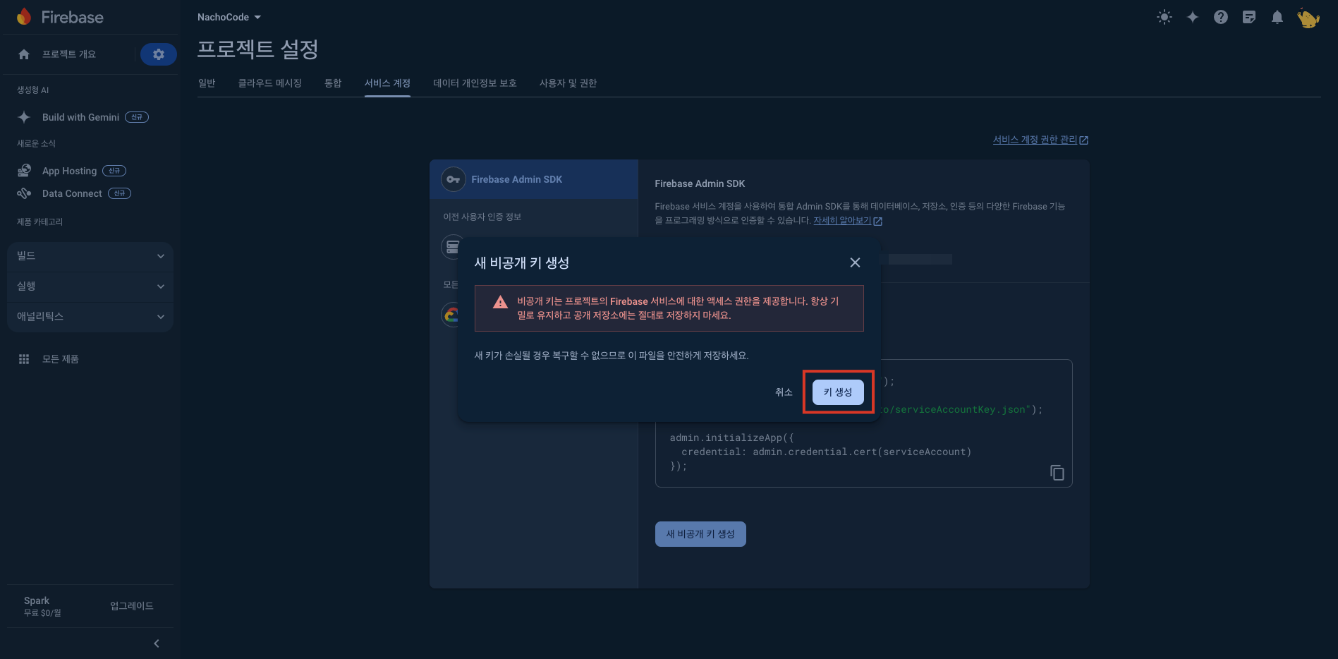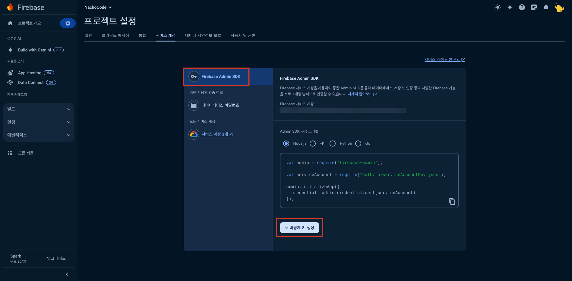 3단계) [Firebase Admin SDK] 탭에서 [새 비공개 키 생성] 버튼을 클릭