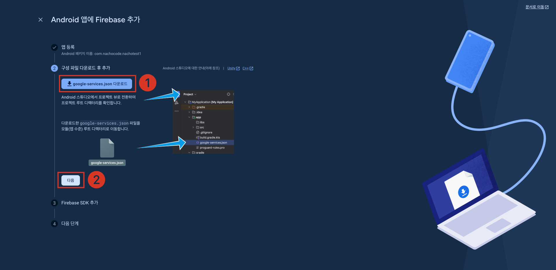 4단계) 구성 파일 다운로드에서 [google-services.json 다운로드] 버튼 클릭→ .json파일 다운로드 → [다음]버튼 클릭