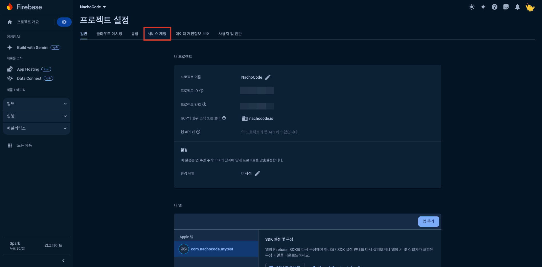 Firebase 프로젝트 생성과 서비스 계정(비공개 키)는 안드로이드 / iOS 공통입니다.