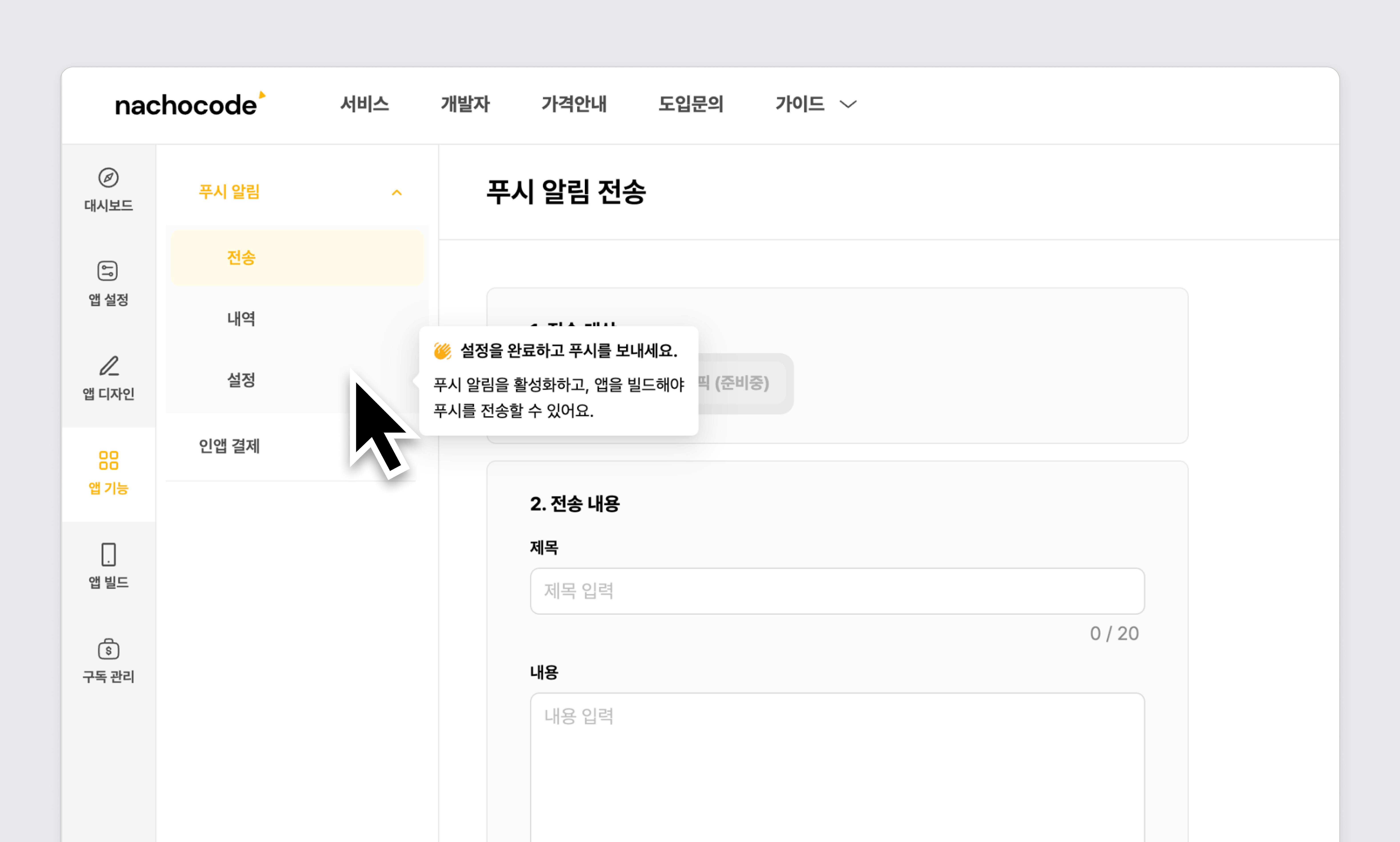 1단계) 앱 기능 > 푸시 알림 > 설정 클릭