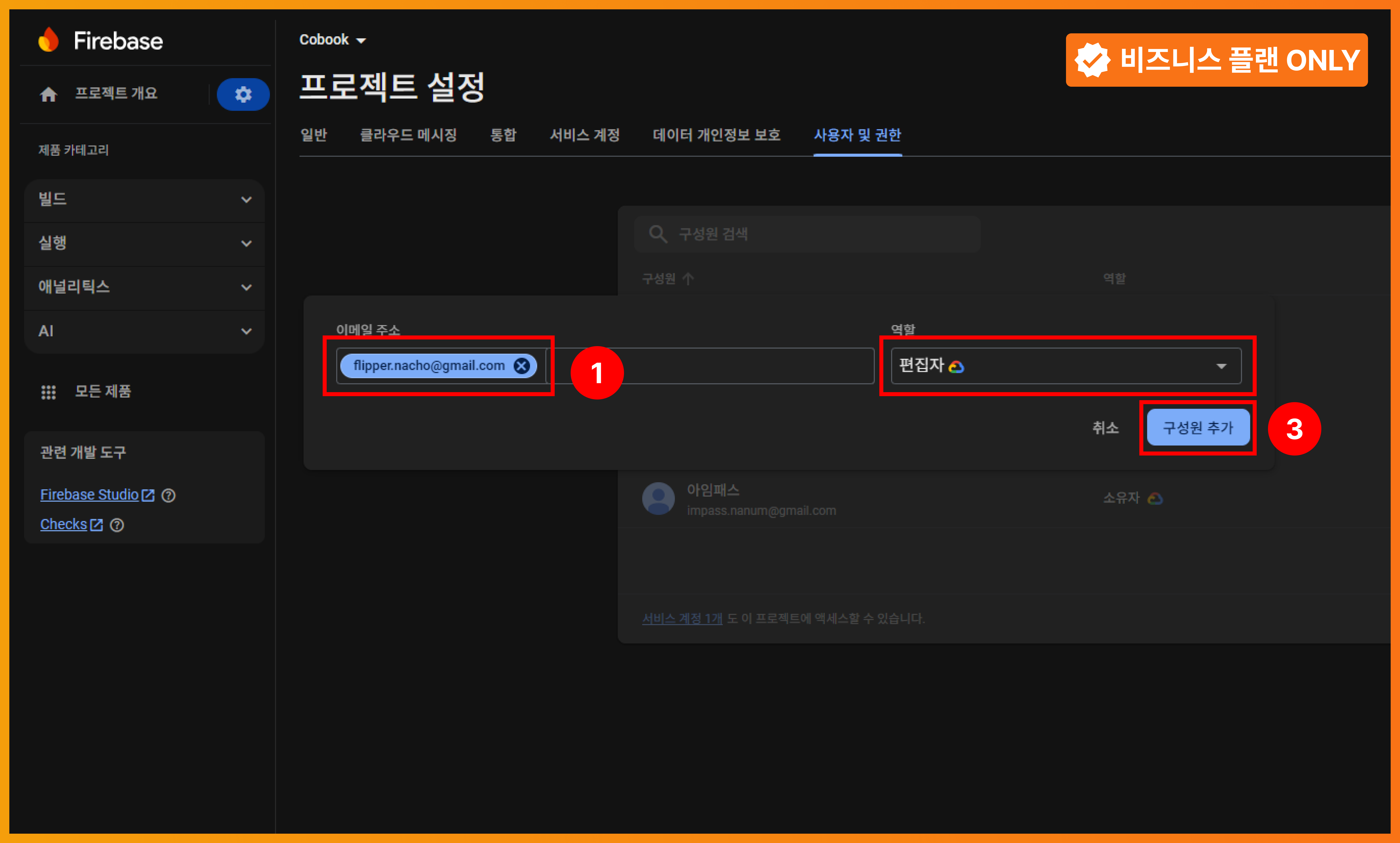 7단계) 비즈니스 플랜 ONLY 이메일 주소 입력 > 권한 [편집자] 선택 > [구성원 추가] 버튼 클릭