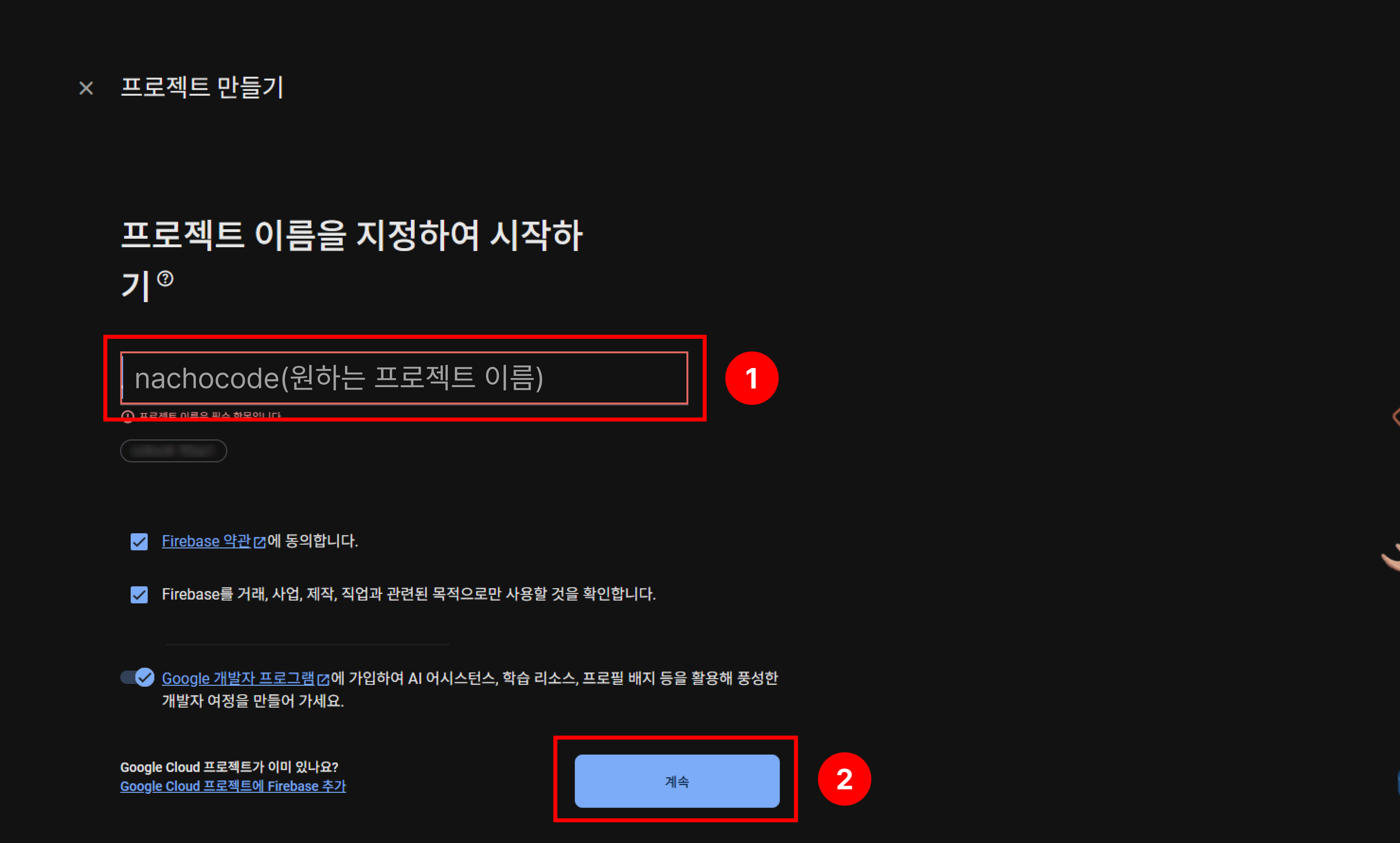 2단계) 프로젝트 이름 항목을 입력한 후 [계속] 버튼을 클릭